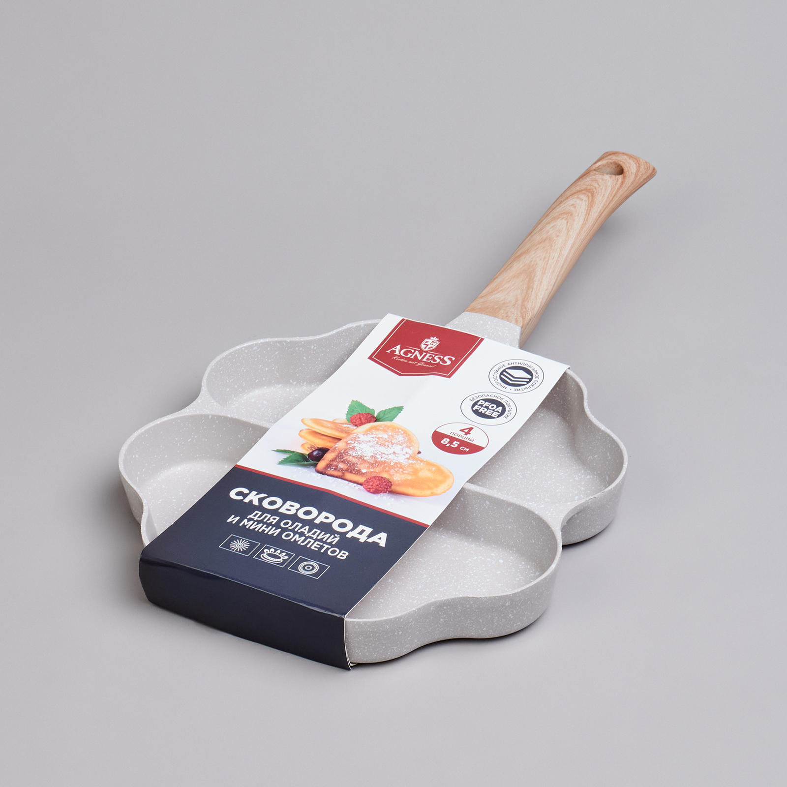 Сковороды AGNESS выполнены из литого алюминия. Такая посуда отличается высокой теплопроводностью и устойчивостью к деформациям. Необычный дизайн сковороды позволит приготовить интересные и веселые оладушки и омлеты.