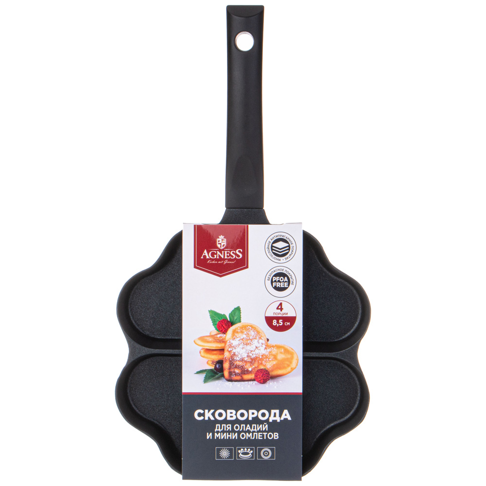 Сковороды AGNESS выполнены из литого алюминия. Такая посуда отличается высокой теплопроводностью и устойчивостью к деформациям. Необычный дизайн сковороды позволит приготовить интересные и веселые оладушки и омлеты.