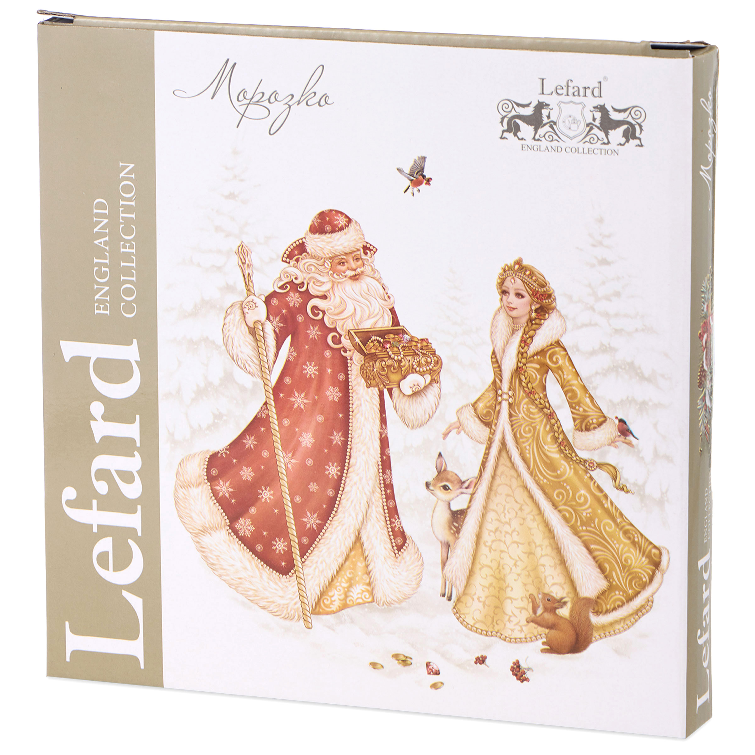 ТМ LEFARD эксклюзивная коллекция "Морозко" создана по мотивам любимой одноименной новогодней сказки, на которой выросли несколько поколений маленьких зрителей. Всем близка история доброй и красивой девушки Настеньки, которую злая мачеха отправила в лес на верную погибель. Детальные композиции, тонкие линии, высокое качество печати на тонкостенном белоснежном фарфоре превращает изделия в ожившие сюжеты. Разнообразие посуды и предметов сервировки добавят волшебства и красок в Ваш дом и порадует всех тех, кто сохранил в душе детскую радость и предвкушение чуда в самый ожидаемый праздник в году. Оригинальная упаковка. Прекрасный подарок. Вся продукция сертифицирована и безопасна для контакта с пищевыми продуктами. Можно использовать в СВЧ, не рекомендуется мыть в посудомоечных машинах во избежание повреждения золотой отводки (деколи) на изделиях.