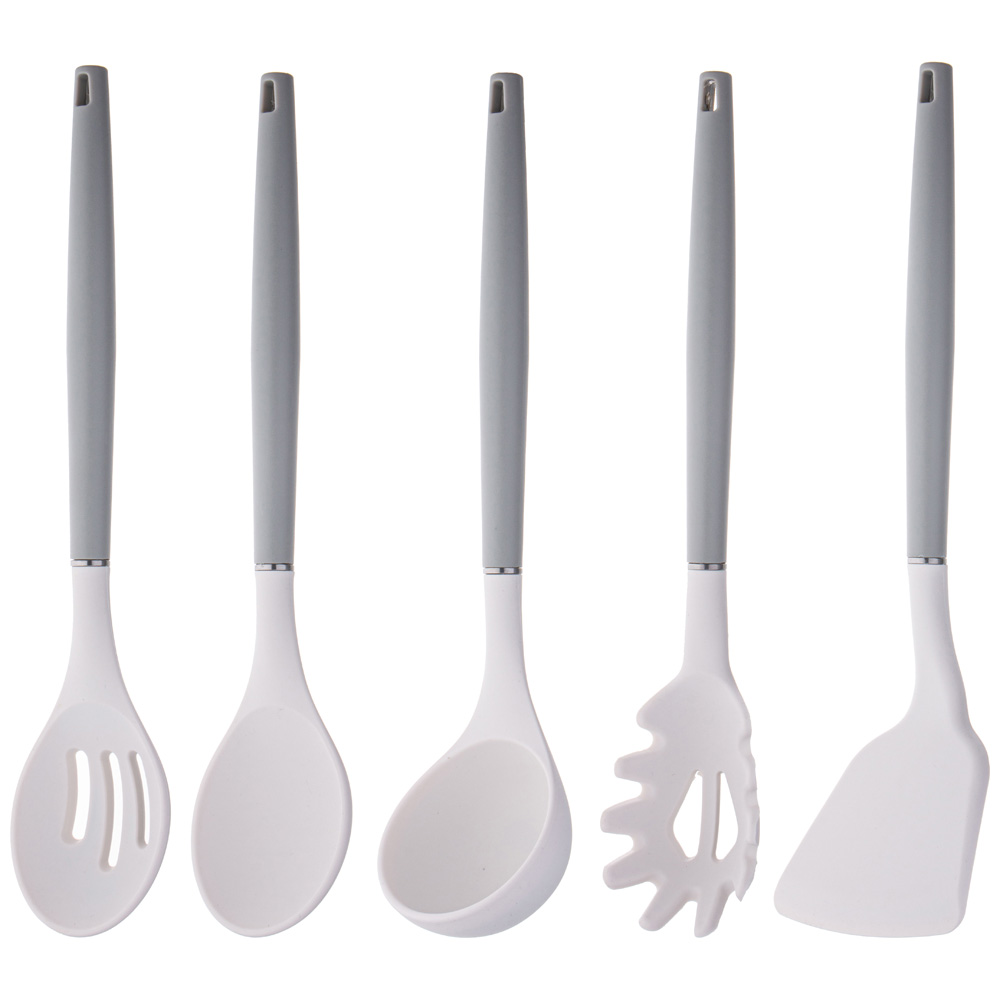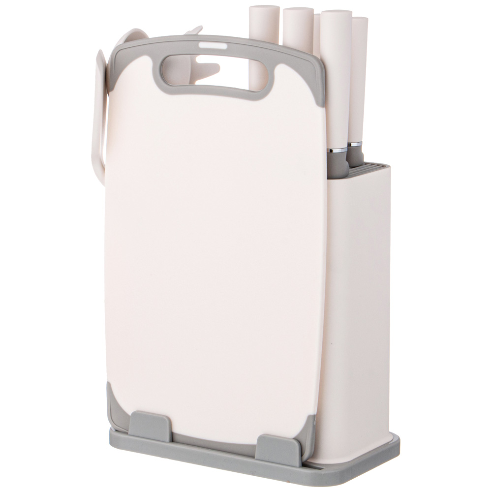 Состав набора: шеф-нож 19,5 см, нож для хлеба 20 см, универсальный нож 20 см, нож для овощей и фруктов 12,5 см, нож для очистки овощей 8,9 см, половник 31,5 см, шумовка 32,3 см, лопатка 32 см, ложка 32,3 см, ложка для спагетти 32 см, разделочная доска 32,8х20х0,6см, подставка 21,5х13,2х23см