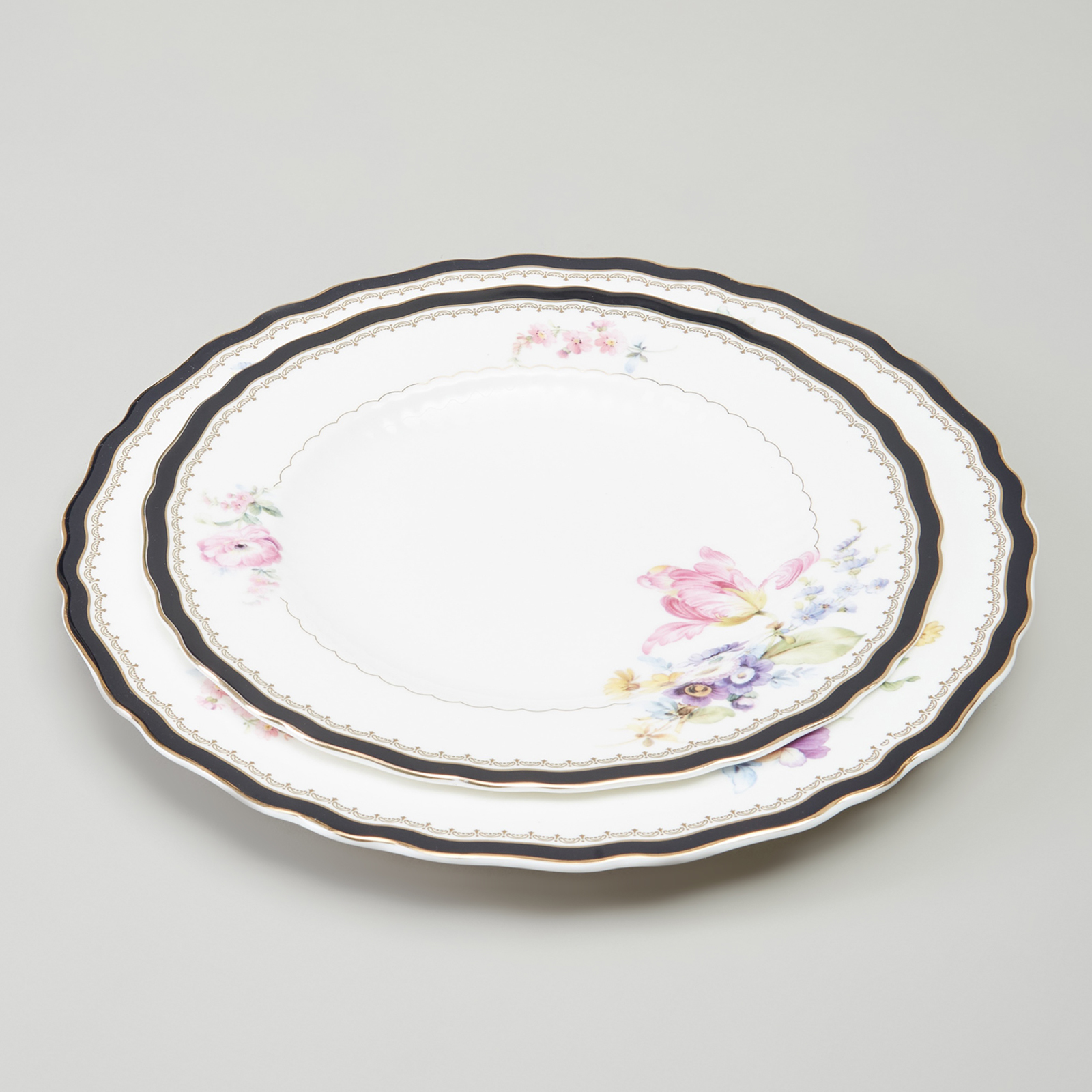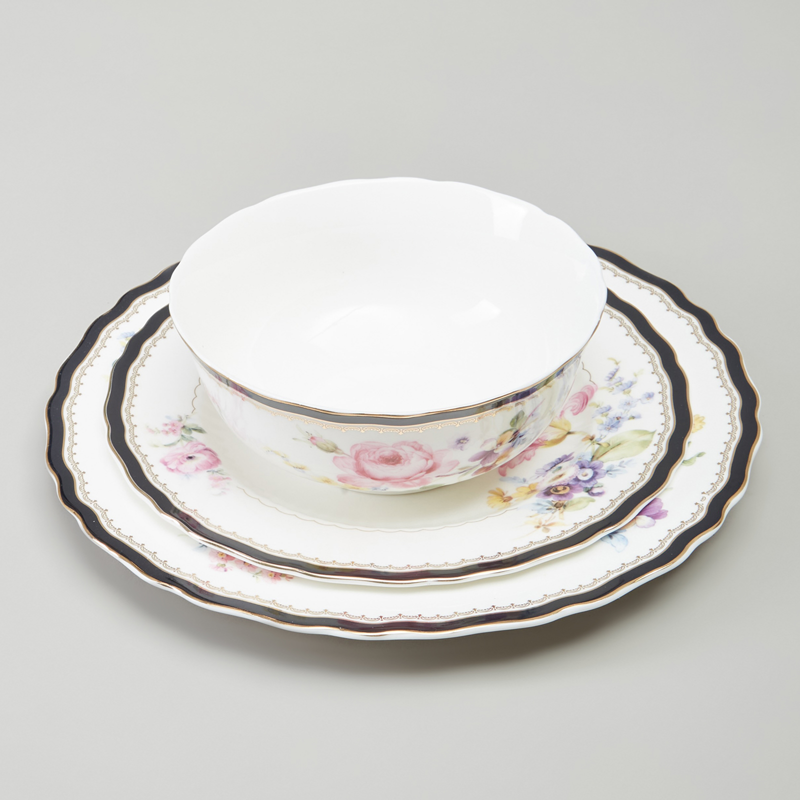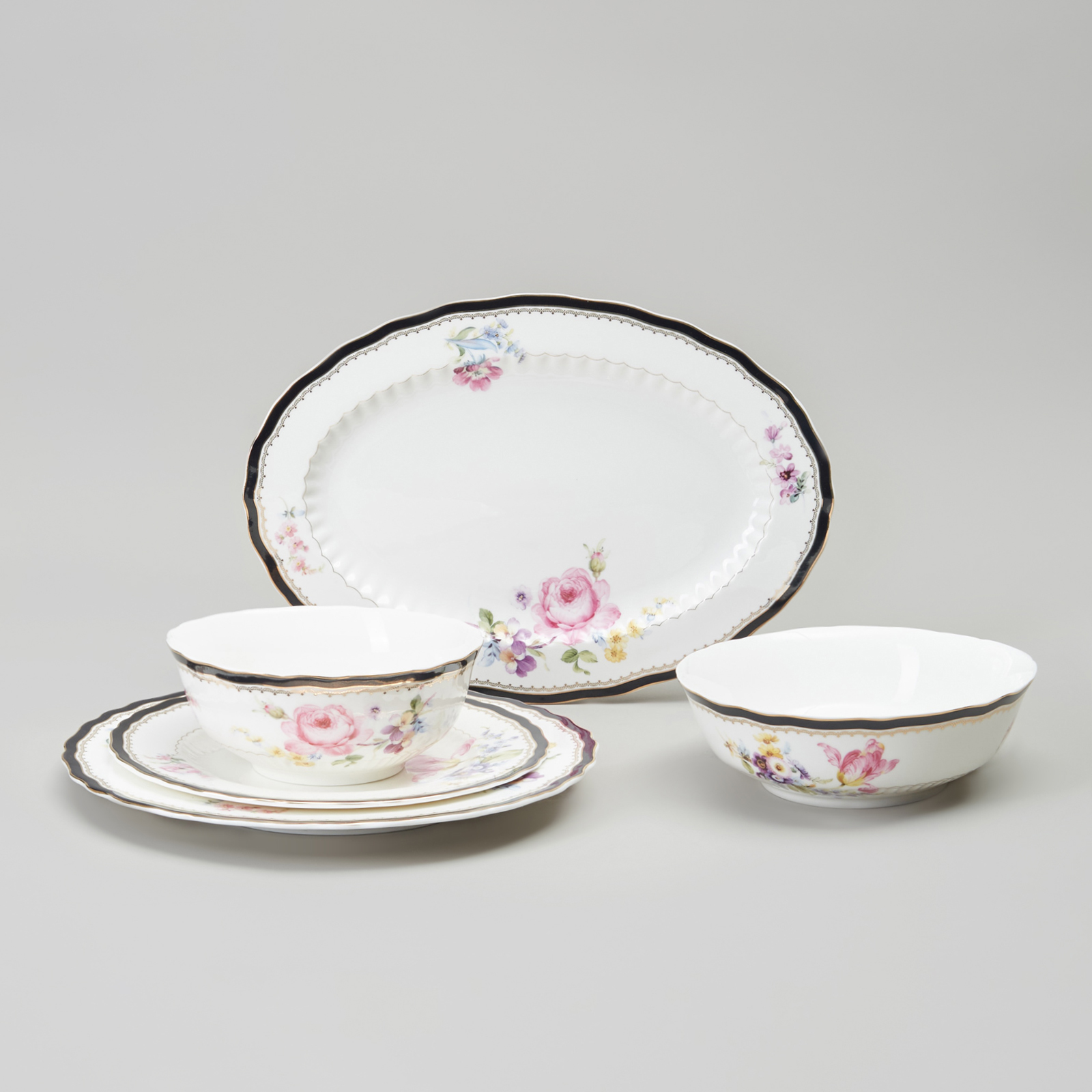 Комплектность: обеденная тарелка 25,5 см 6 шт., закусочная тарелка 21 см 6 шт., суповая тарелка - салатник 17,5*5,5 см 700 мл 6 шт., блюдо овальное 32,5*22,5*2,5 см 2 шт., салатник 22,5*7 см 1650 мл, салатник 15*6 см 630 мл 2 шт.