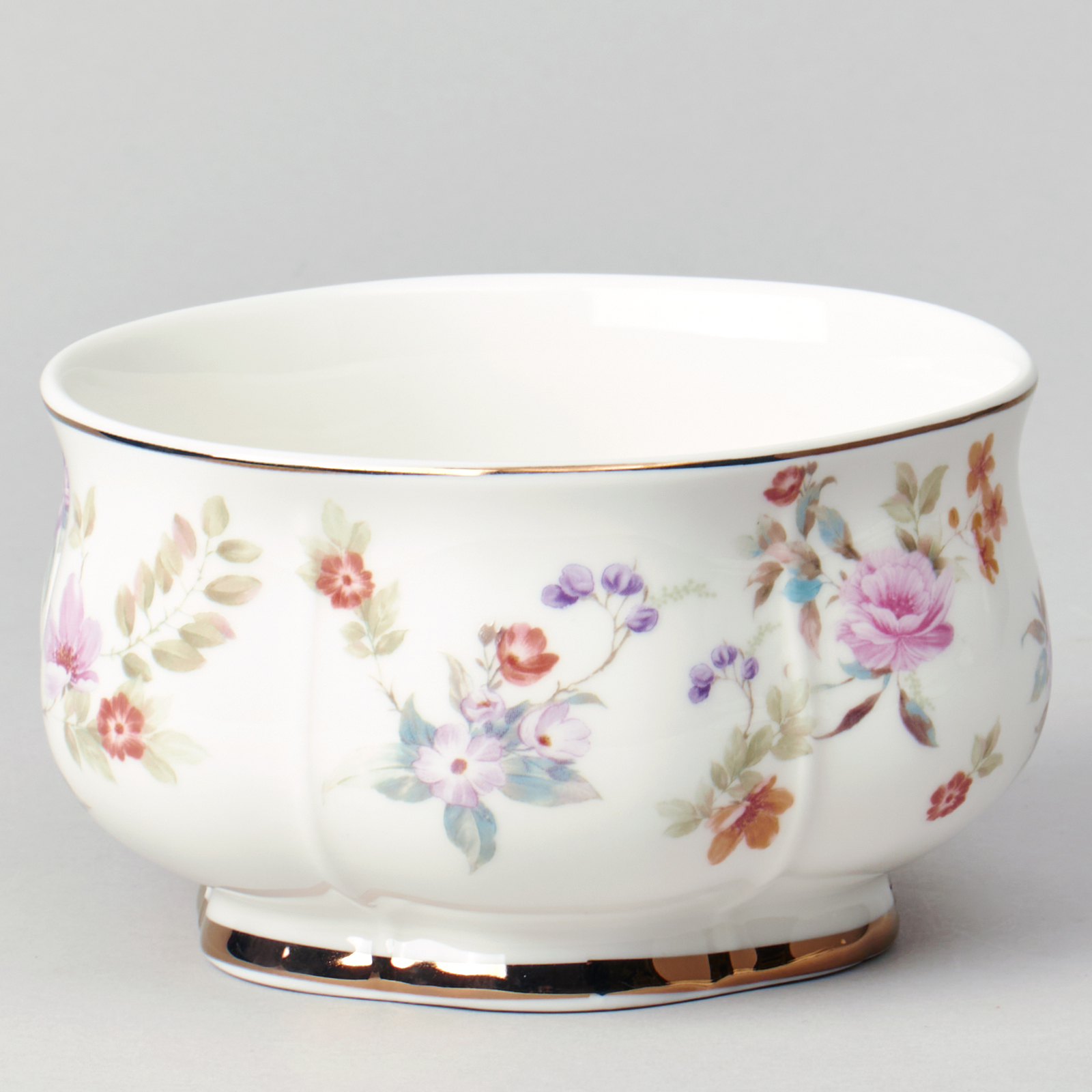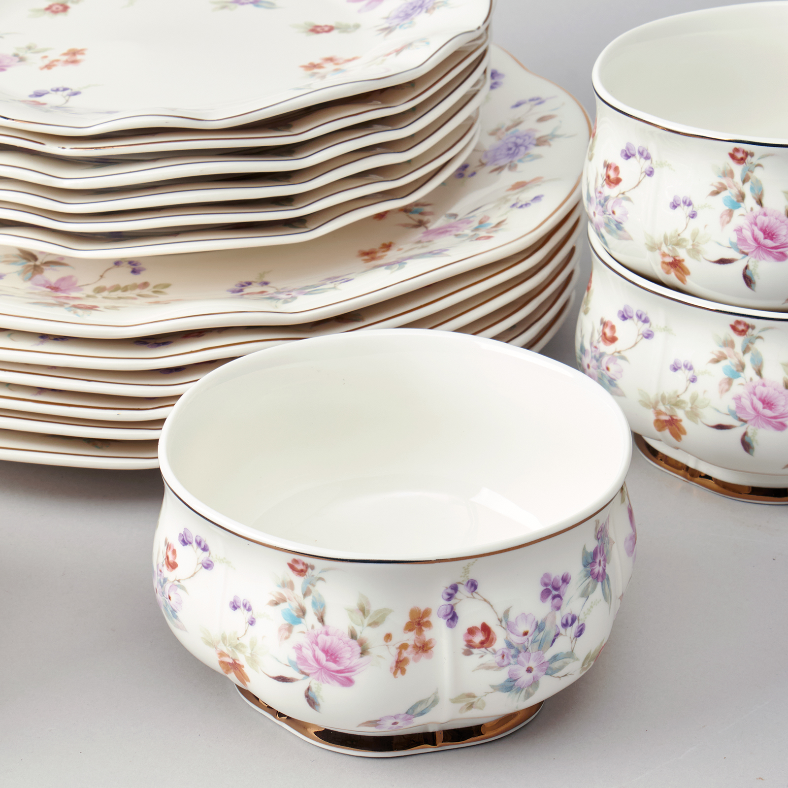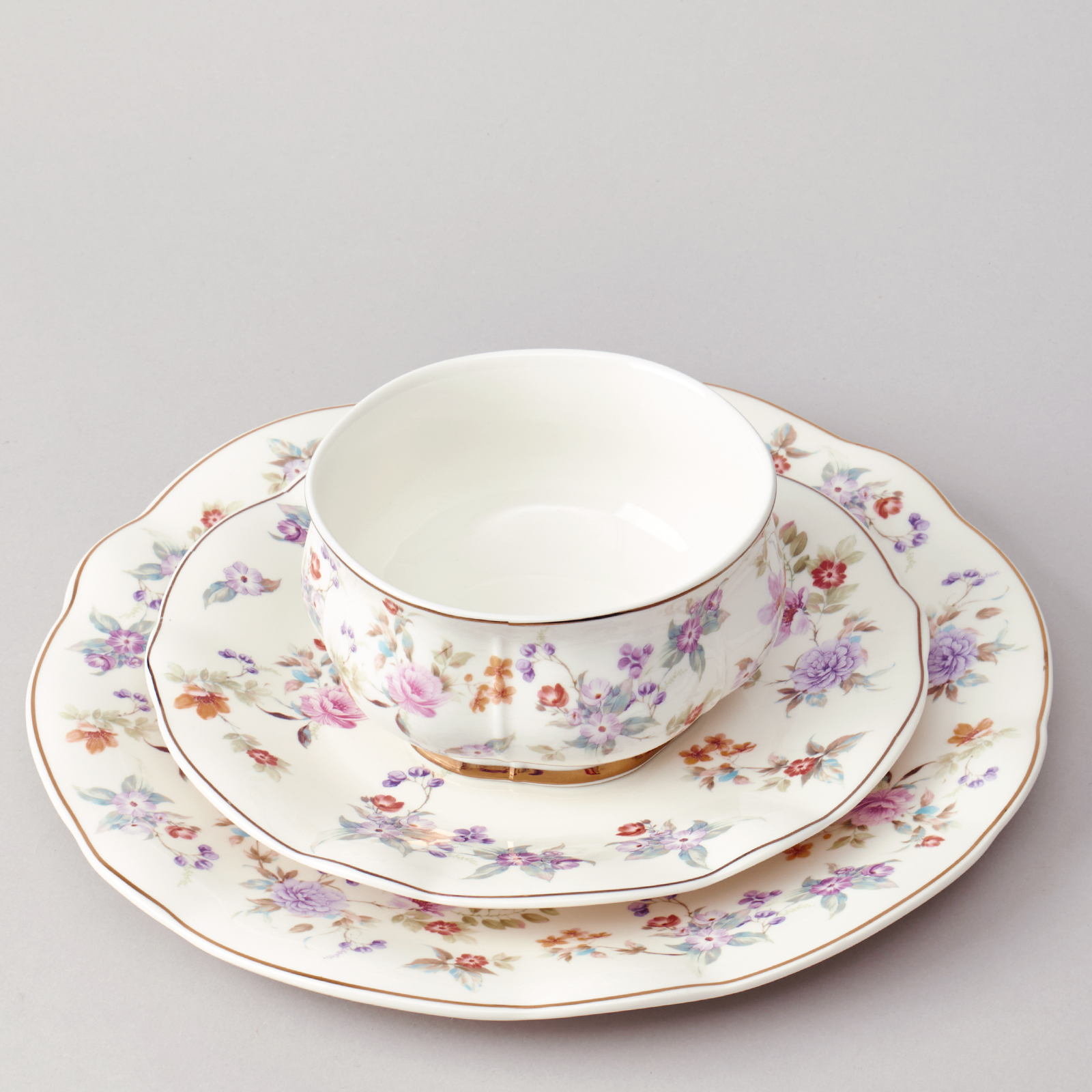 ТМ LEFARD коллекция "Времена года" выполнена из тонкостенного фарфора. Стильная форма, вместительный объем, модное сочетание пастельных тонов и цветочной деколи, отделка золотом - все это делает коллекцию неотразимой и очень привлекательной. Форма и цвет посуды способны оказать магическое действие на всех, кто находится за столом. «Времена года» могут согреть душу, создать тепло и уют в доме. Это прекрасный подарок. Продукция прошла сертификацию и безопасна для контакта с пищевыми продуктами. Можно ставить в микроволновую печь, не рекомендуется мыть в посудомоечной машине. Комплектность: тарелка обеденная 26,5*2,4 см - 6 шт., тарелка десертная 20*2 см - 6 шт., салатник 12*6,5 см 440 мл - 6 шт.