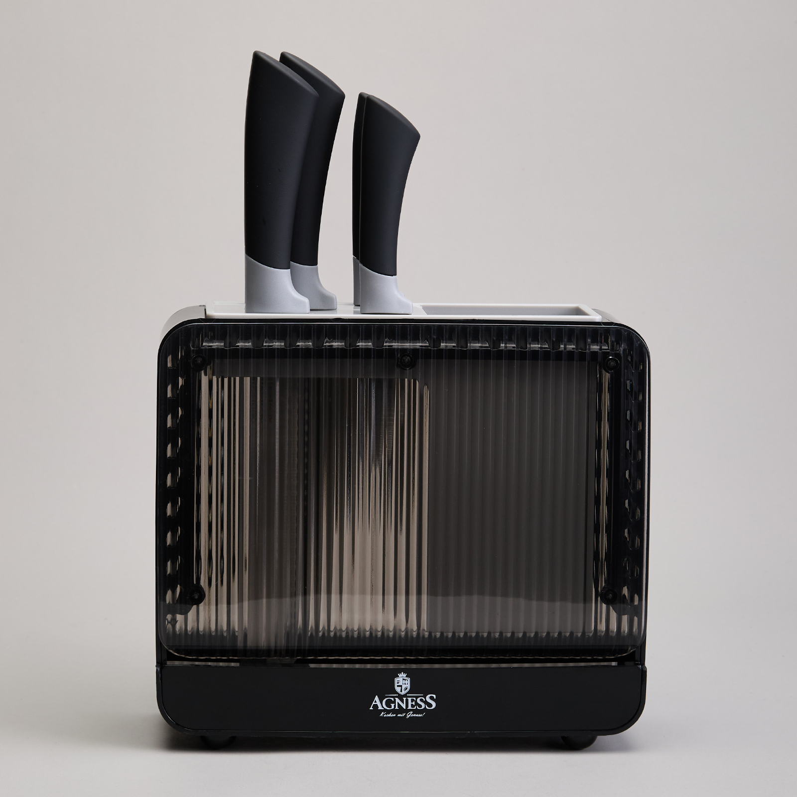 ● Удобная пластиковая подставка для хранения ножей и кухонных принадлежностей.
