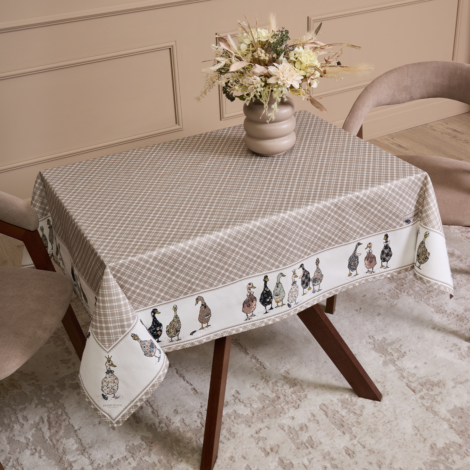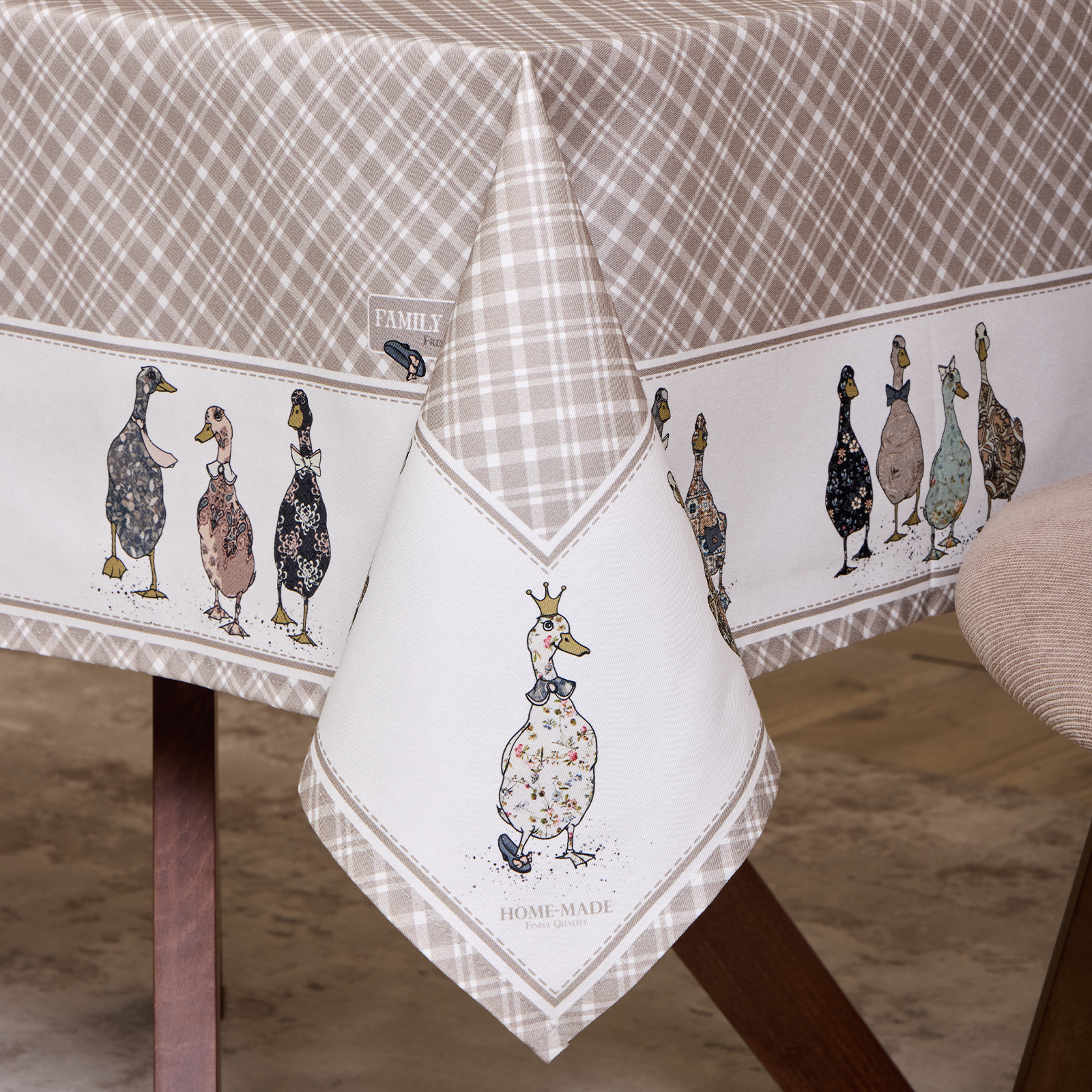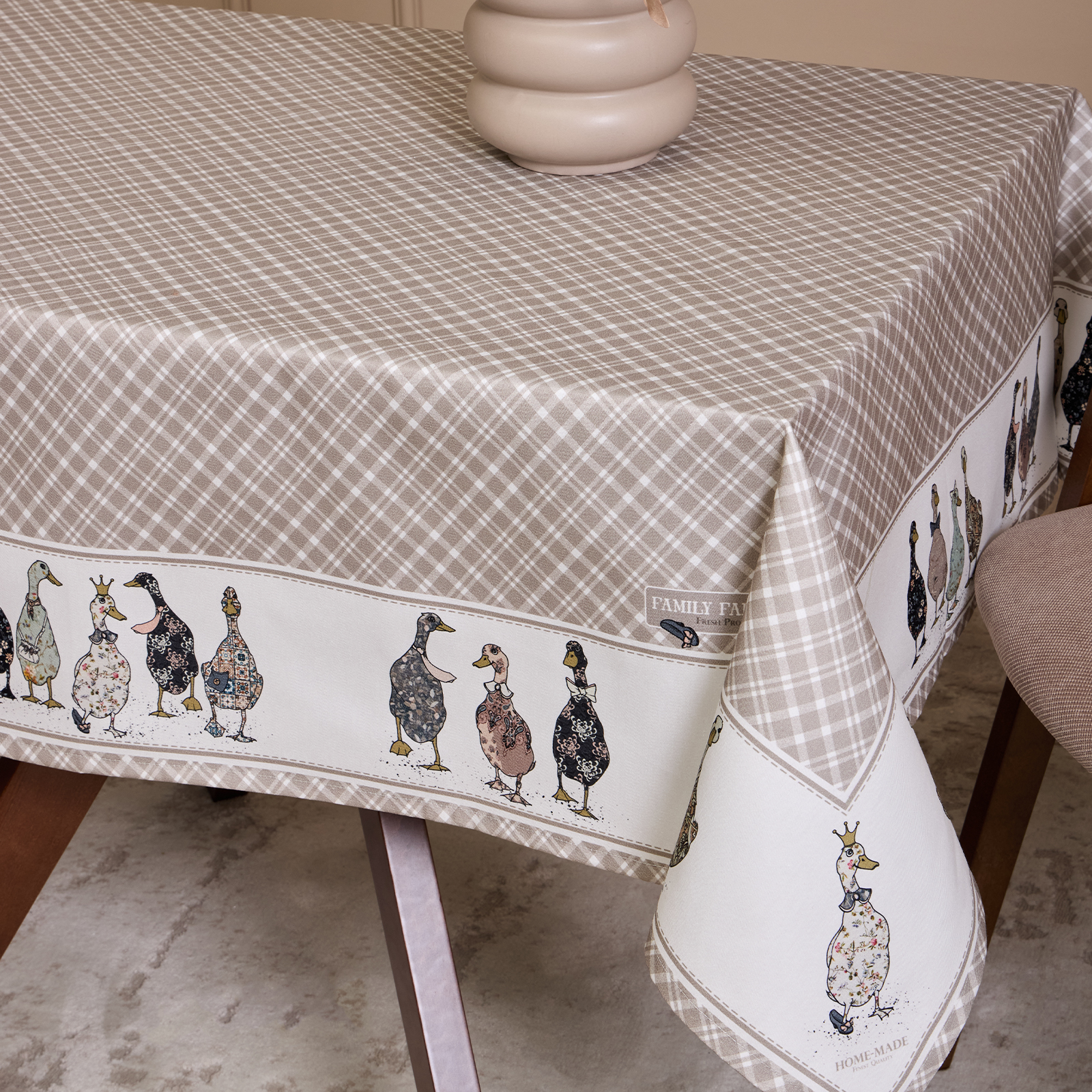 Прямоугольная форма и размер 110×140 см подходят для большинства обеденных столов на 2–4 человека. Элегантный дизайн с рисунком в мелкую клетку и милыми уточками по краю создаёт уютную атмосферу и станет украшением любого интерьера — кухни, столовой или гостиной.