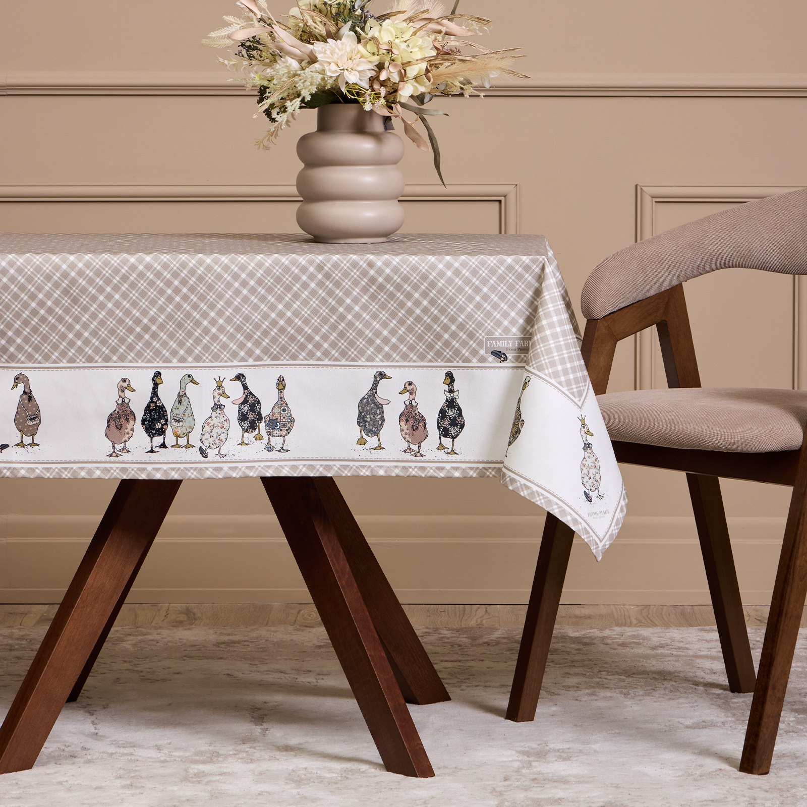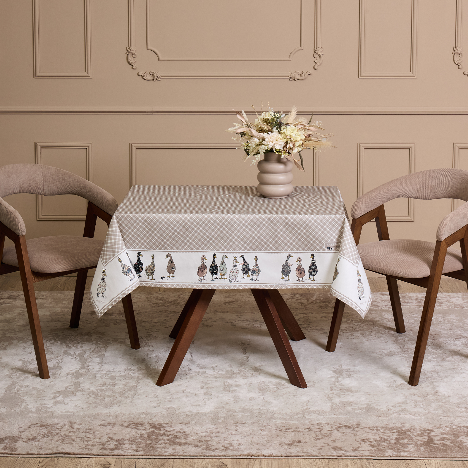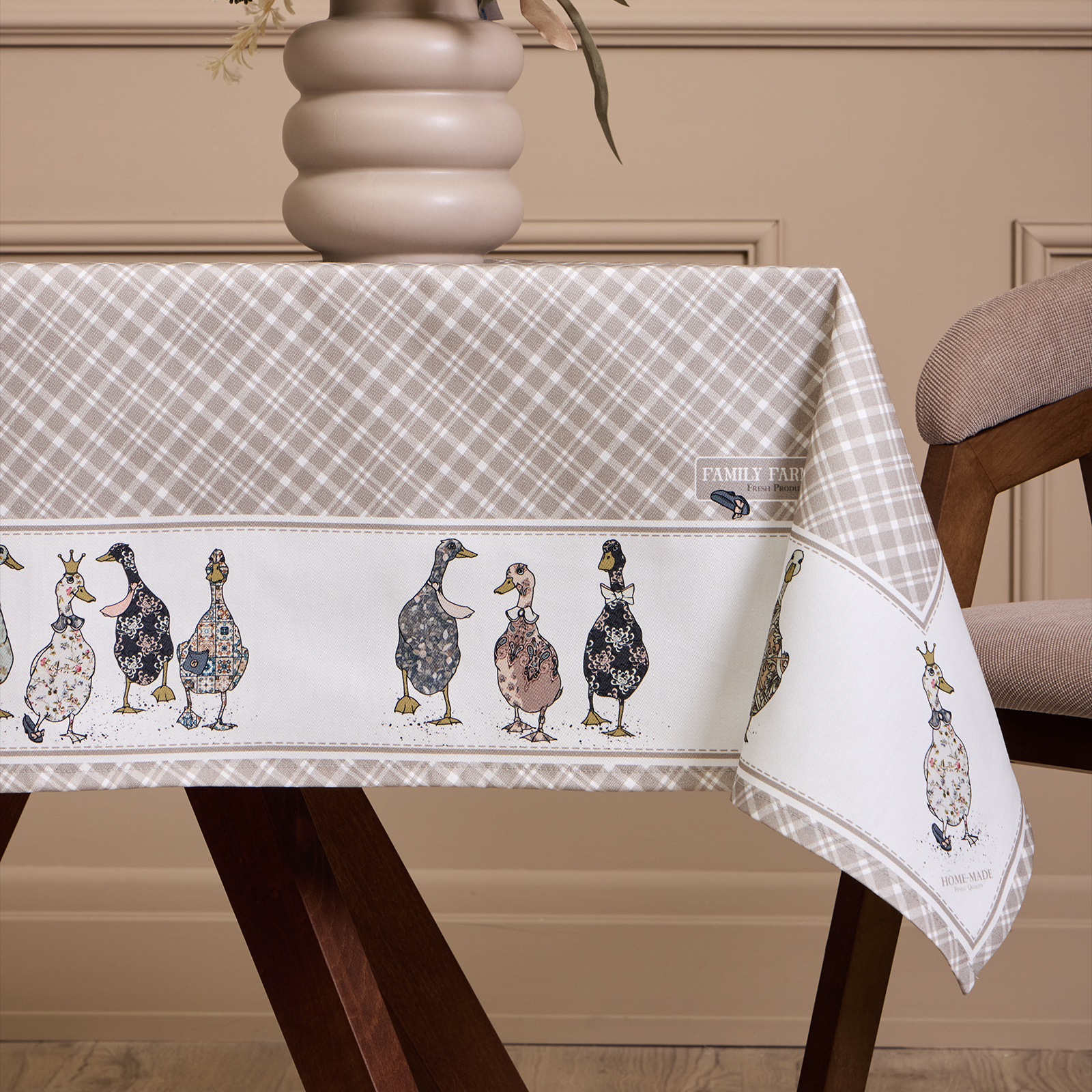 Прямоугольная форма и размер 110×140 см подходят для большинства обеденных столов на 2–4 человека. Элегантный дизайн с рисунком в мелкую клетку и милыми уточками по краю создаёт уютную атмосферу и станет украшением любого интерьера — кухни, столовой или гостиной.