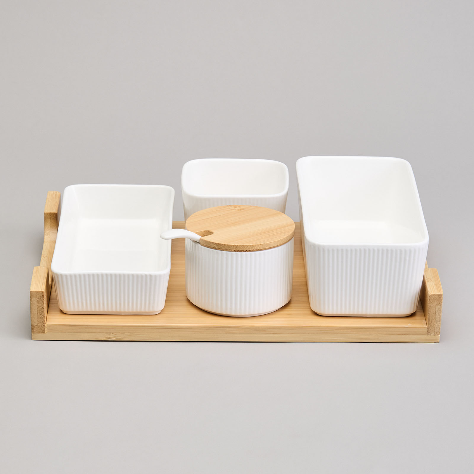 Комплектация: менажница 500 мл. - 1 шт., менажница 250 мл. - 1 шт., менажница 170 мл. - 1 шт., банка с бамбуковой крышкой и ложкой 100 мл. - 1 шт.