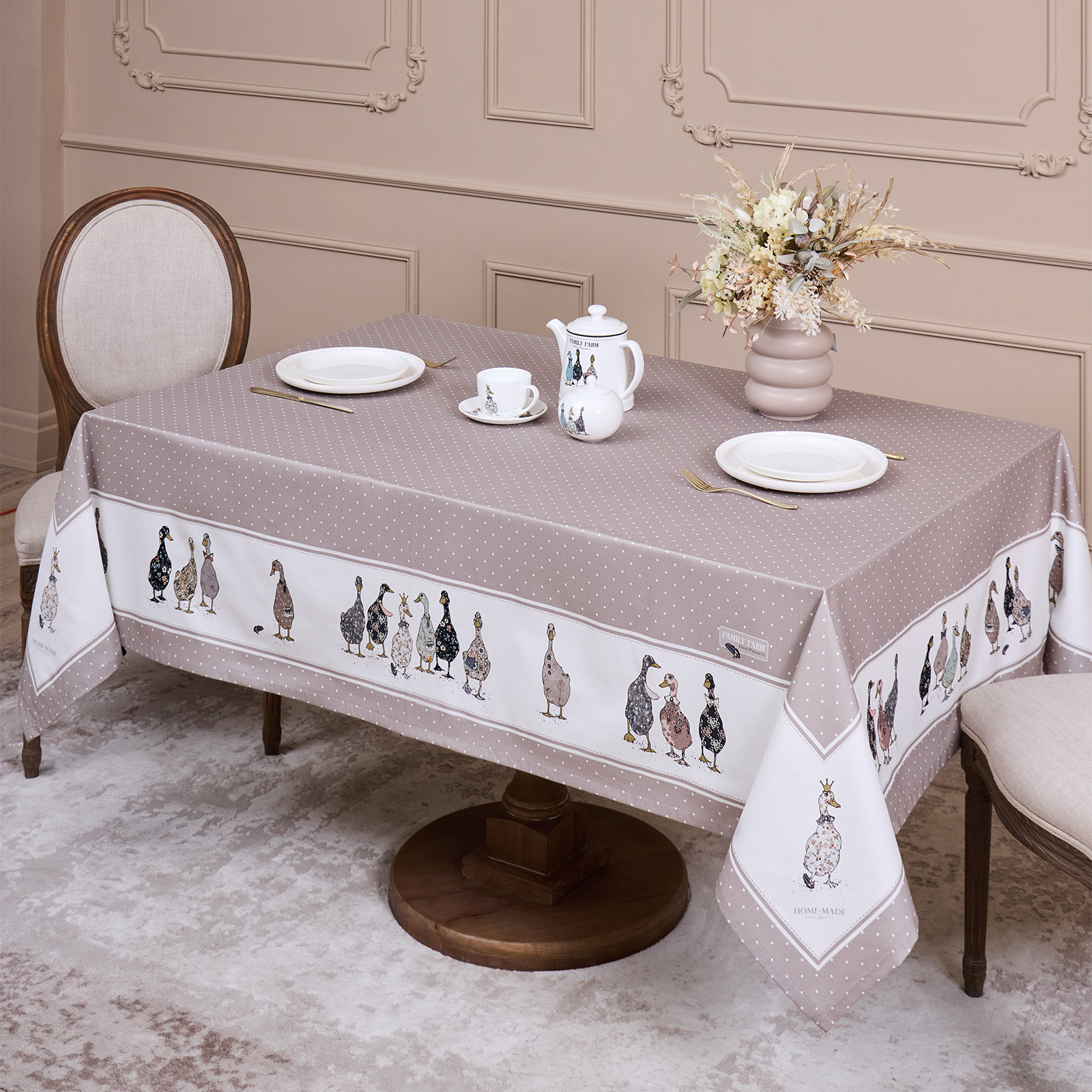 Тканевая, но прочная, сделанная из 100% хлопка, добавлена водоотталкивающая пропитка, что делает ее влагостойкой и непромокаемой, идеальный выбор для повседневного использования. Наша скатерть для обеденного стола сочетает в себе красоту и практичность, обеспечивая идеальный фон для ваших семейных ужинов.
