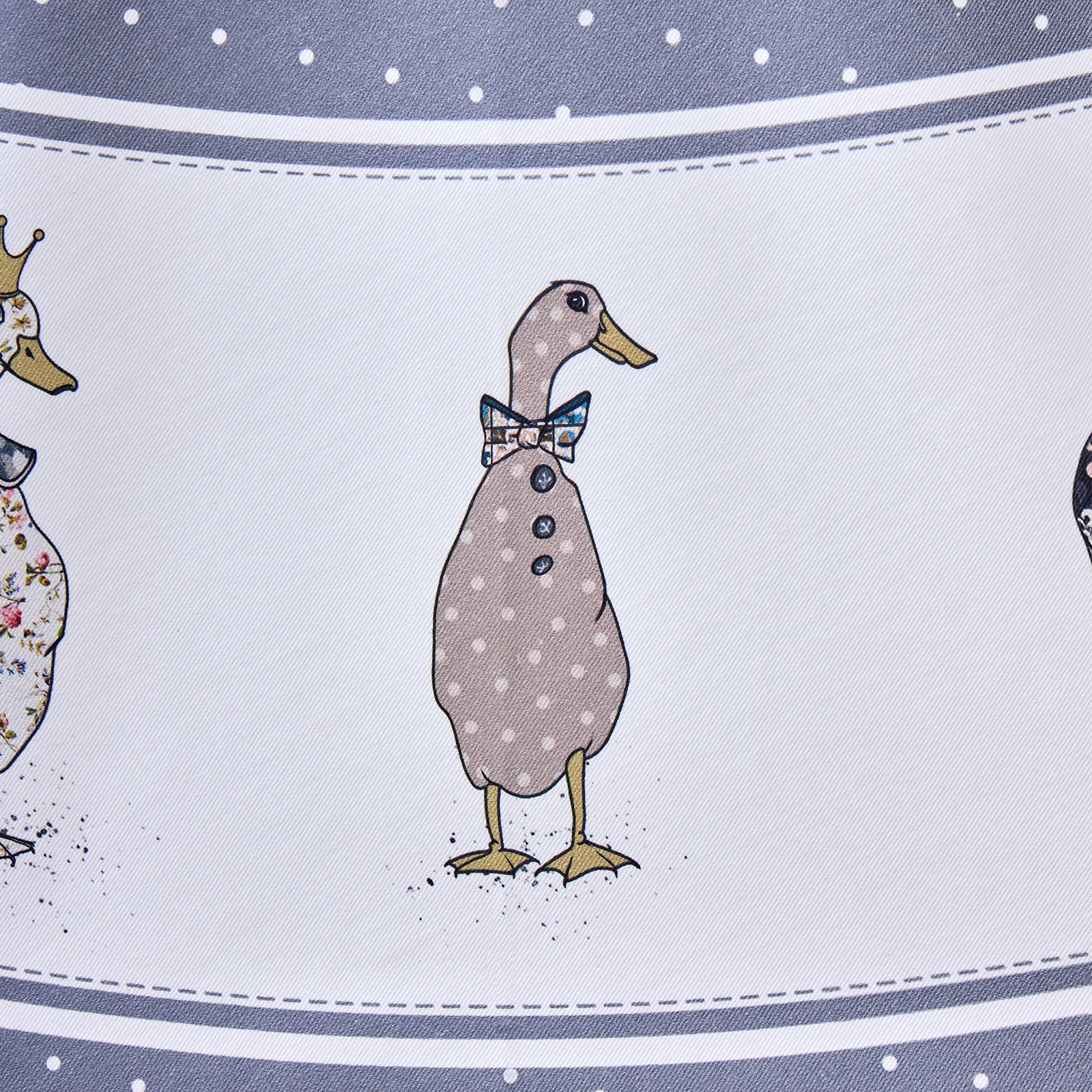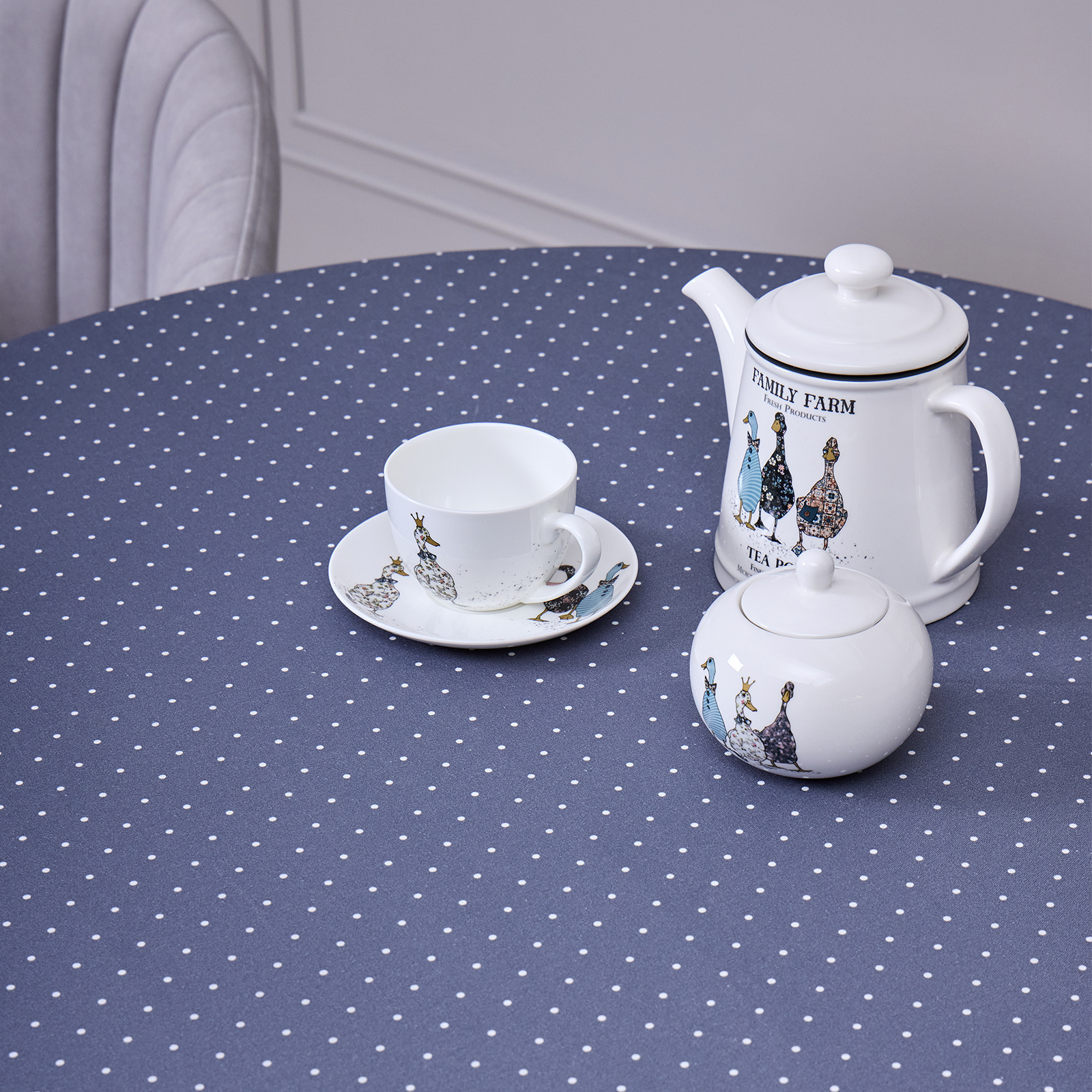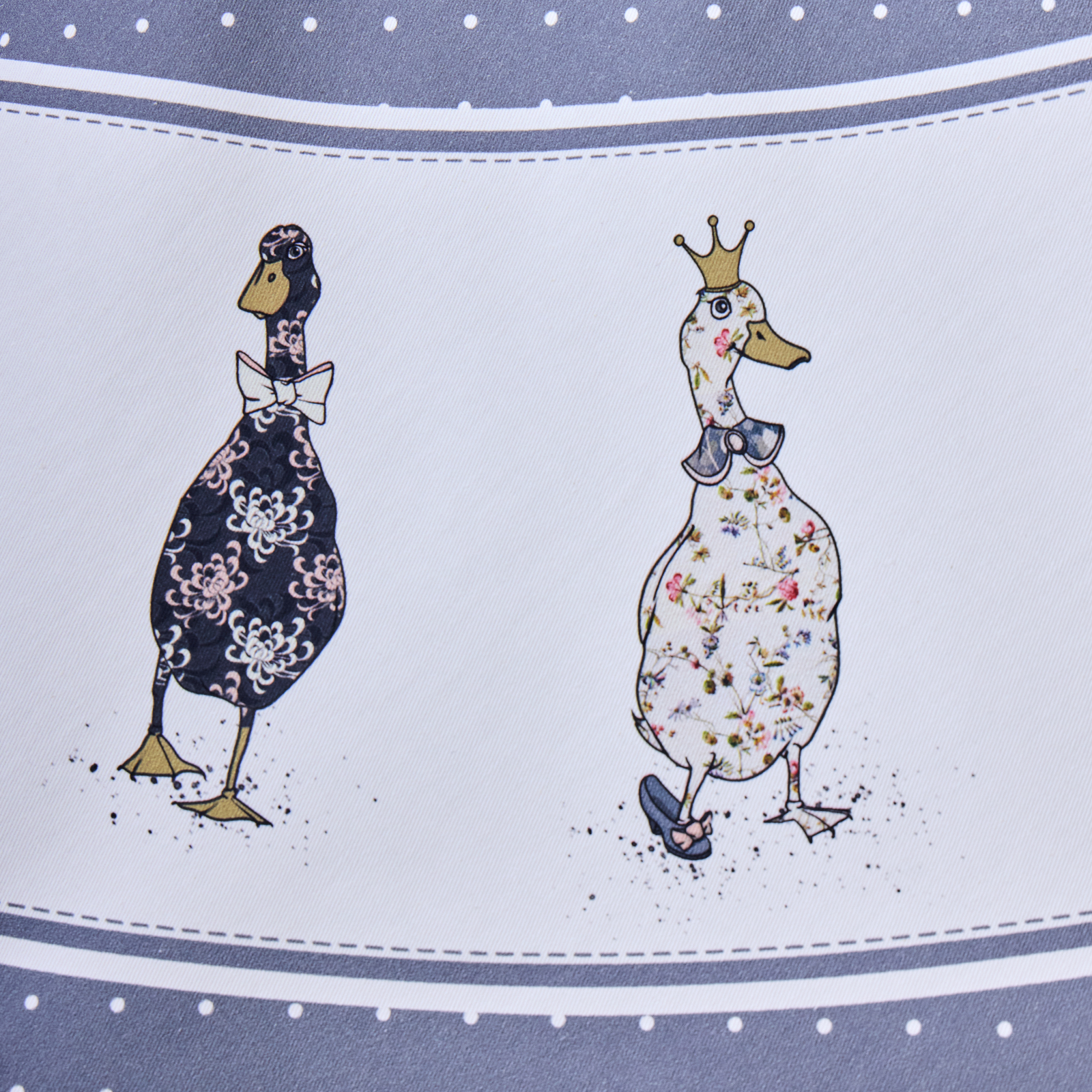 Дизайн в синем цвете с мелким горохом, дополненный декоративной вставкой с изображениями уток и гусей по нижнему краю, придаёт интерьеру оригинальность и уют. Такой принт гармонично впишется как в классическую, так и в современную кухню или столовую.