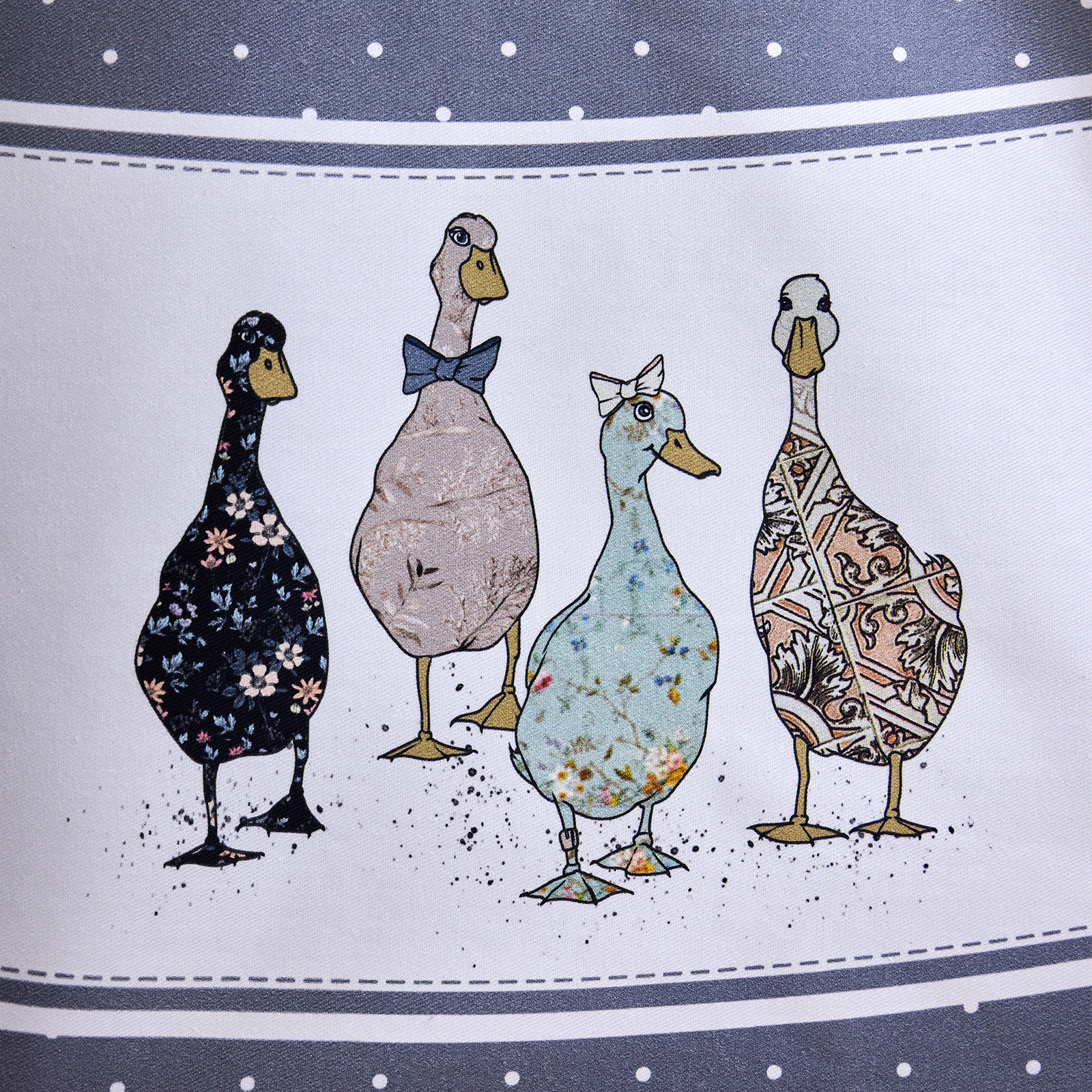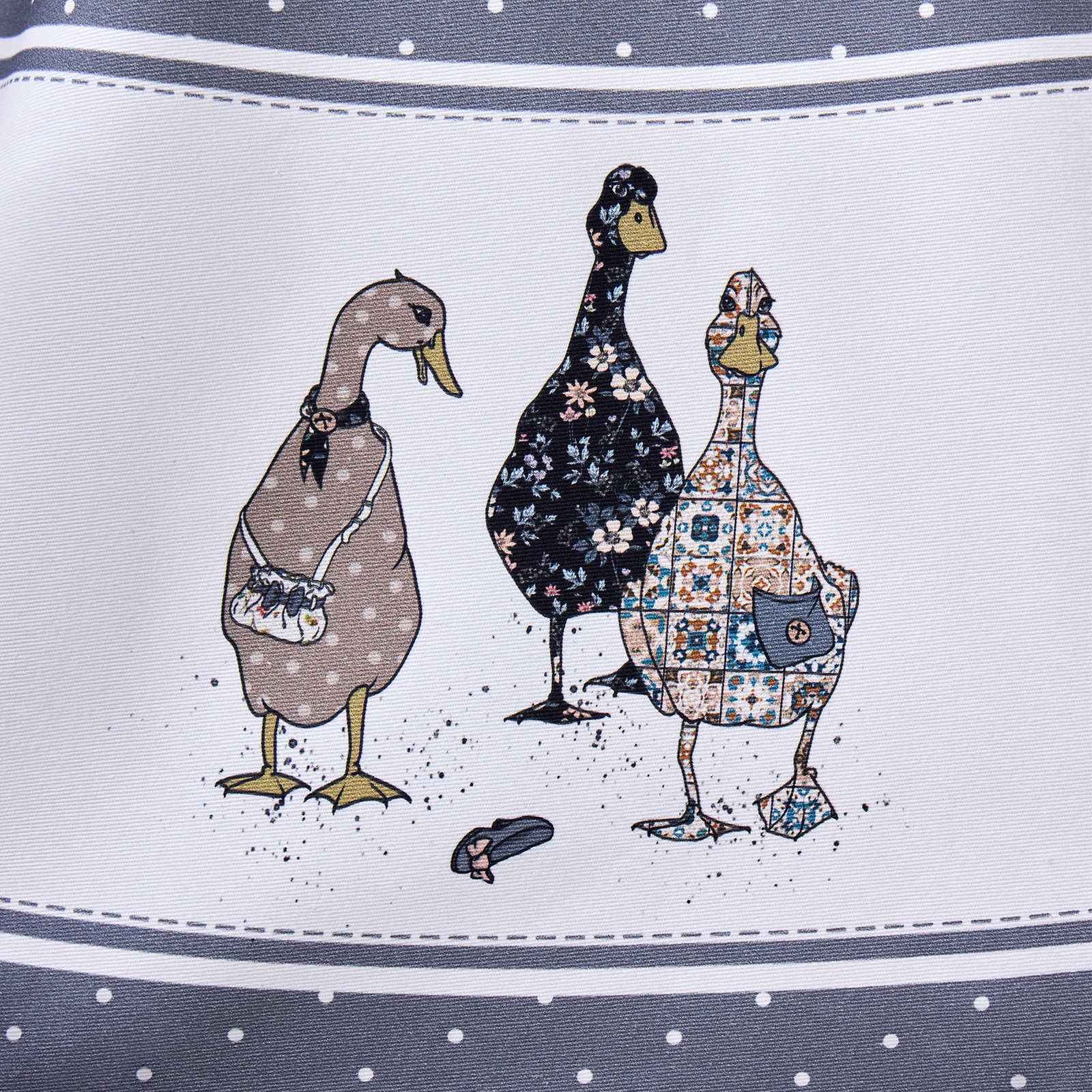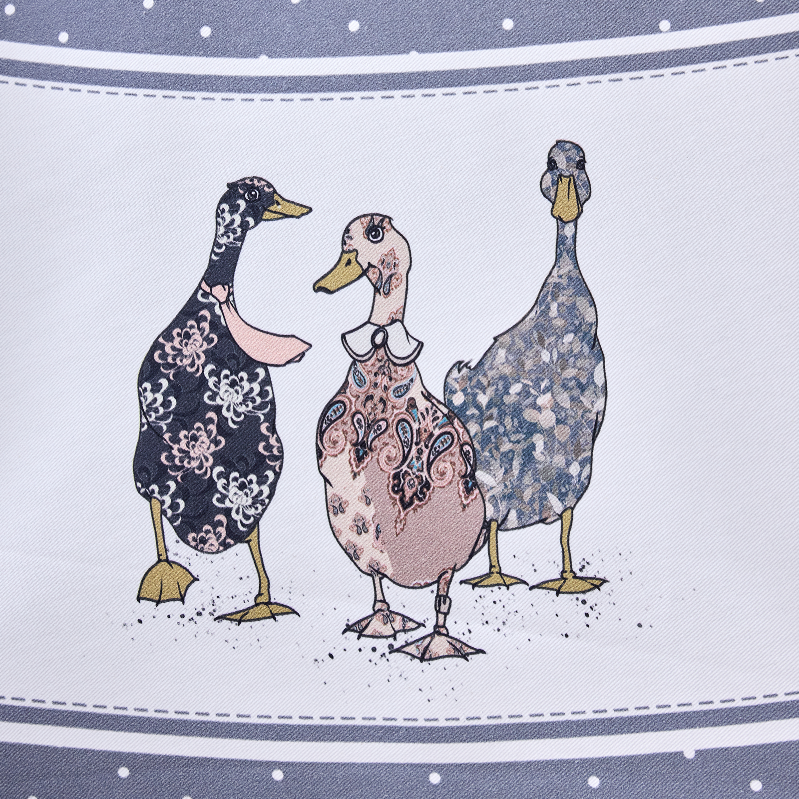 Дизайн в синем цвете с мелким горохом, дополненный декоративной вставкой с изображениями уток и гусей по нижнему краю, придаёт интерьеру оригинальность и уют. Такой принт гармонично впишется как в классическую, так и в современную кухню или столовую.