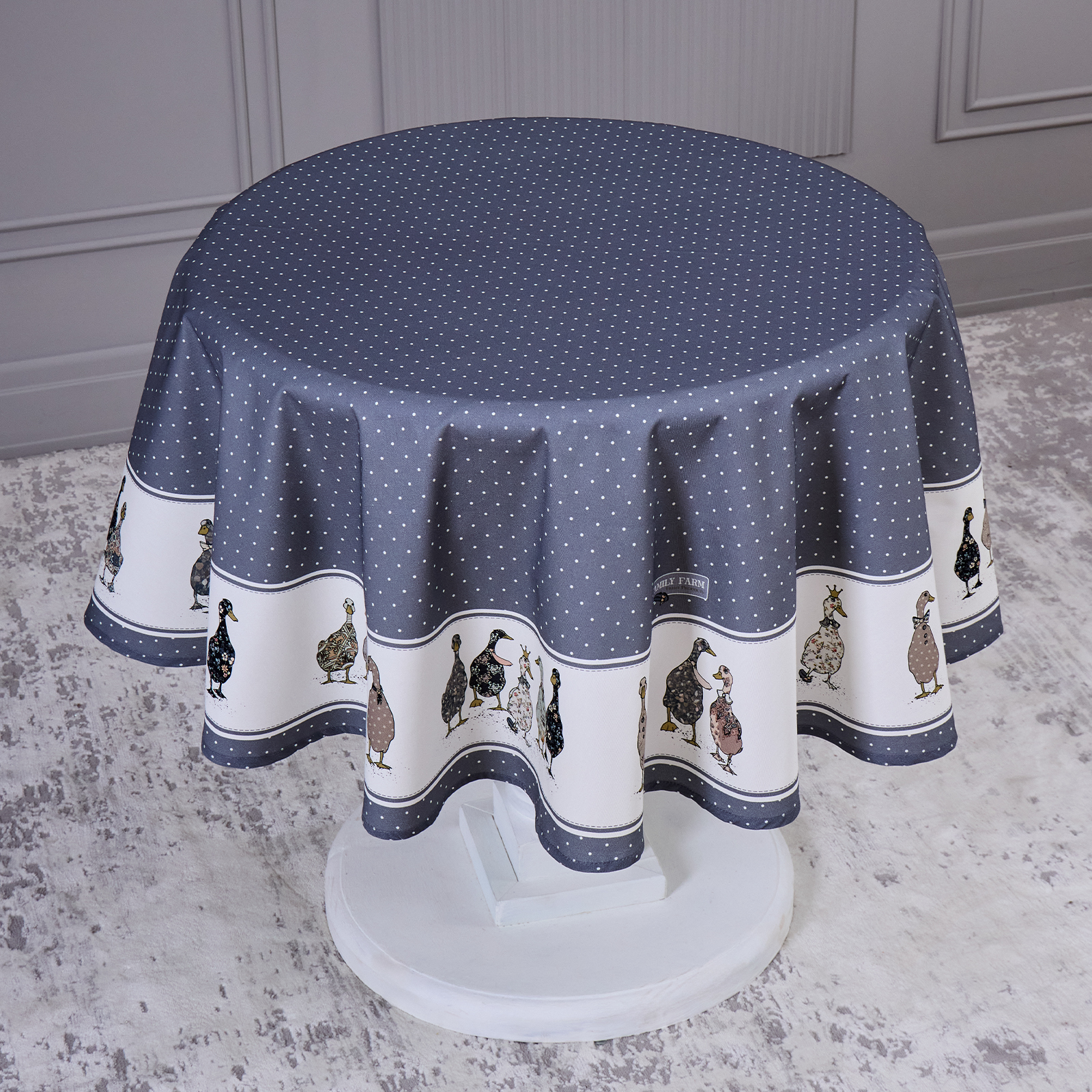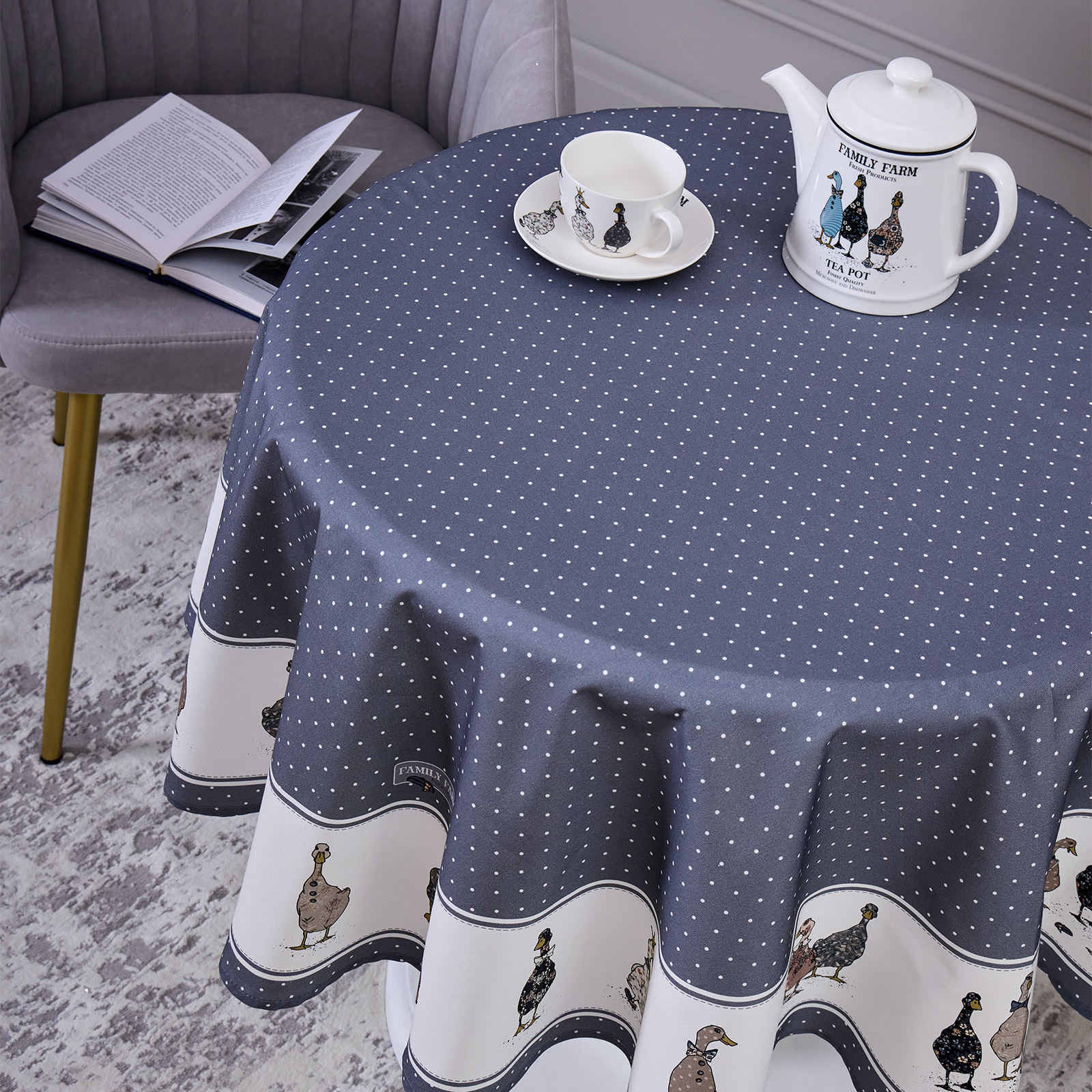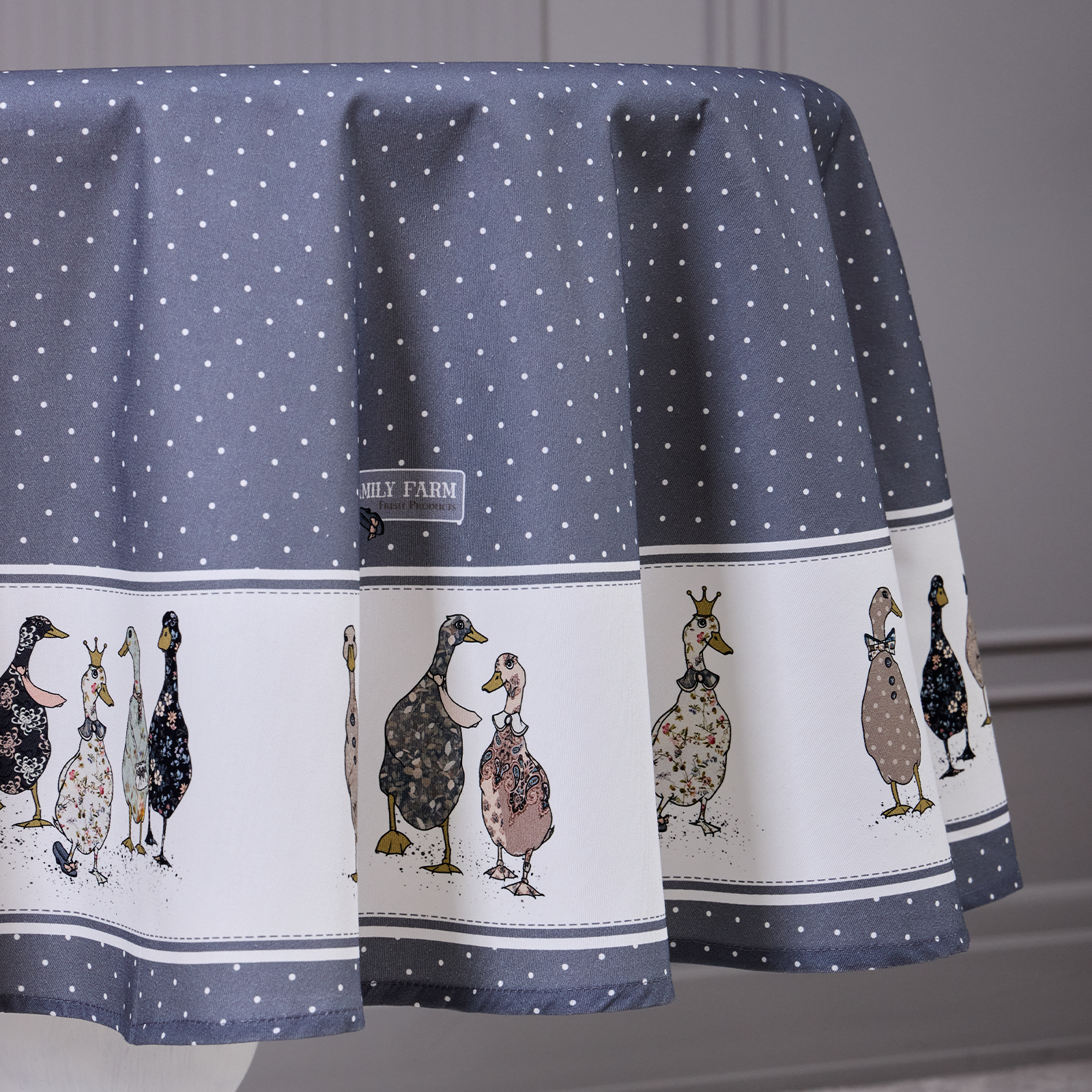 СКАТЕРТЬ КРУГЛАЯ "FAMILY FARM" 150 СМ ,100% ХЛОПОК, ГРАФИТ,ТВИЛ, ПРОПИТКА