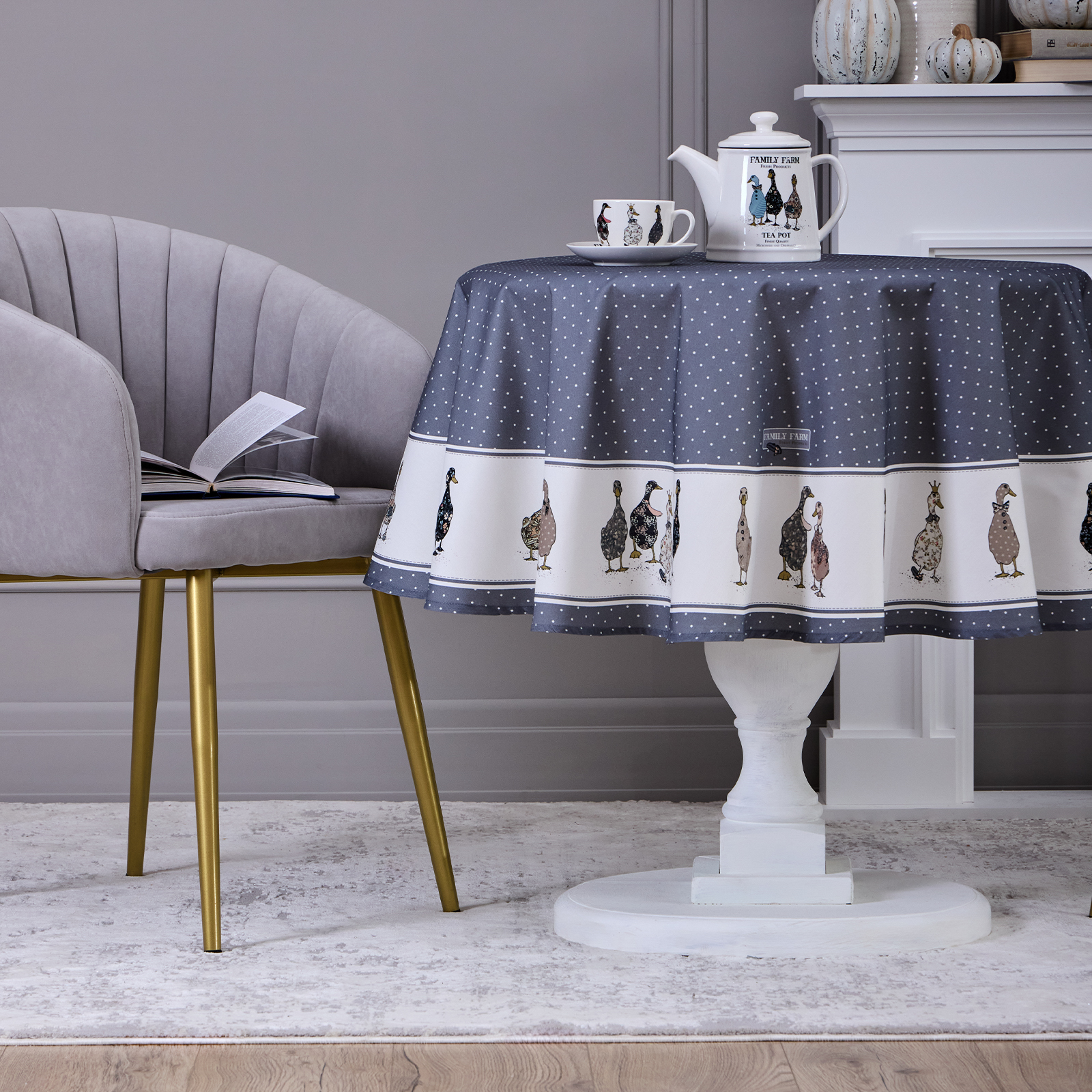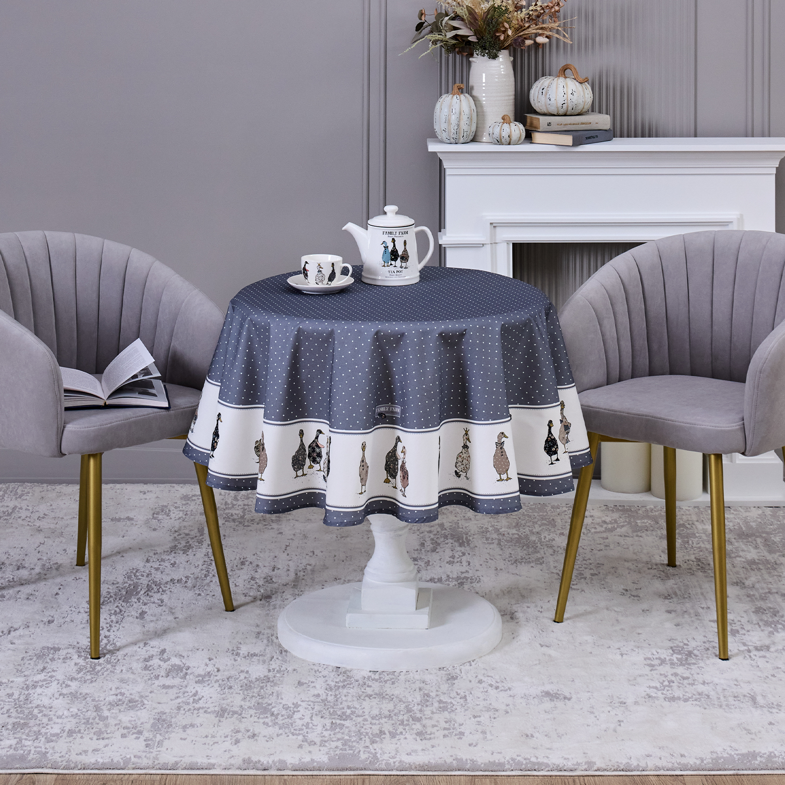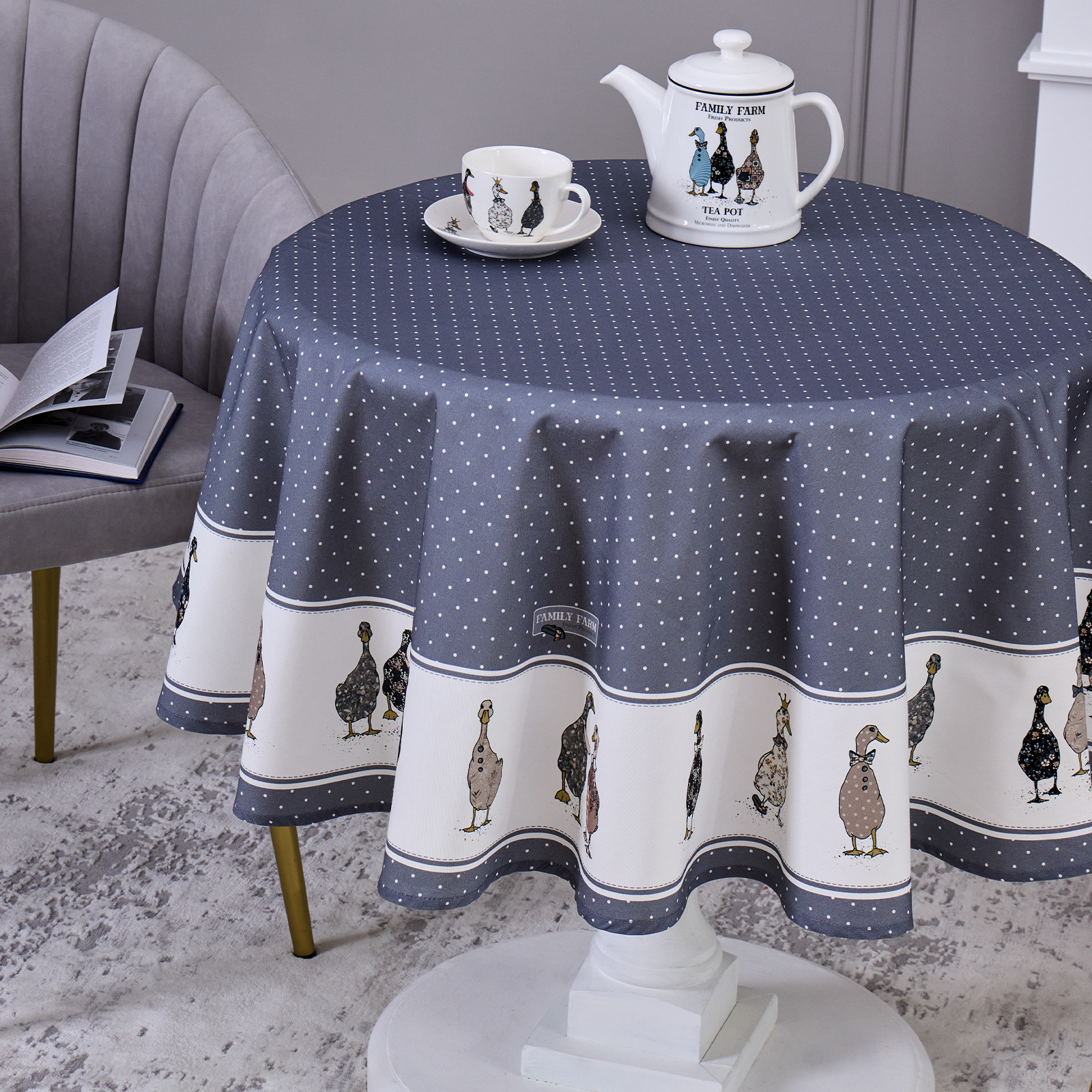 СКАТЕРТЬ КРУГЛАЯ "FAMILY FARM" 150 СМ ,100% ХЛОПОК, ГРАФИТ,ТВИЛ, ПРОПИТКА