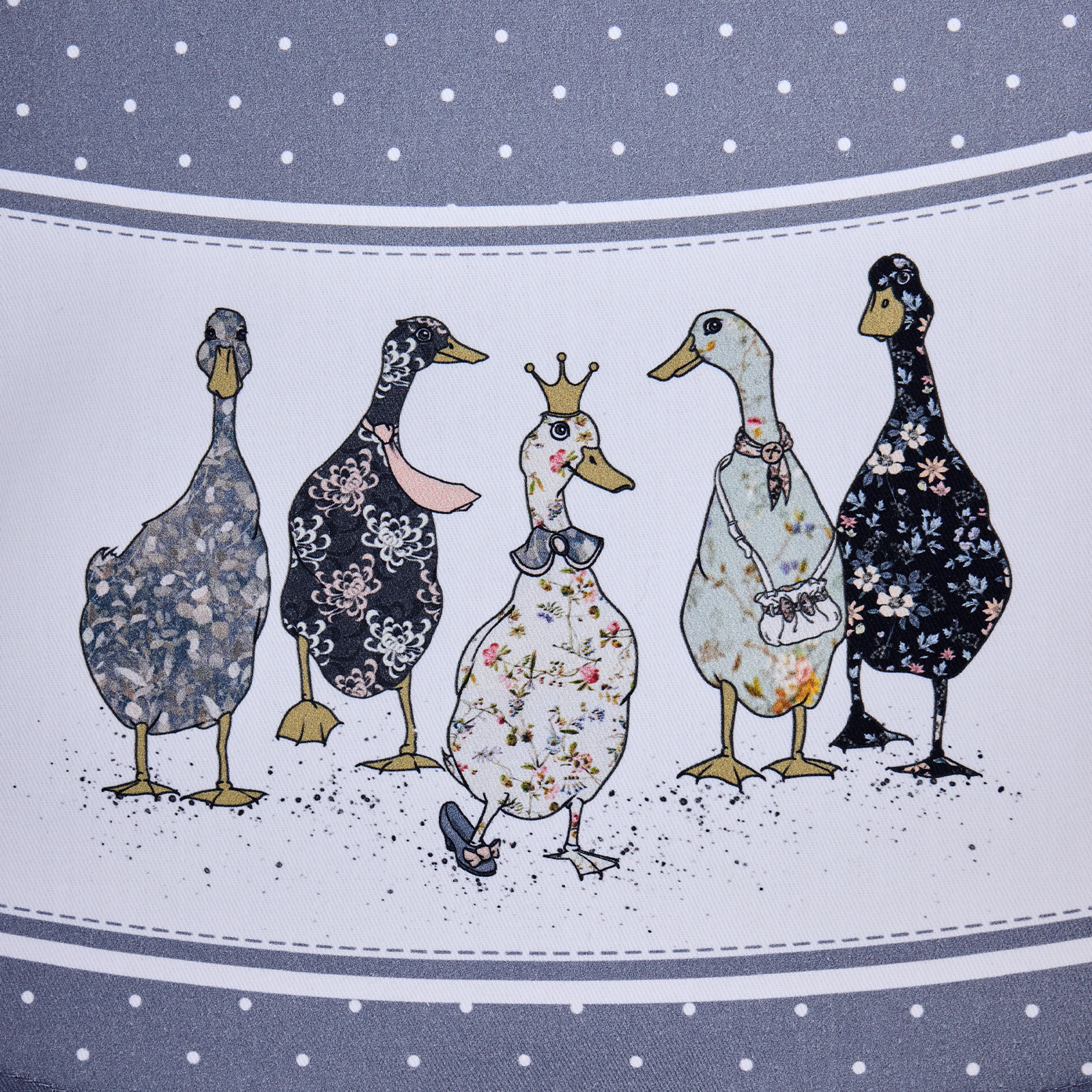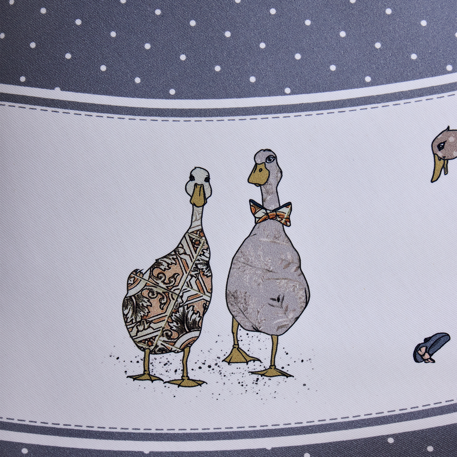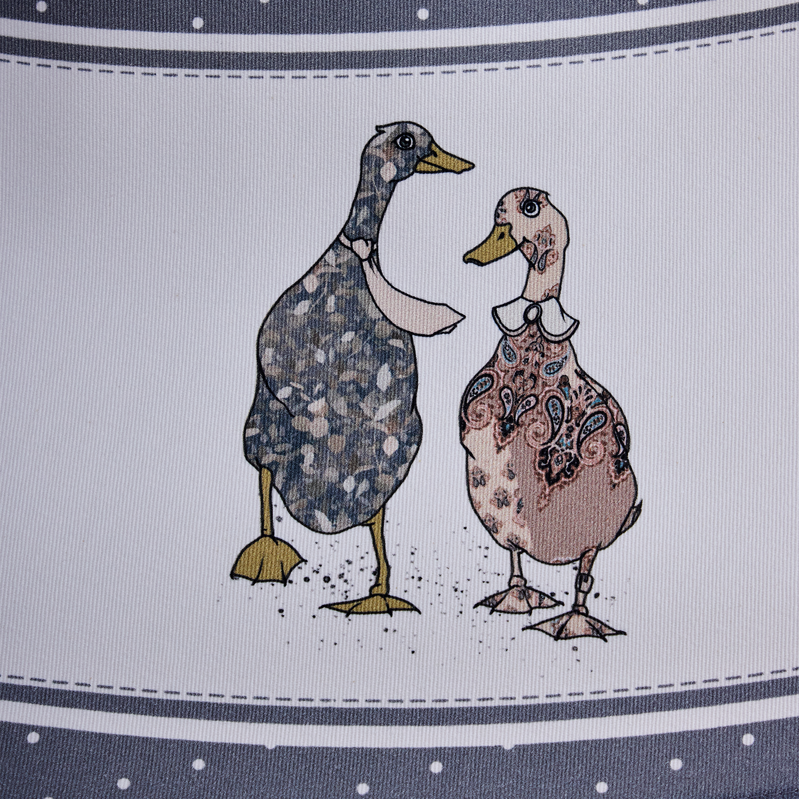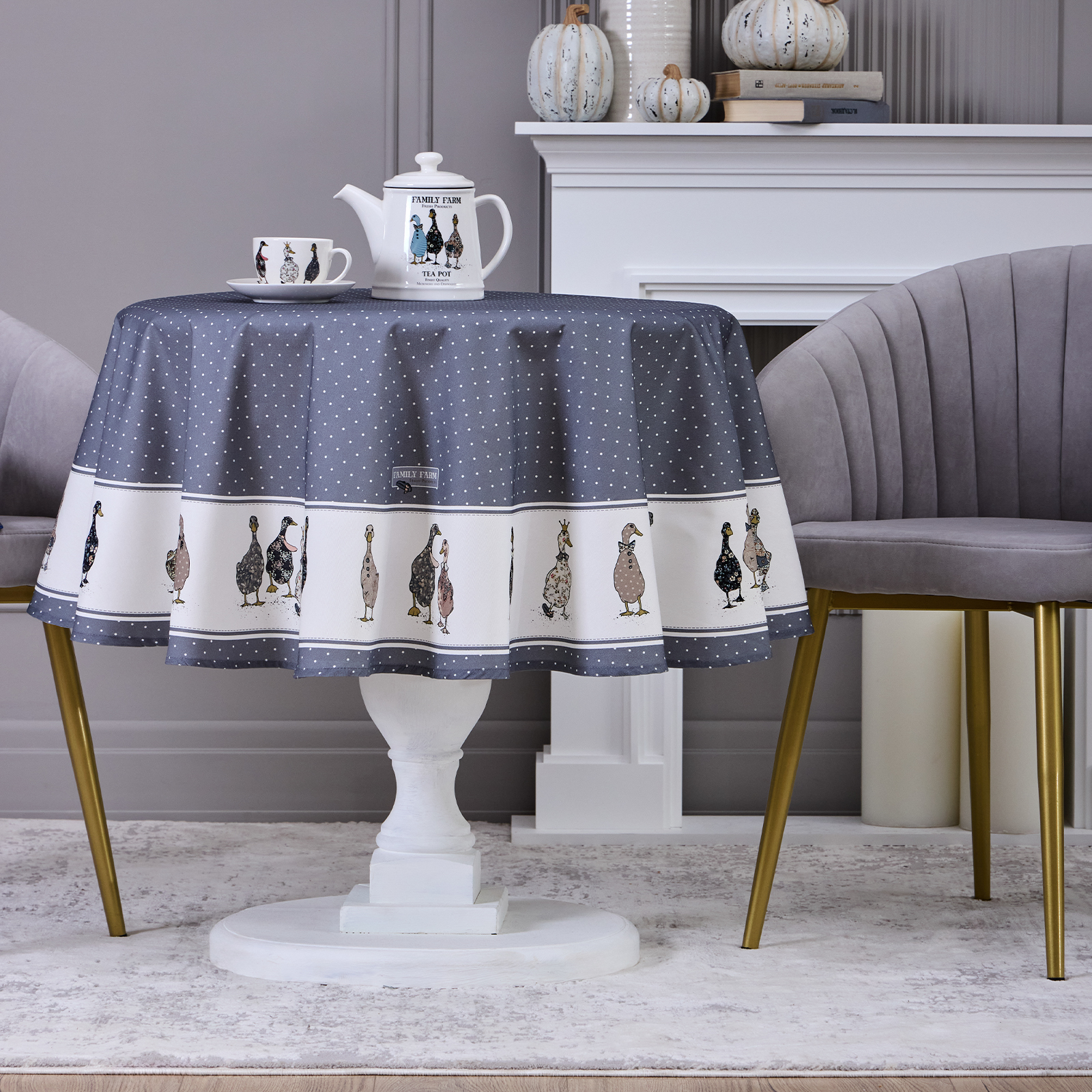 Сервировочная многоразовая скатерть с оригинальным рисунком гусей и изящным узором в горошек станет стильным украшением интерьера, создавая атмосферу уюта и тепла, а необычный принт добавит индивидуальности и очарования в сервировку стола; она идеально подходит для праздничного, обеденного или новогоднего стола, а также для пикника или чаепития в саду и на веранде, защищая мебель от влаги и загрязнений и превращая любой приём пищи в особенный момент.