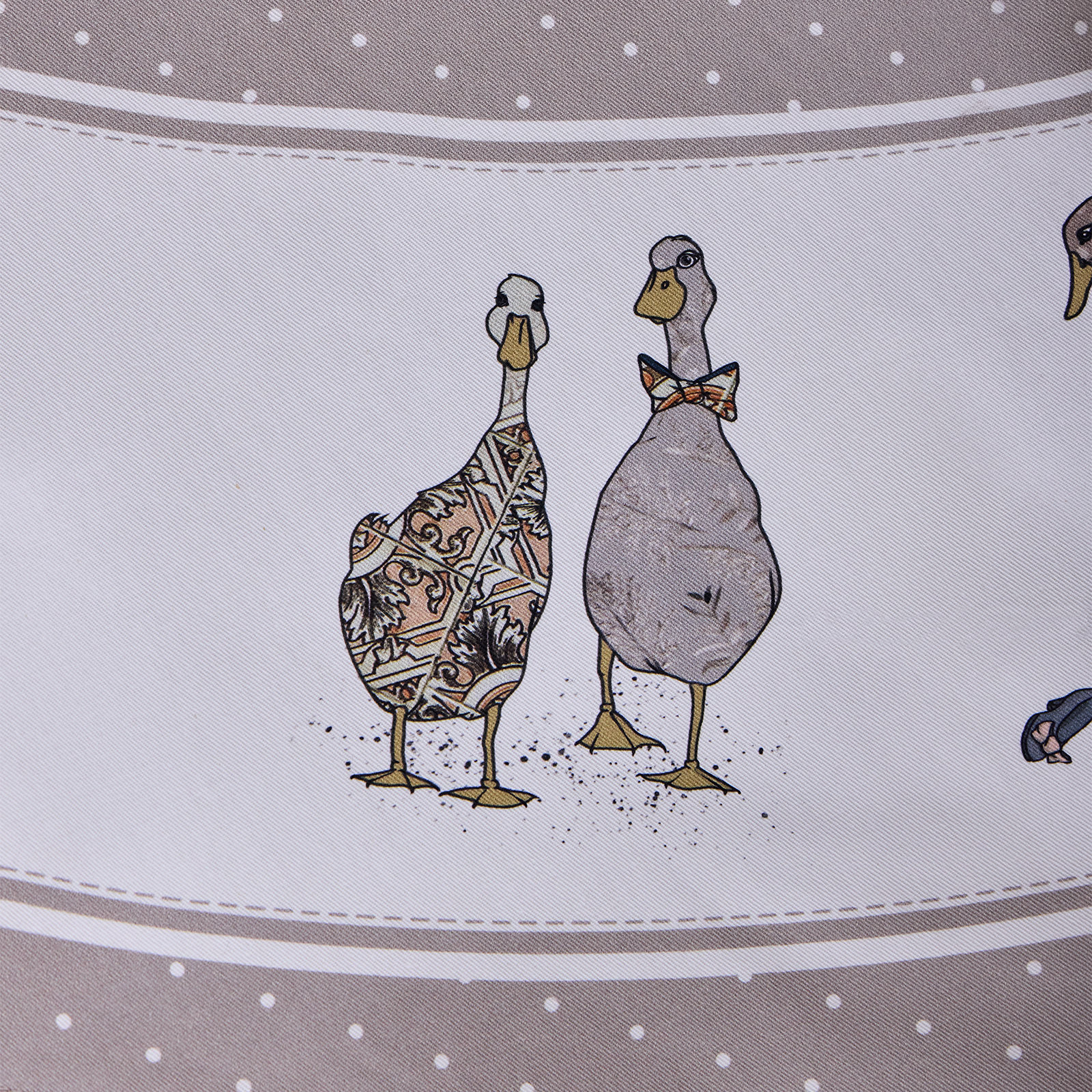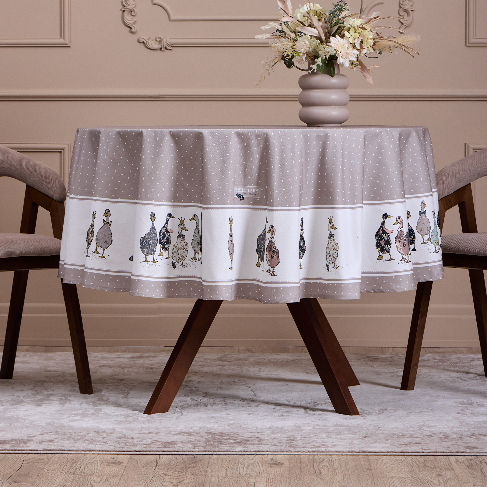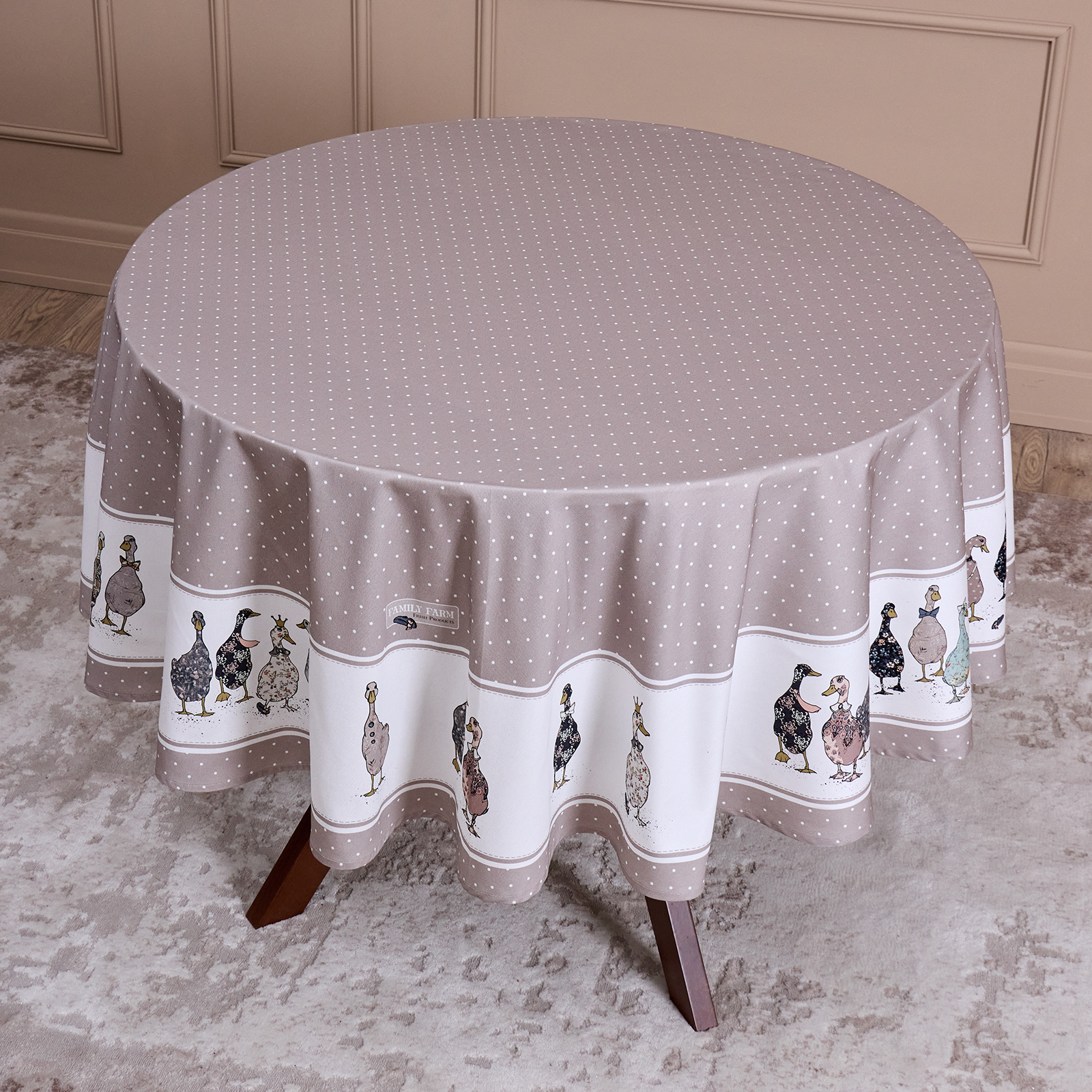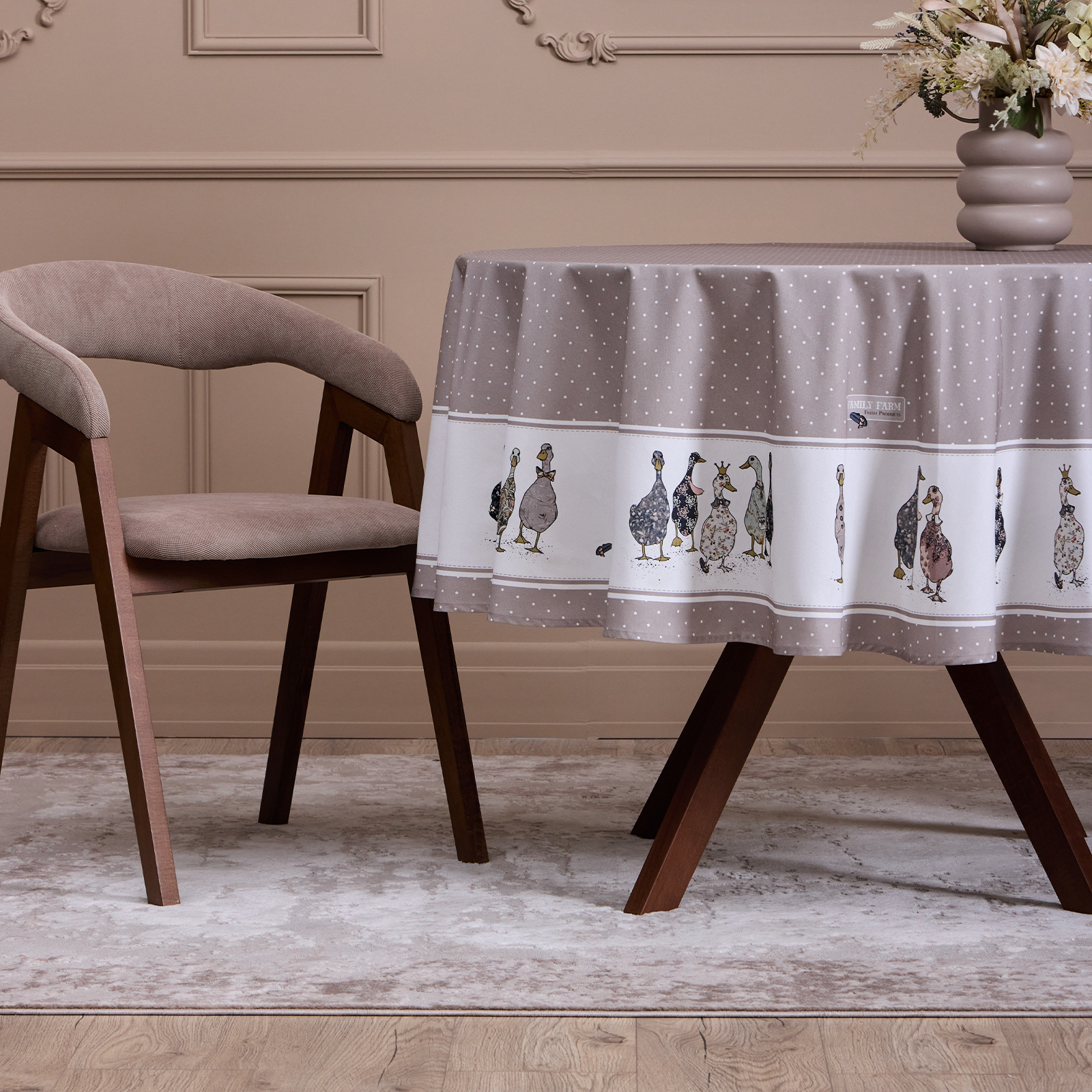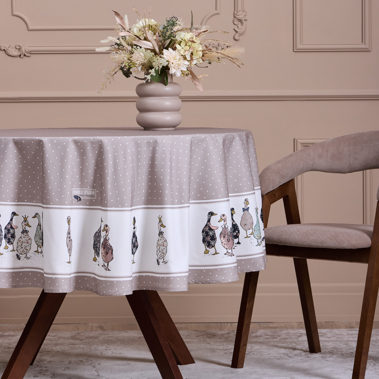 Дизайн в цвете капучино с мелким горохом дополнен декоративной вставкой с изображением домашних гусей — оригинальный принт придаёт интерьеру индивидуальность и тёплую, уютную атмосферу. Скатерть отлично подойдёт для круглых столов диаметром 100–120 см, обеспечивая аккуратный свес. Цифровая печать гарантирует стойкость рисунка даже после многократных стирок.