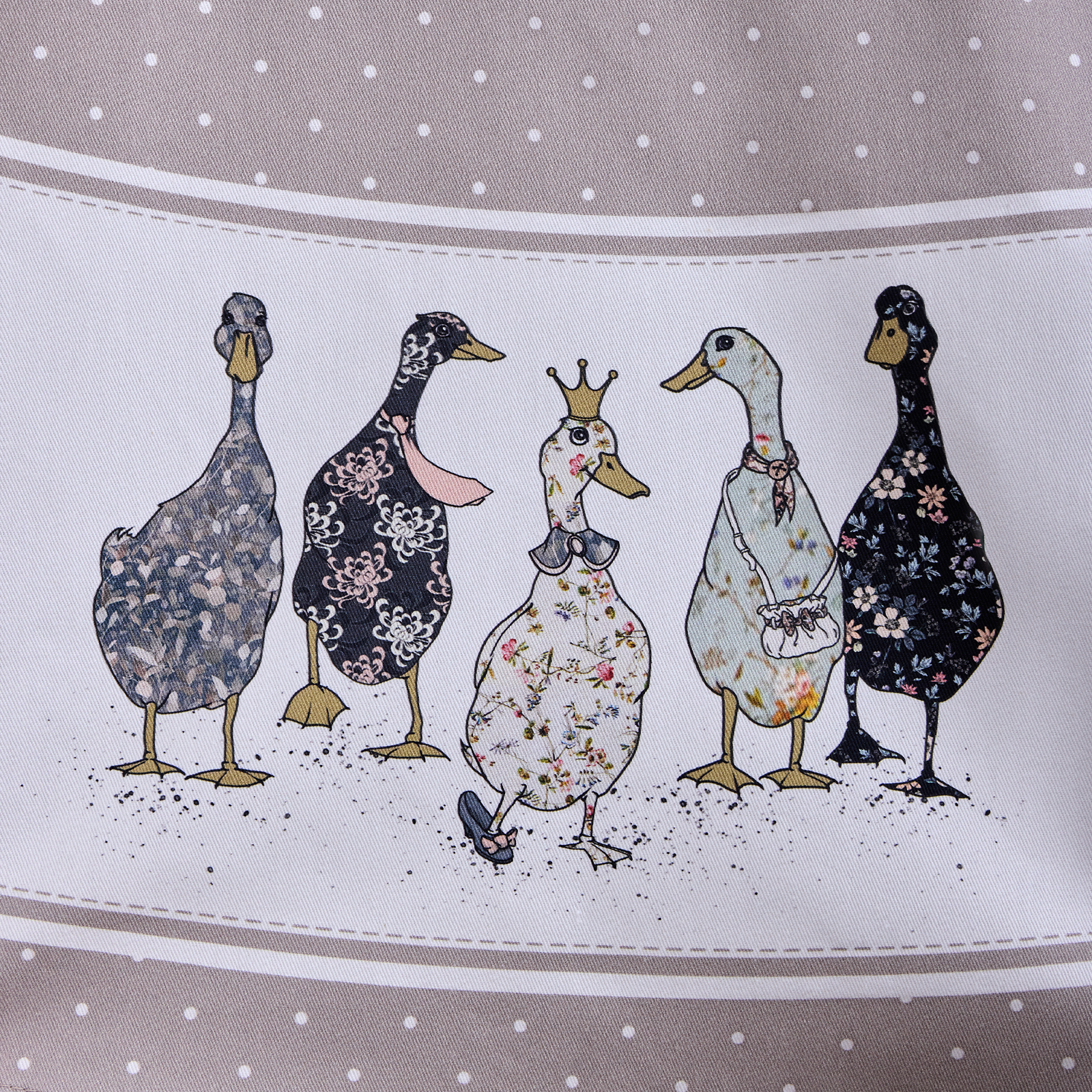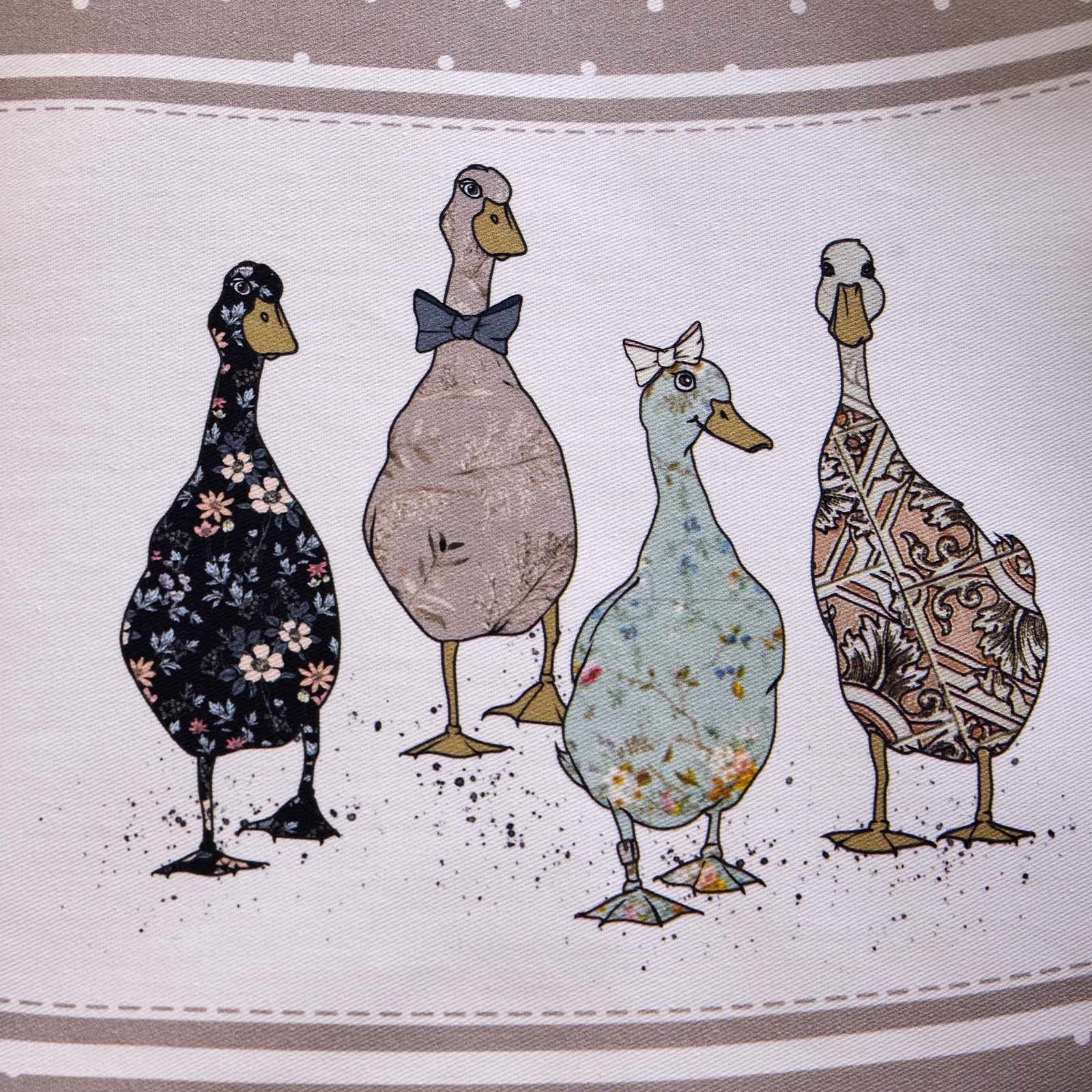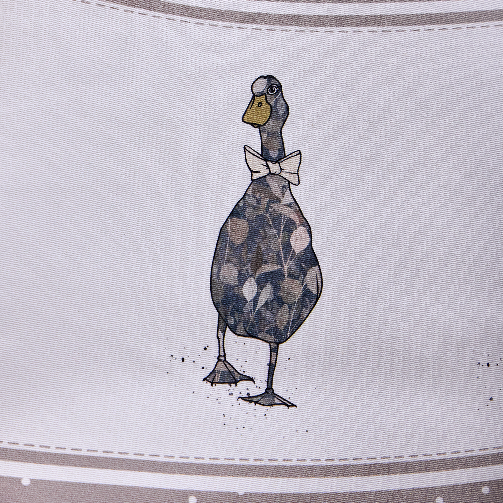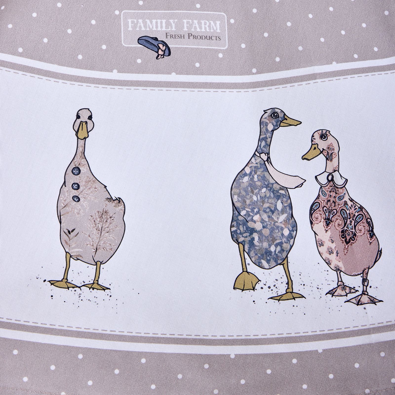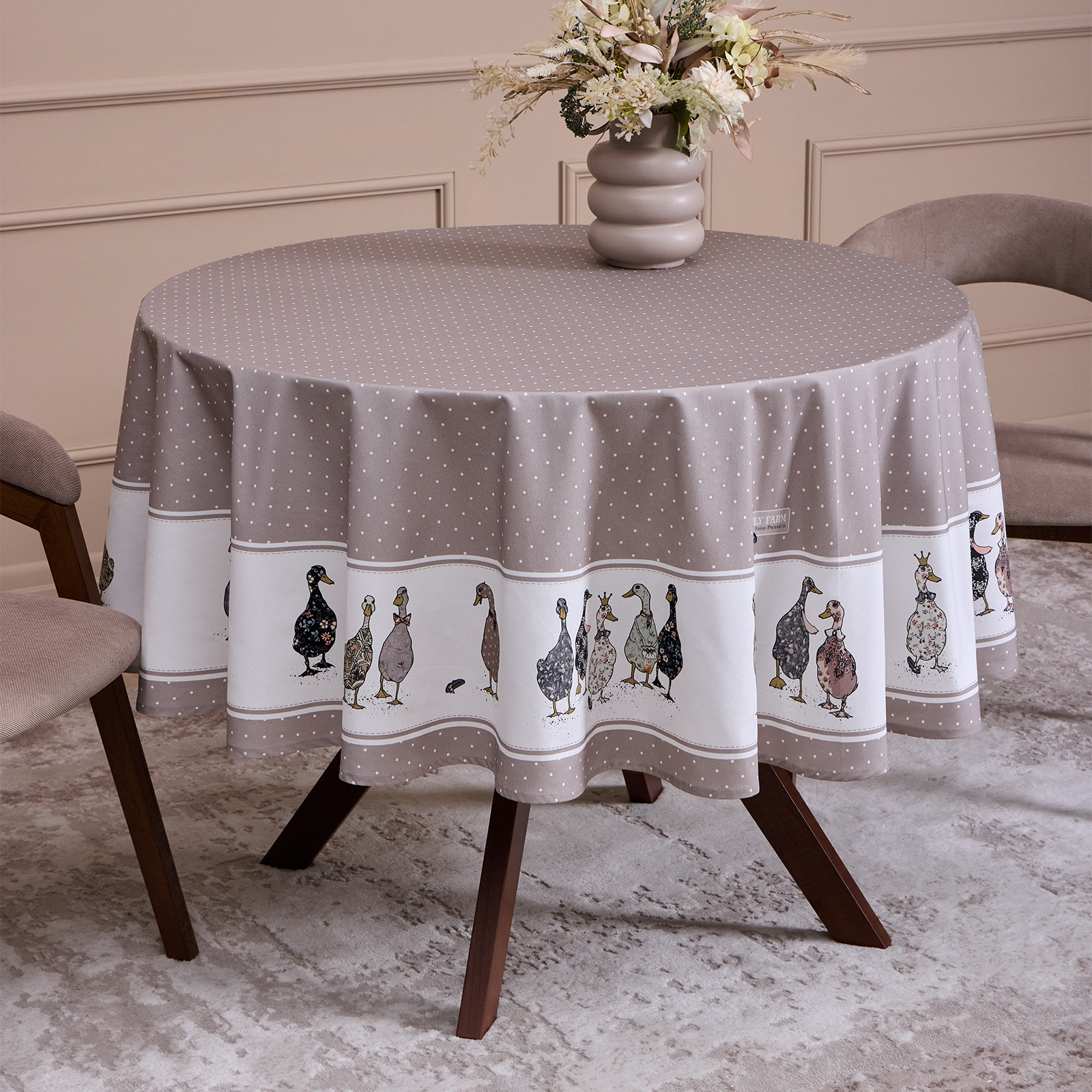 Дизайн в цвете капучино с мелким горохом дополнен декоративной вставкой с изображением домашних гусей — оригинальный принт придаёт интерьеру индивидуальность и тёплую, уютную атмосферу. Скатерть отлично подойдёт для круглых столов диаметром 100–120 см, обеспечивая аккуратный свес. Цифровая печать гарантирует стойкость рисунка даже после многократных стирок.