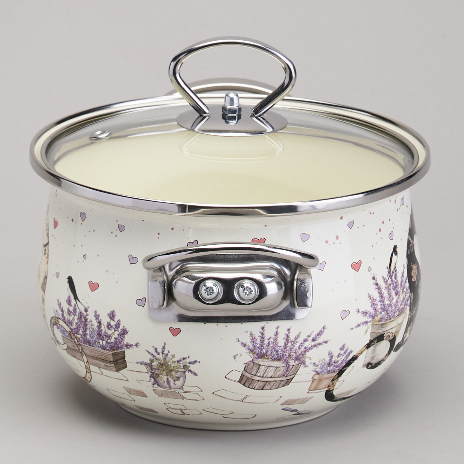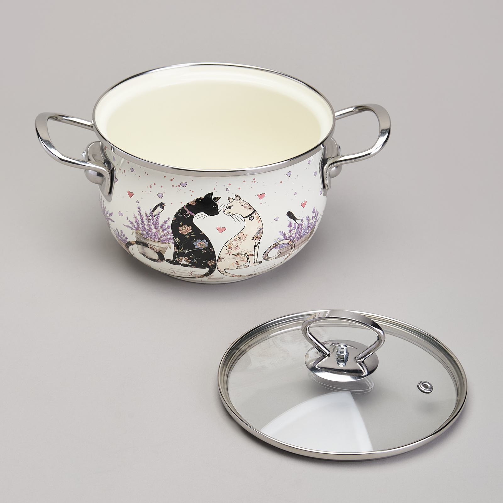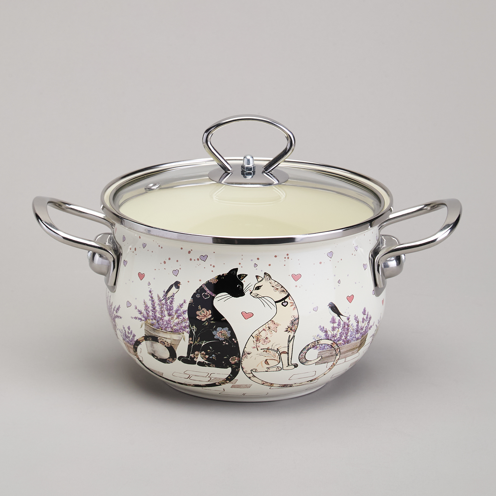 КАСТРЮЛЯ AGNESS ЭМАЛИРОВАННАЯ СО СТЕКЛЯННОЙ КРЫШКОЙ СЕРИЯ "LAVENDER CATS", 2,0 Л ДИА. 18СМ