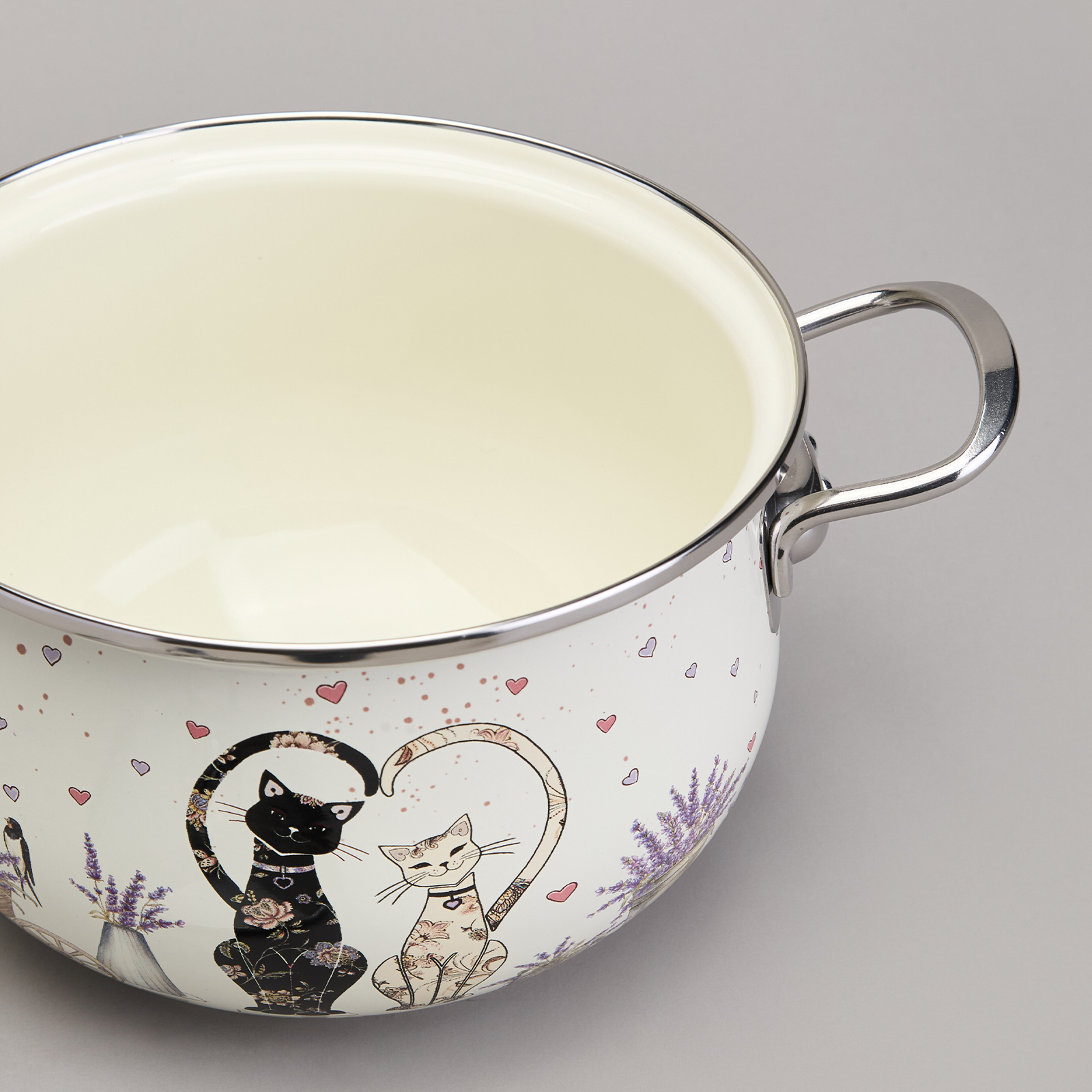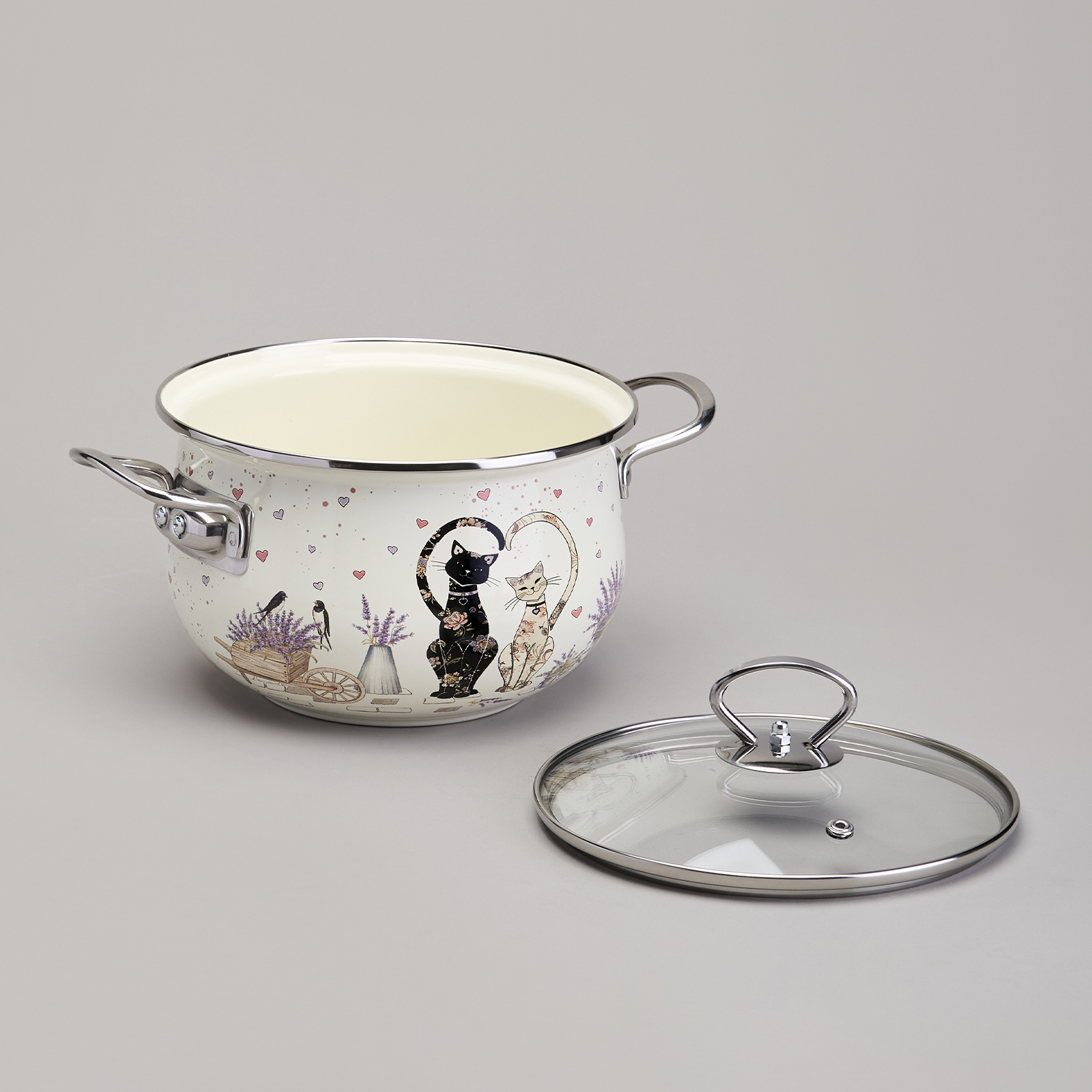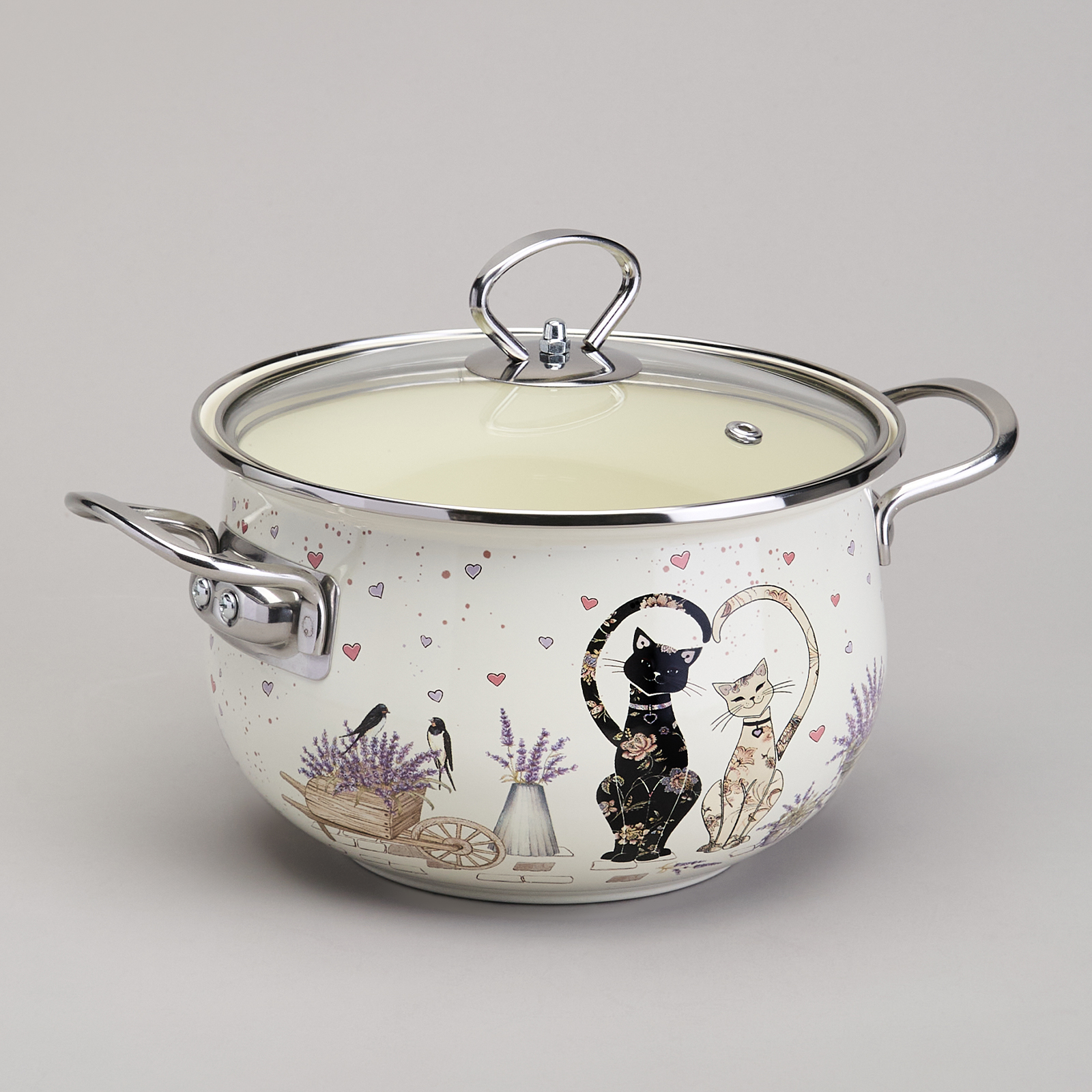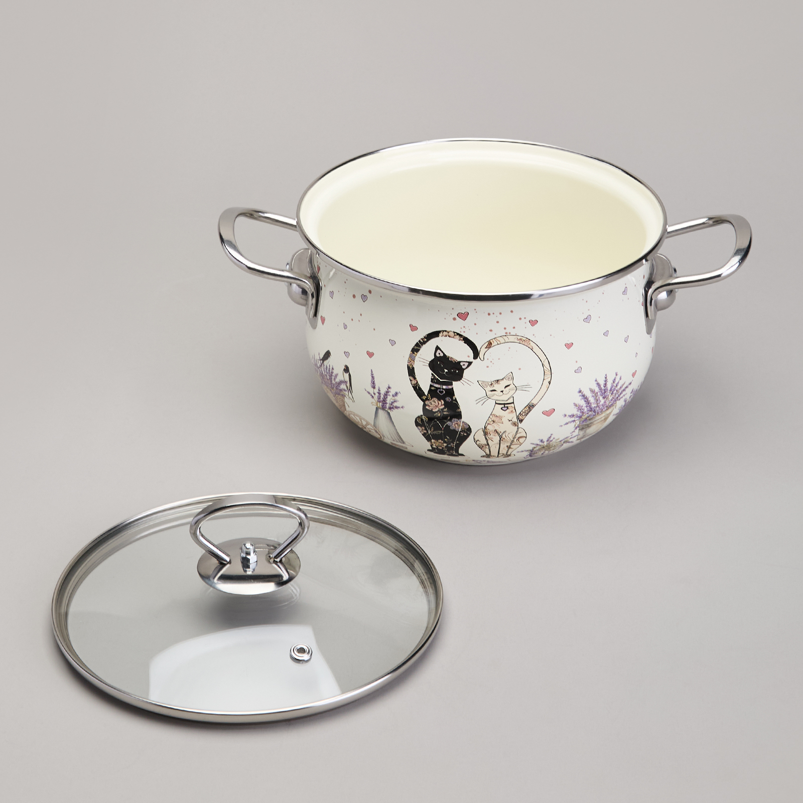 КАСТРЮЛЯ AGNESS ЭМАЛИРОВАННАЯ СО СТЕКЛЯННОЙ КРЫШКОЙ СЕРИЯ "LAVENDER CATS", 2,8 Л ДИА. 20СМ