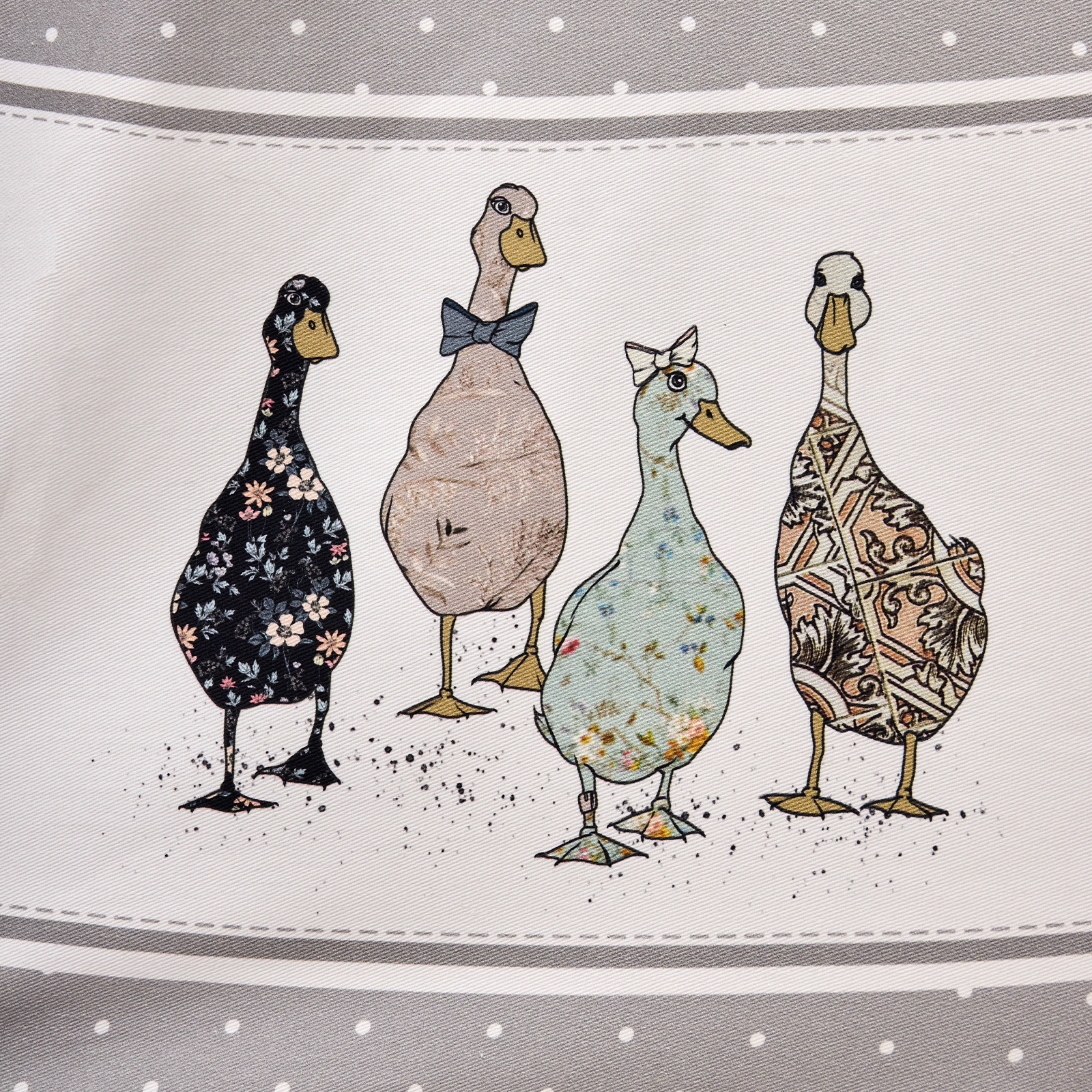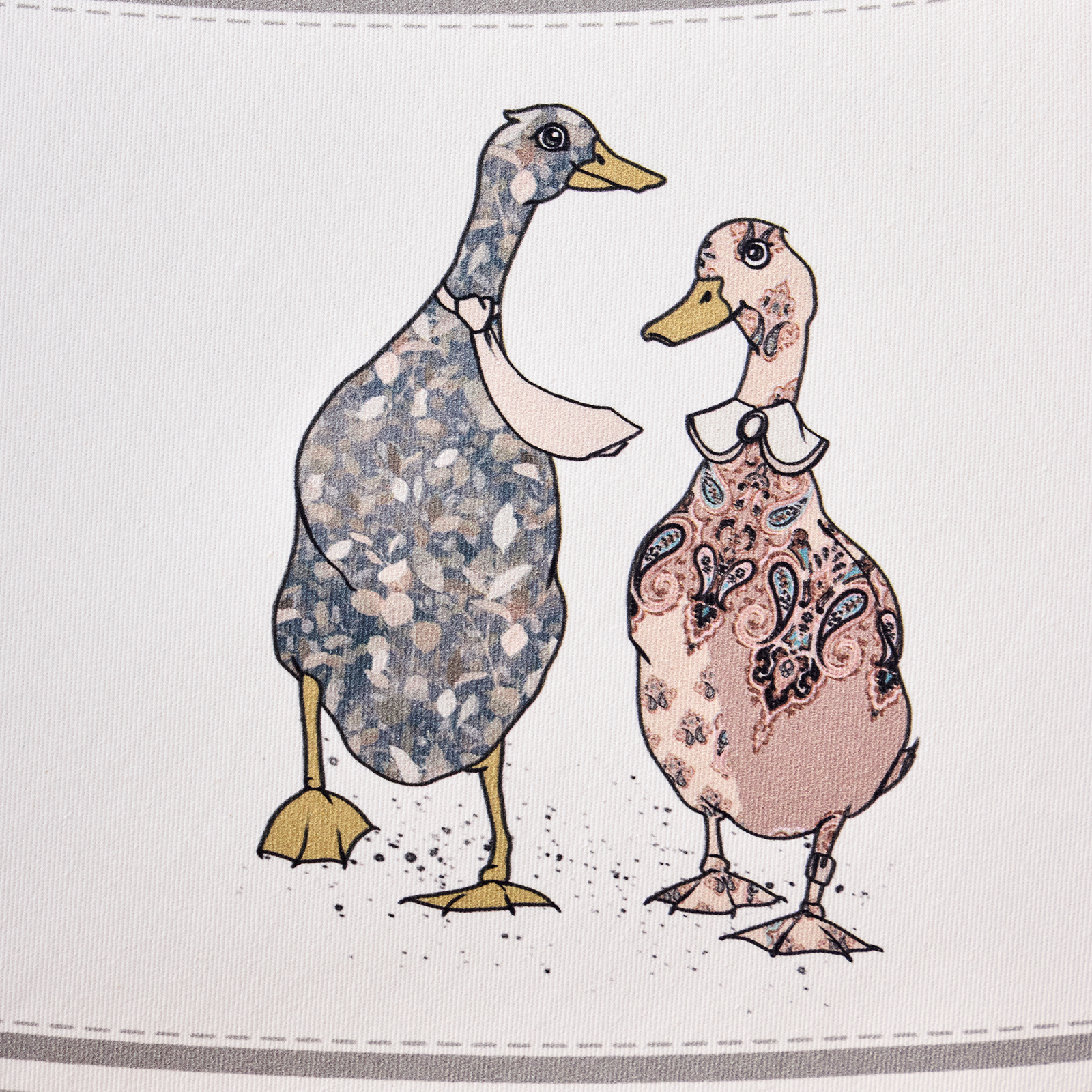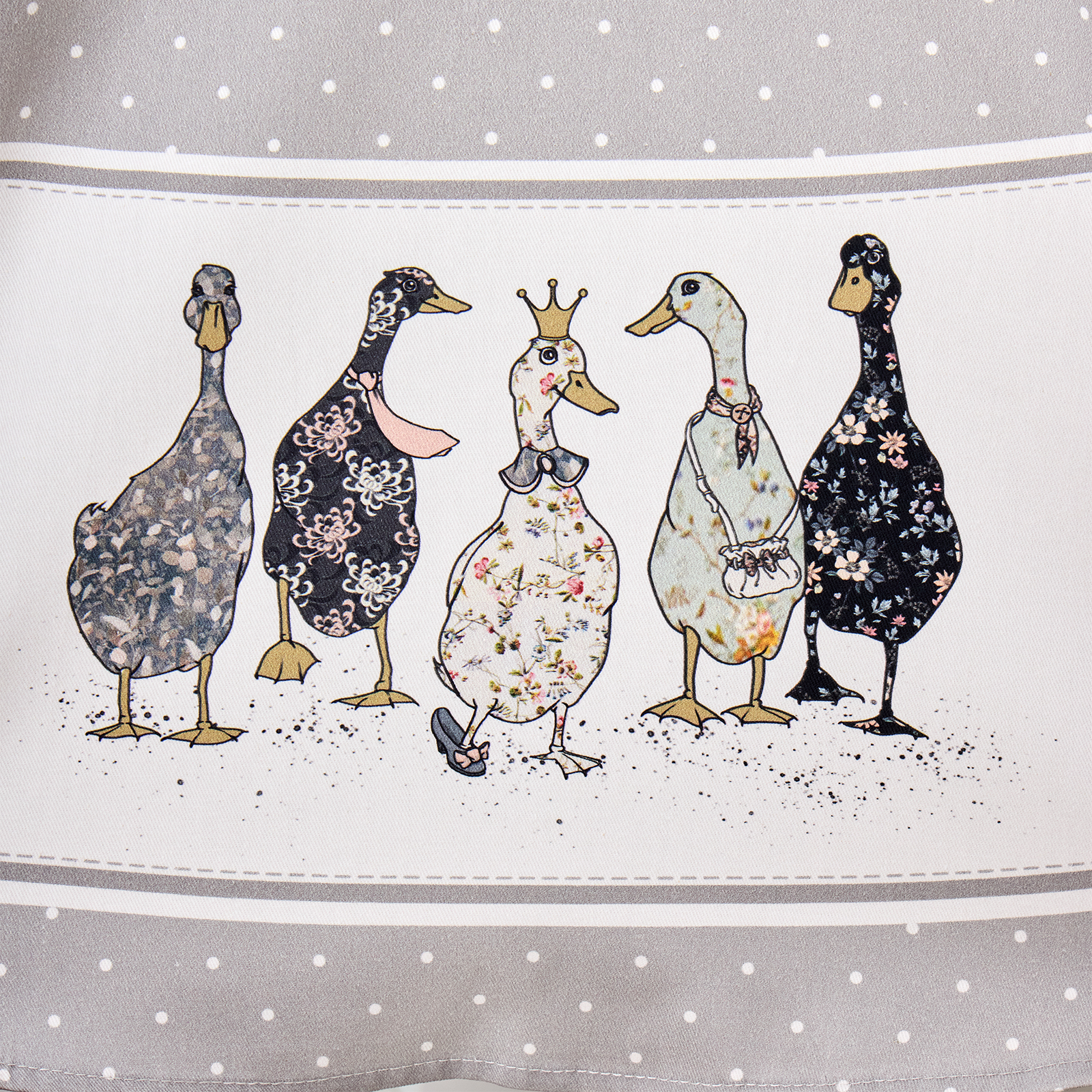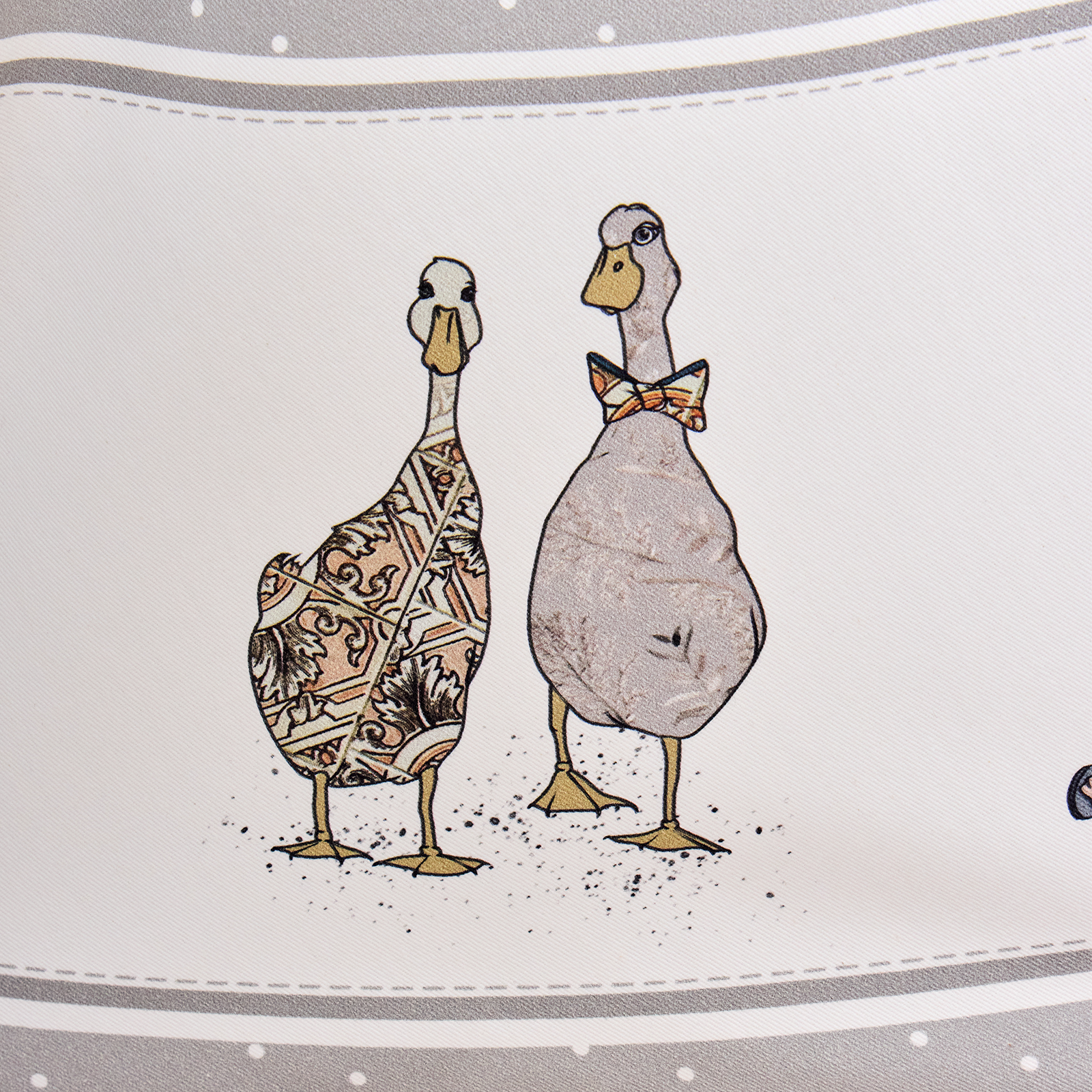 Дизайн в светло-сером цвете с мелким горохом дополнен декоративной каймой по нижнему краю с изображением домашних гусей. Такой принт добавляет интерьеру индивидуальности и уюта, идеально подходит как для городской квартиры, так и для загородного дома. Цифровая печать гарантирует насыщенность и стойкость цветов даже после многократных стирок.