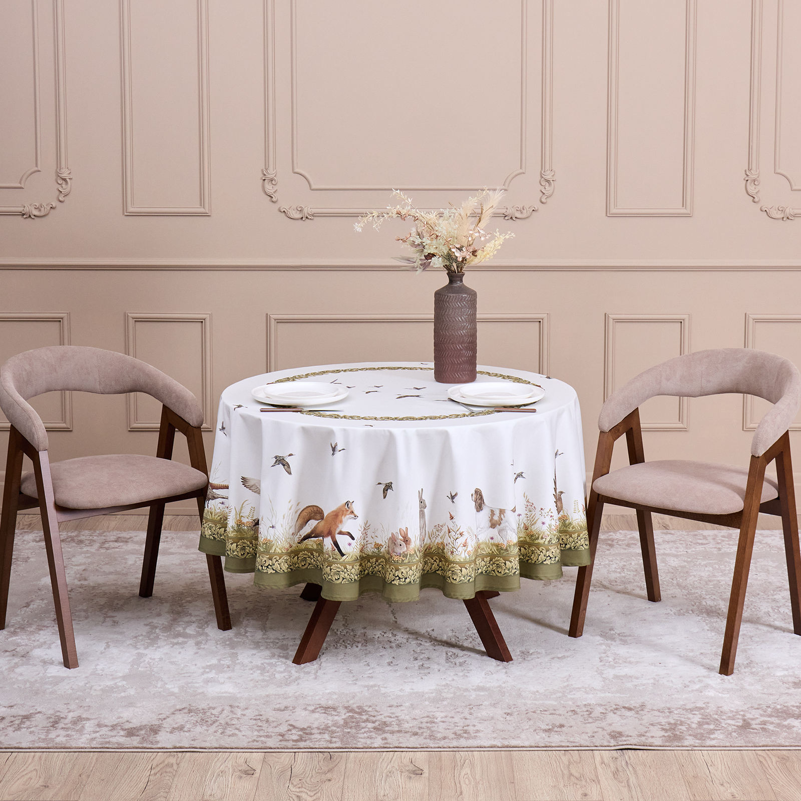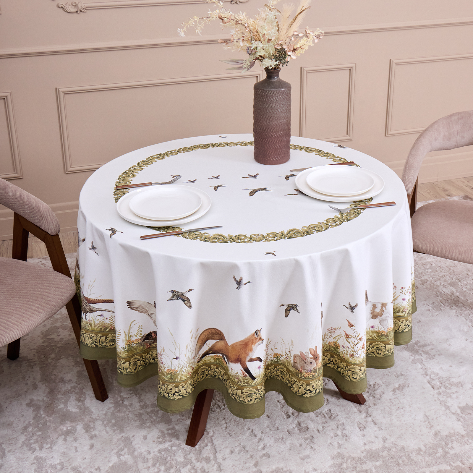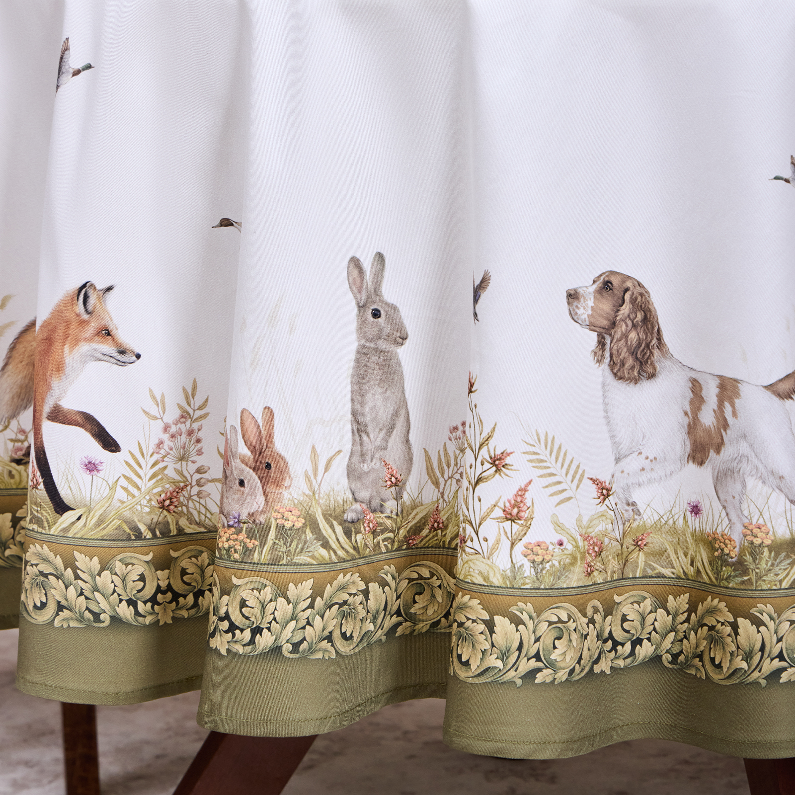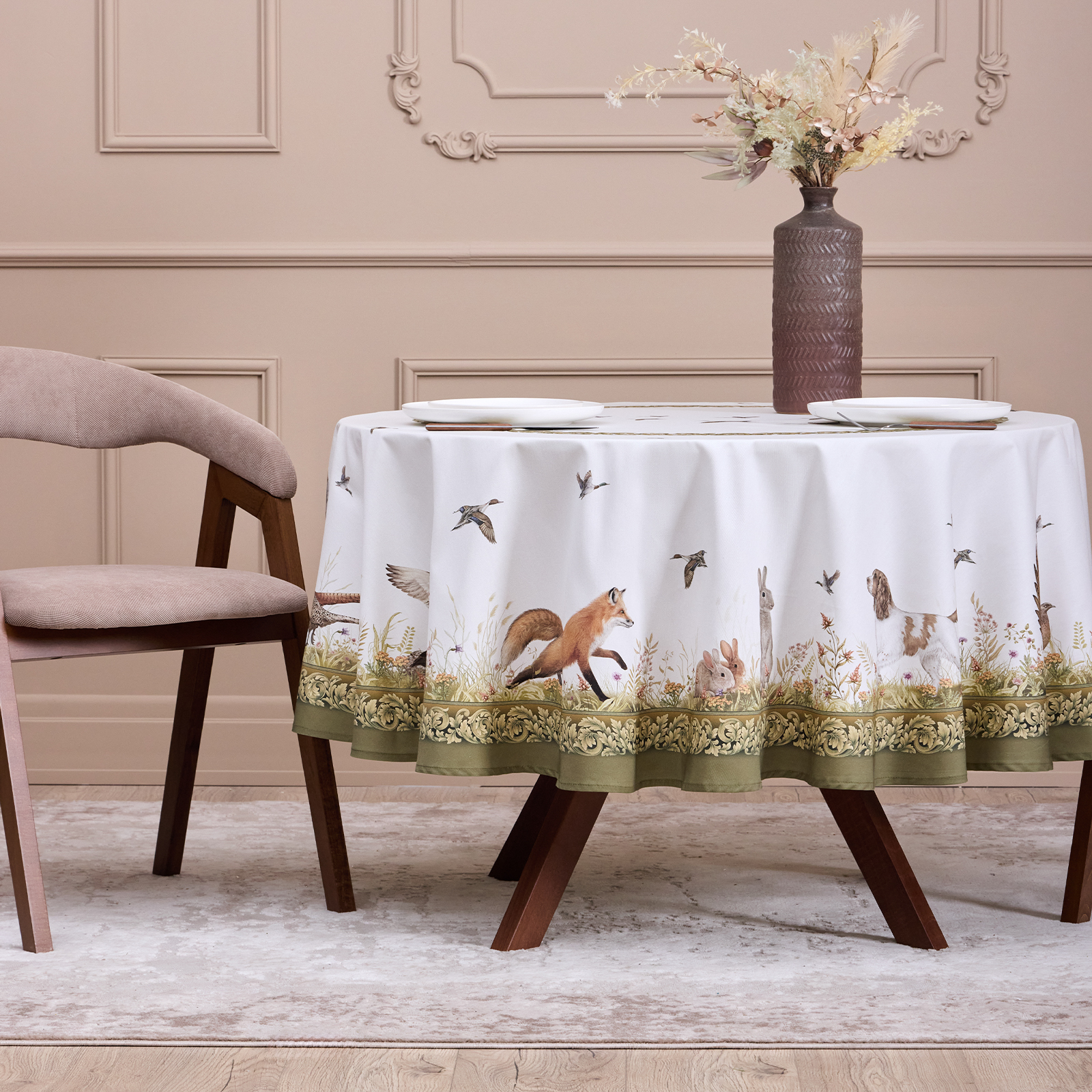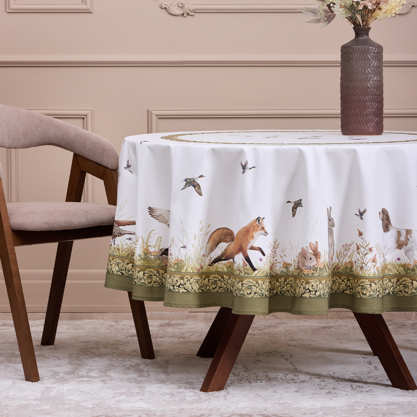 Скатерть оформлена принтом в охотничьей тематике: на светлом фоне изображены лесные животные — лиса, утки, фазаны — в окружении трав и кустарников. Декоративная зелёная кайма подчёркивает сюжет и добавляет текстилю выразительности. Цвета нанесены методом цифровой печати, что гарантирует стойкость красок и детализацию даже после многократных стирок.