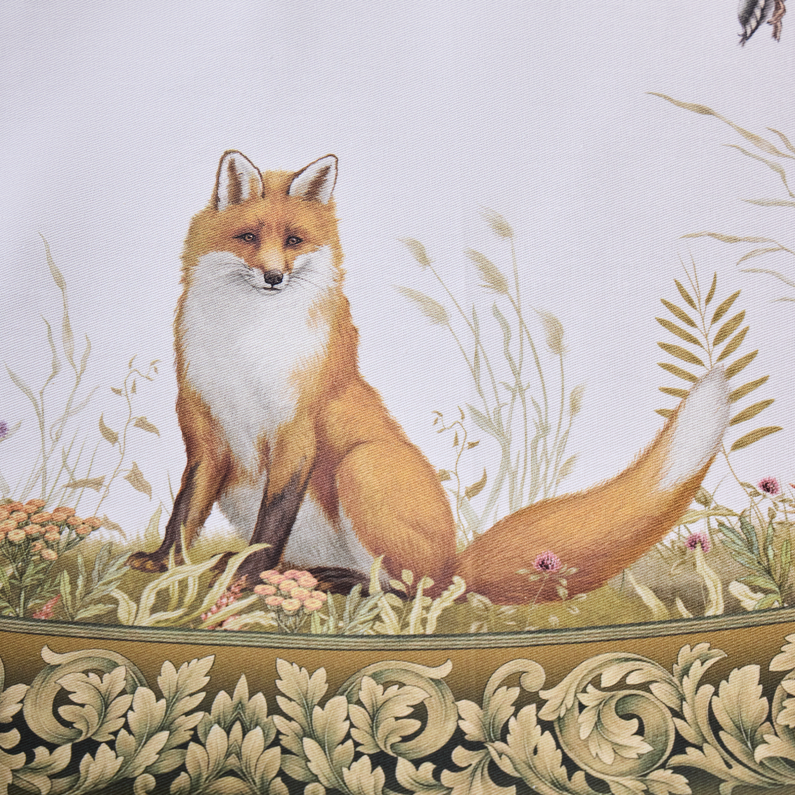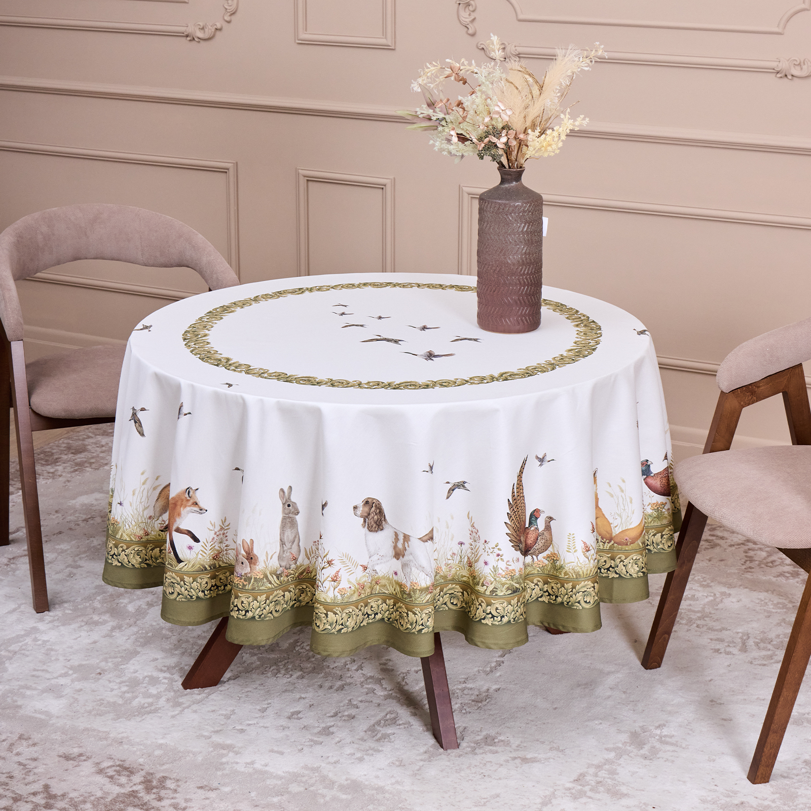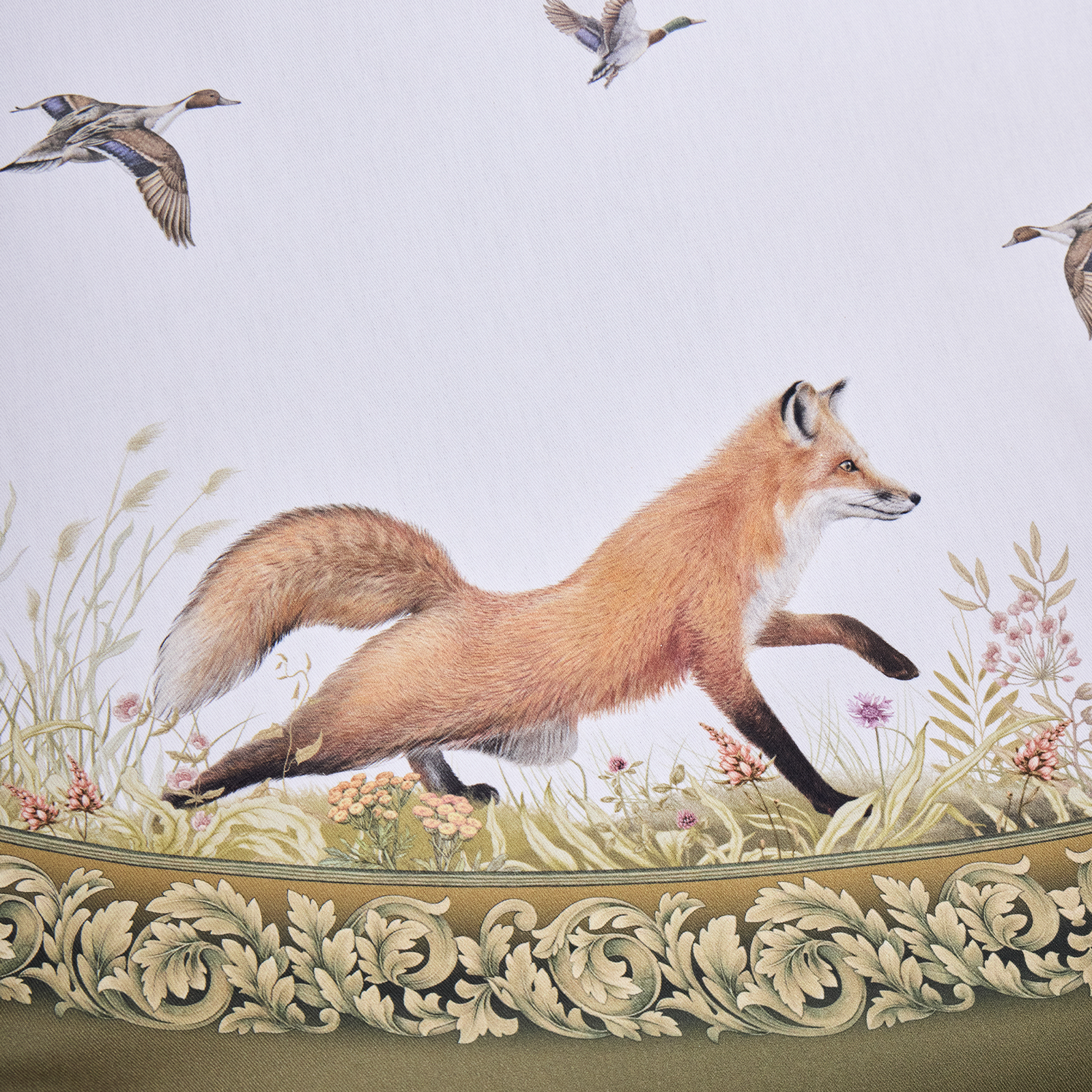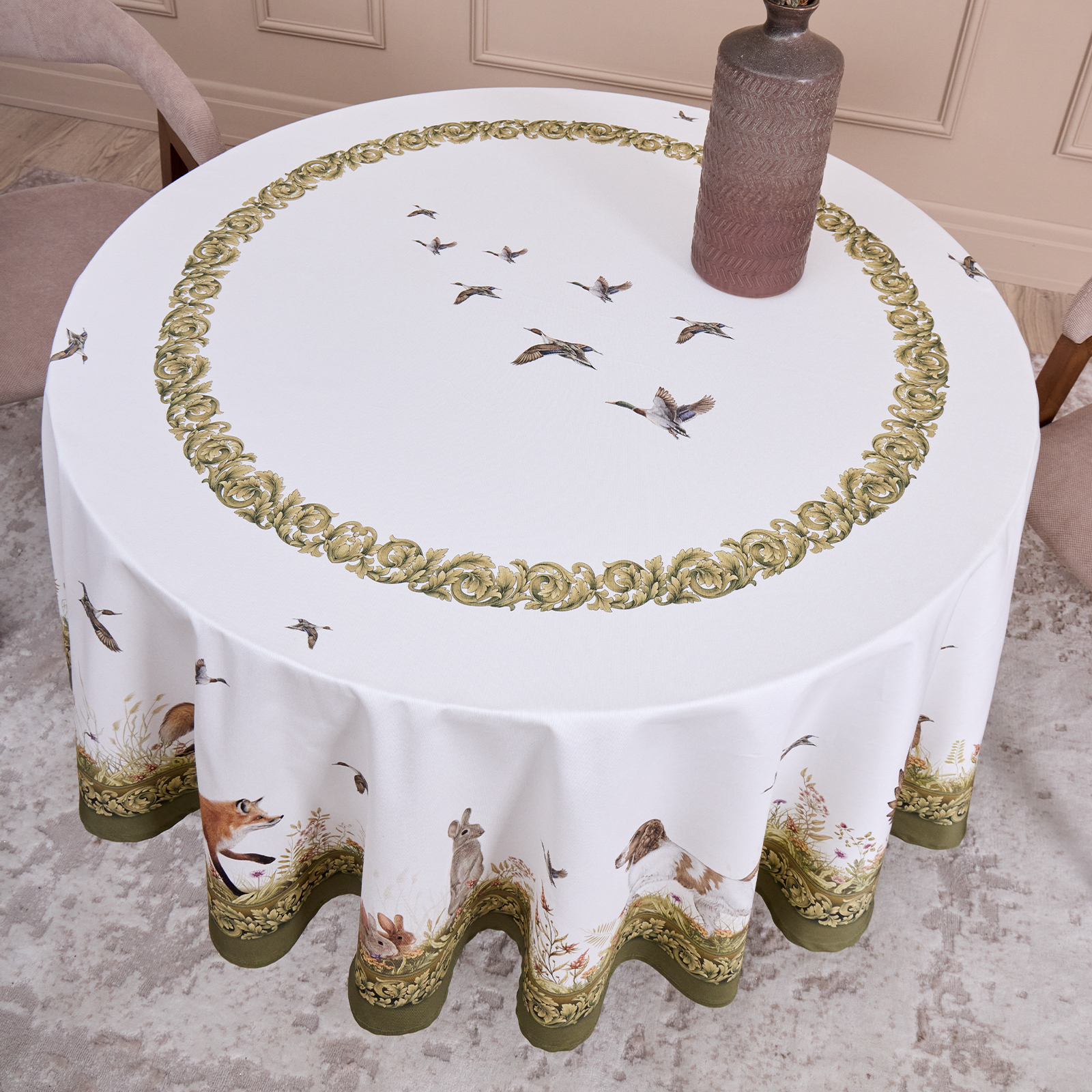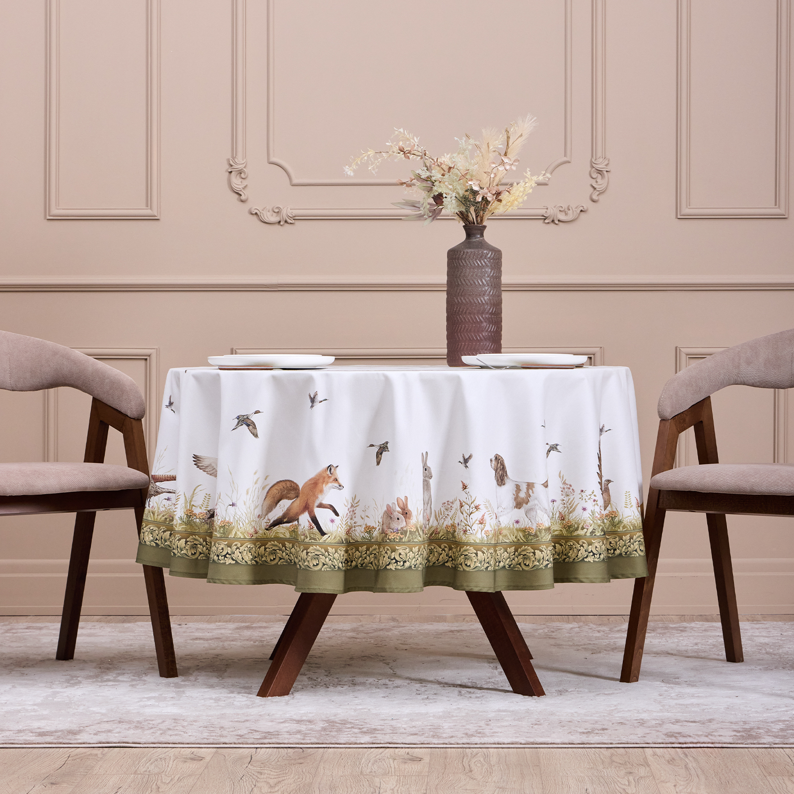 Скатерть оформлена принтом в охотничьей тематике: на светлом фоне изображены лесные животные — лиса, утки, фазаны — в окружении трав и кустарников. Декоративная зелёная кайма подчёркивает сюжет и добавляет текстилю выразительности. Цвета нанесены методом цифровой печати, что гарантирует стойкость красок и детализацию даже после многократных стирок.