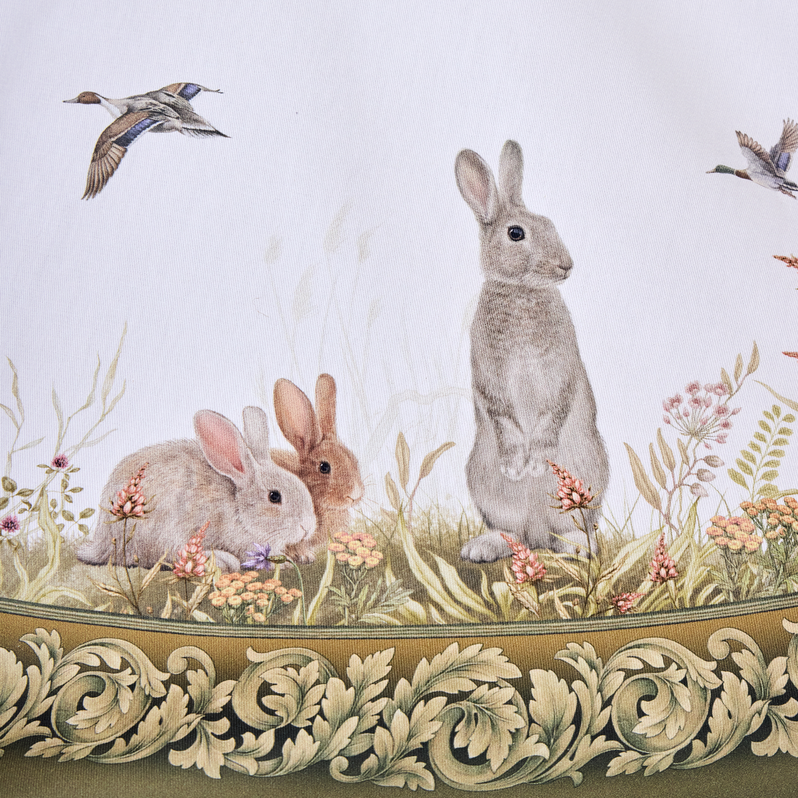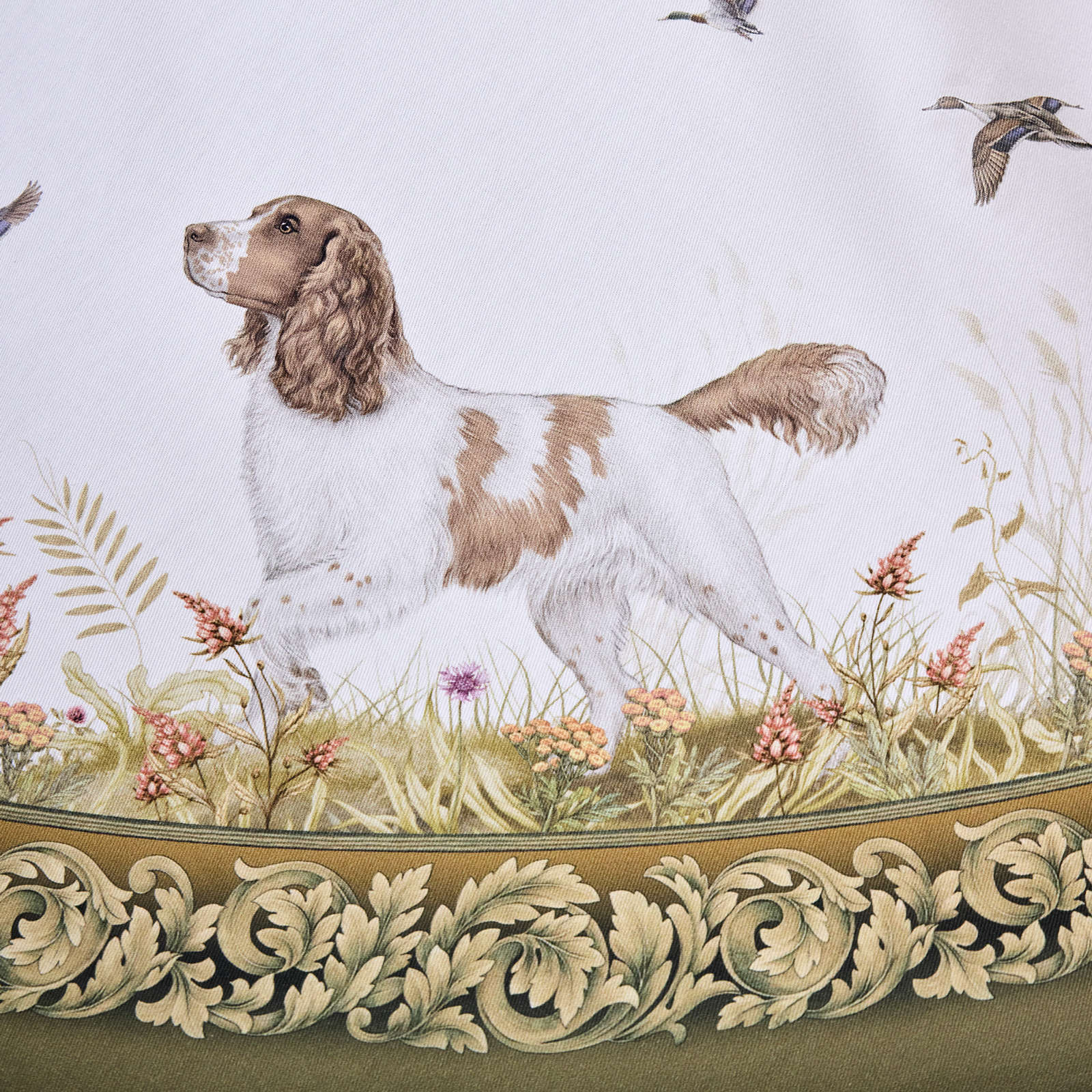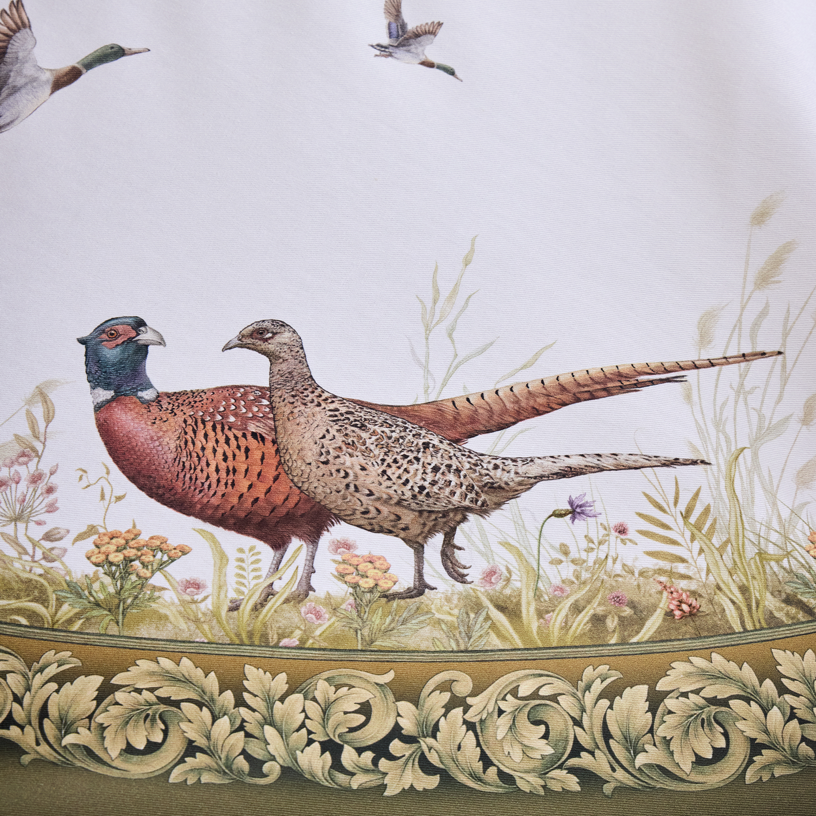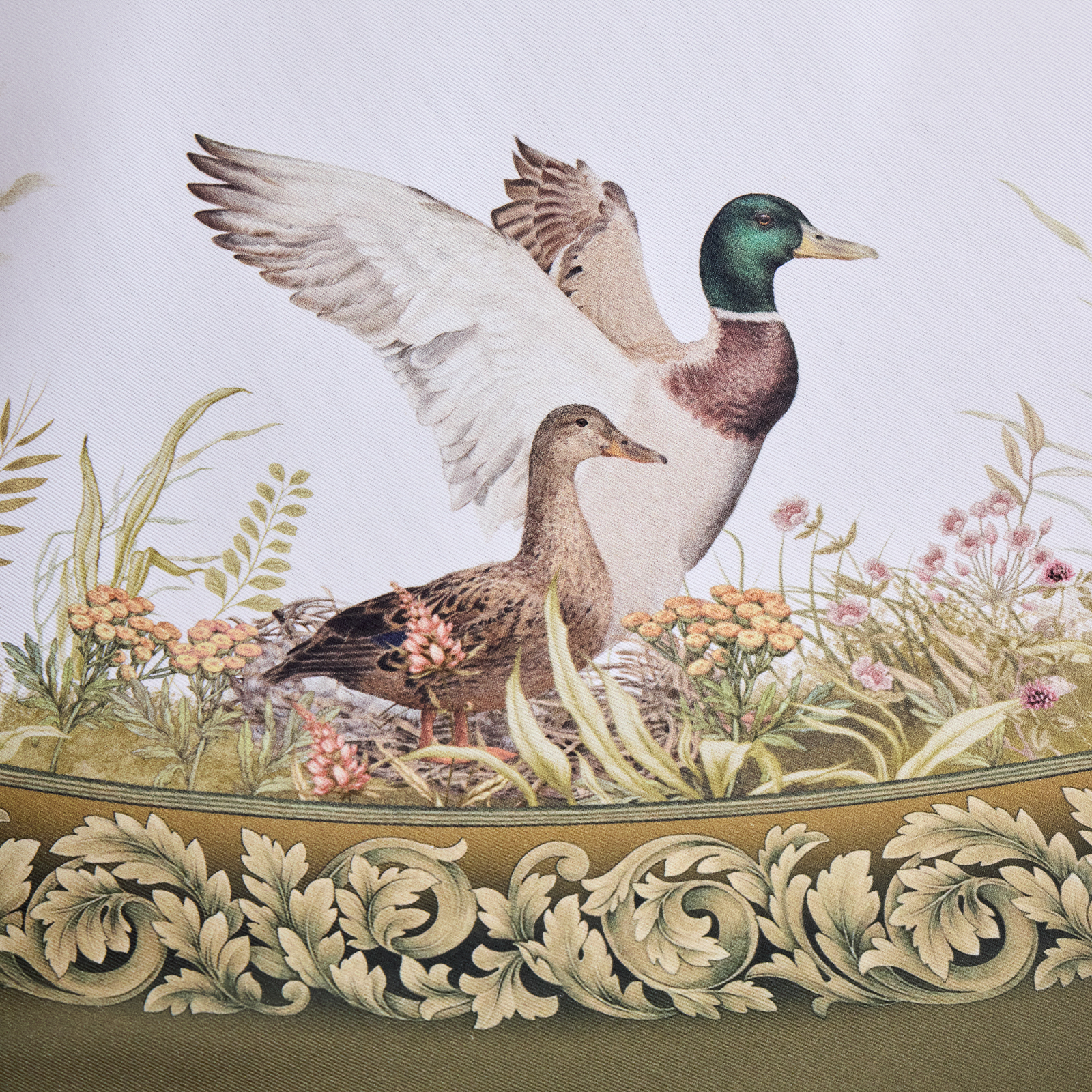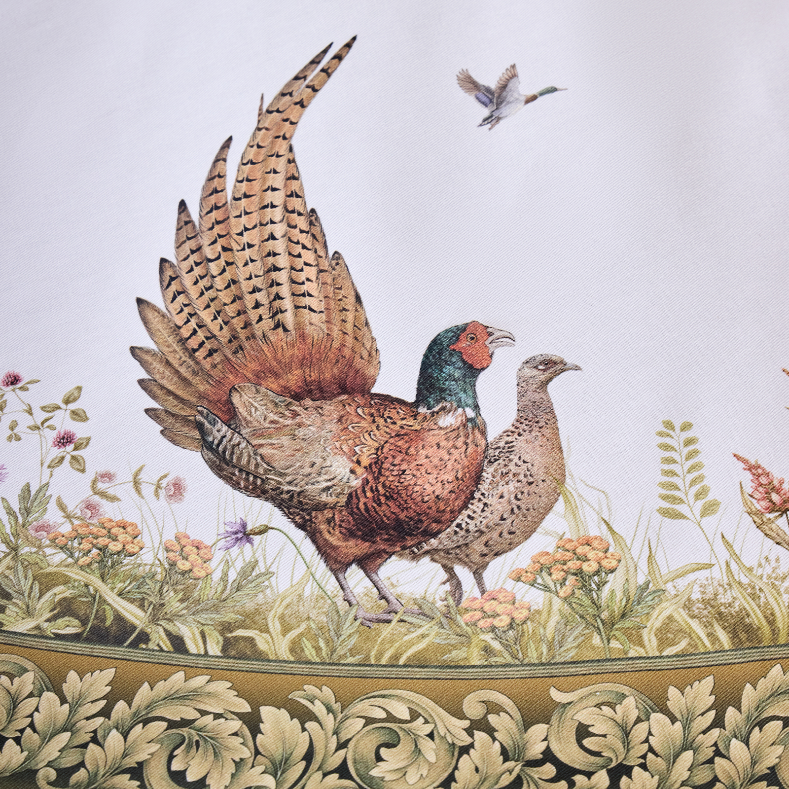 Скатерть оформлена принтом в охотничьей тематике: на светлом фоне изображены лесные животные — лиса, утки, фазаны — в окружении трав и кустарников. Декоративная зелёная кайма подчёркивает сюжет и добавляет текстилю выразительности. Цвета нанесены методом цифровой печати, что гарантирует стойкость красок и детализацию даже после многократных стирок.