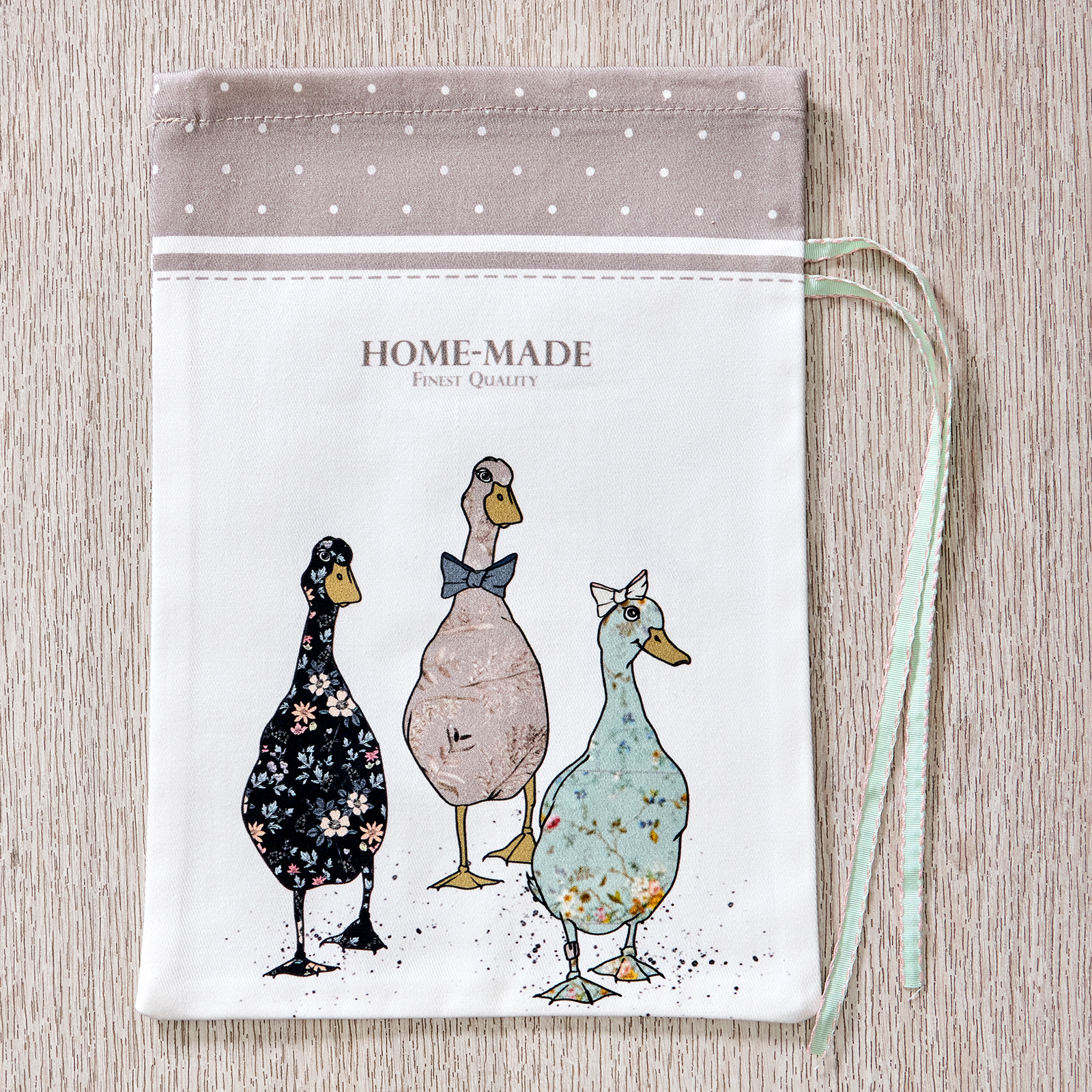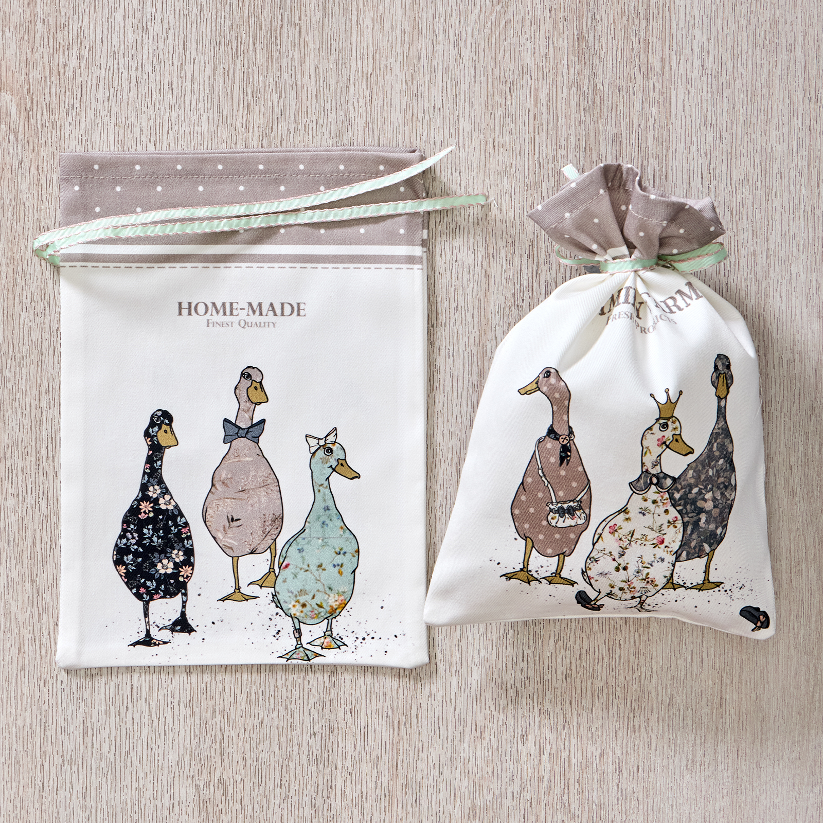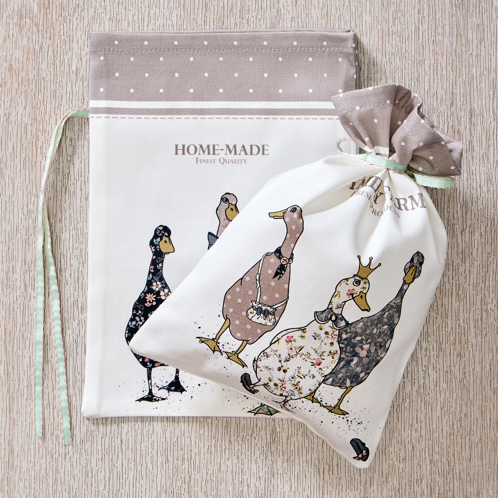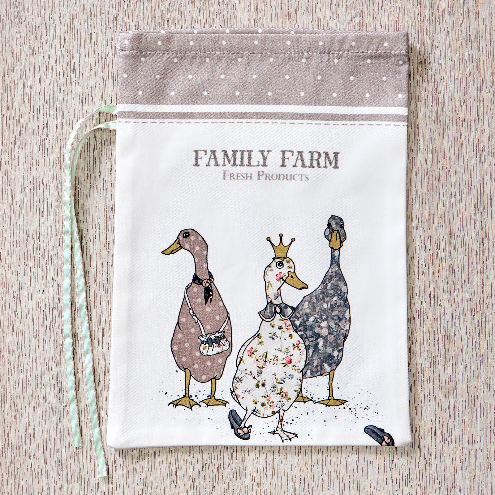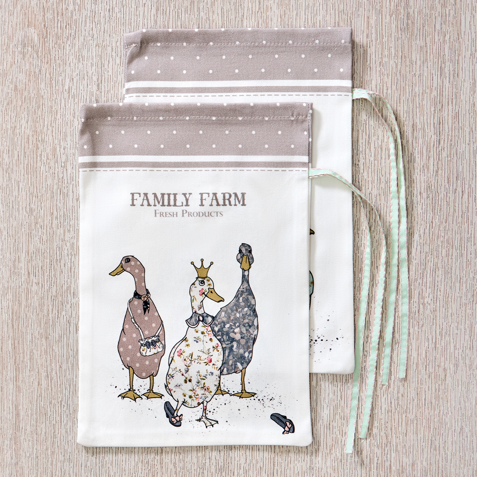 На мешочках нанесена надпись "Family Farm" и изображены гуси — этот принт придаёт изделиям уютный деревенский шарм. Удобная шнуровка позволяет быстро и аккуратно упаковать содержимое.