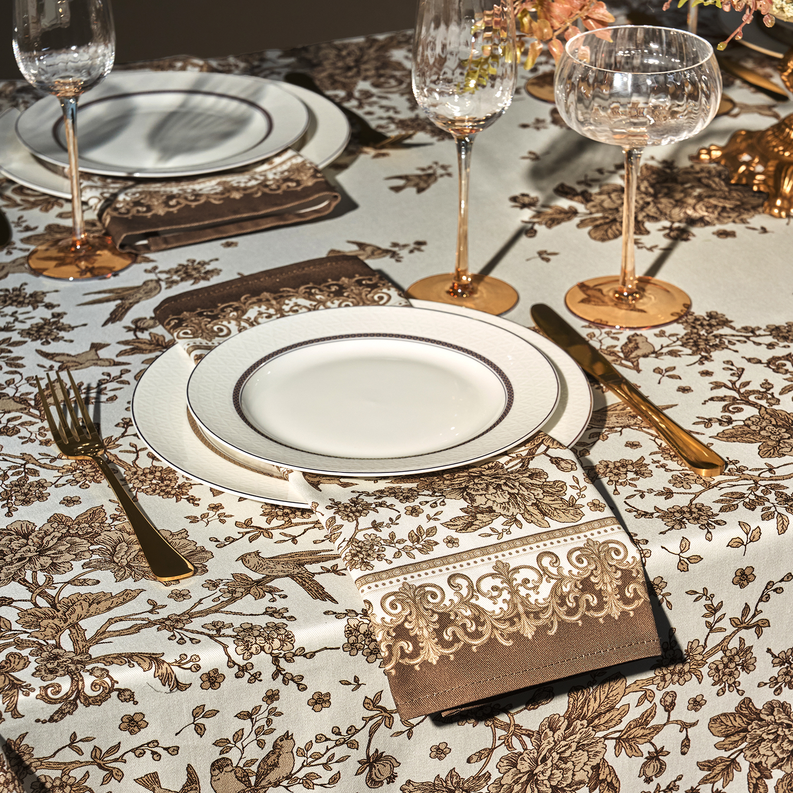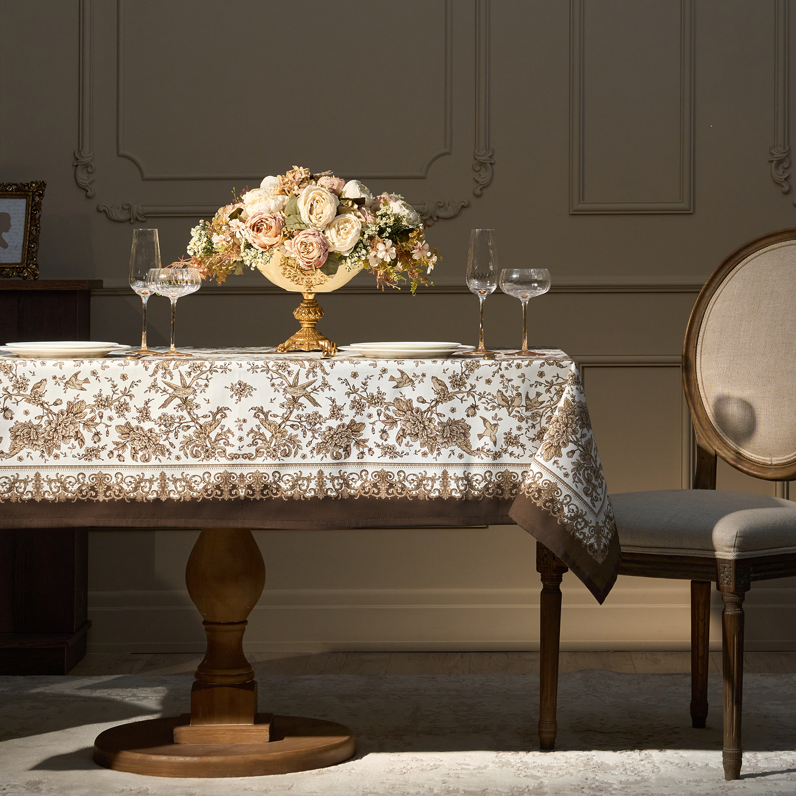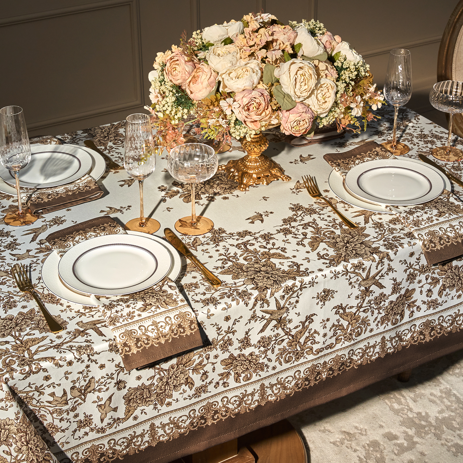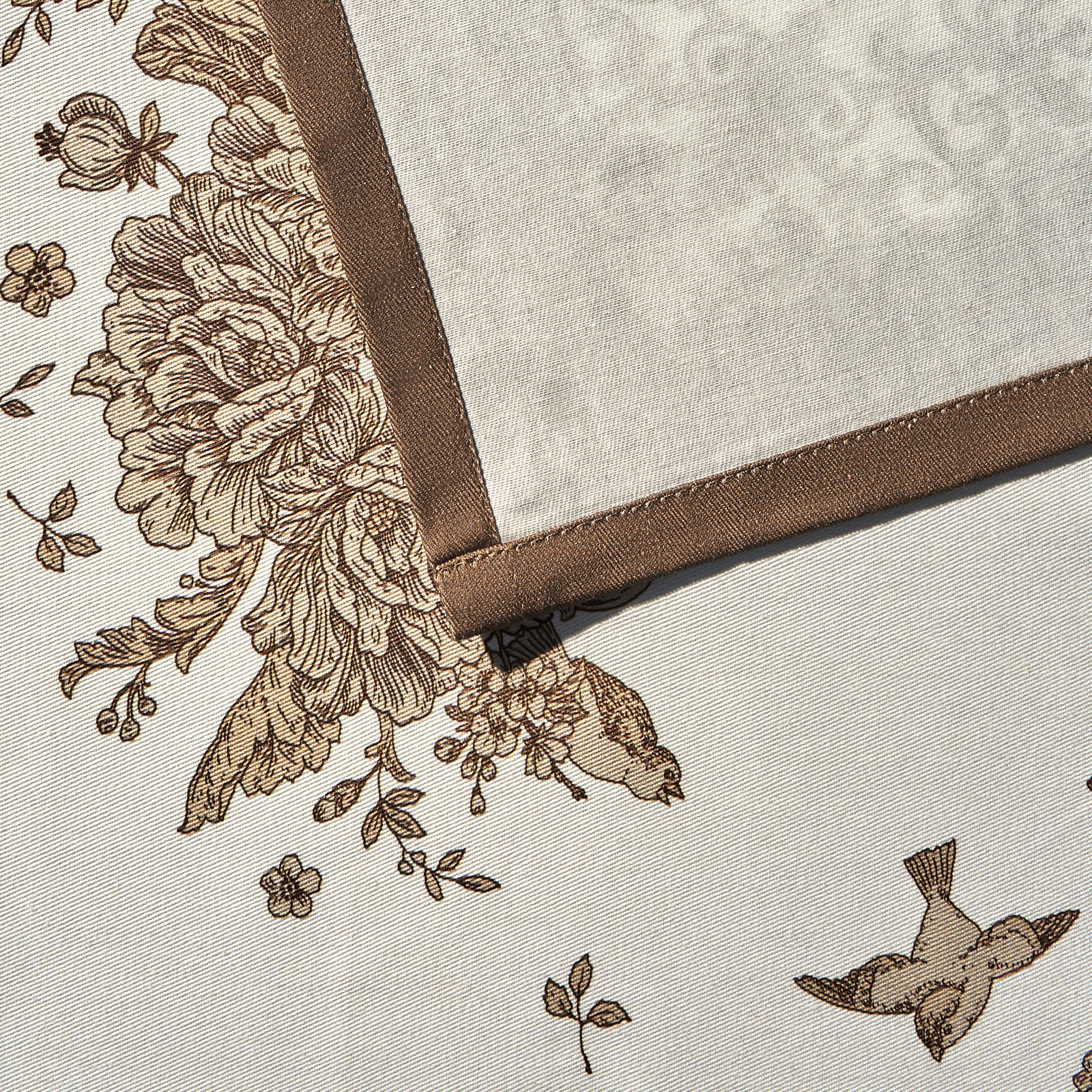 Размер 140x180 см делает её универсальной для различных форм столов, включая прямоугольные и овальные. Коричнево-бежевый оттенок с флористическим узором украсит кухню или столовую, добавив утончённости сервировке.