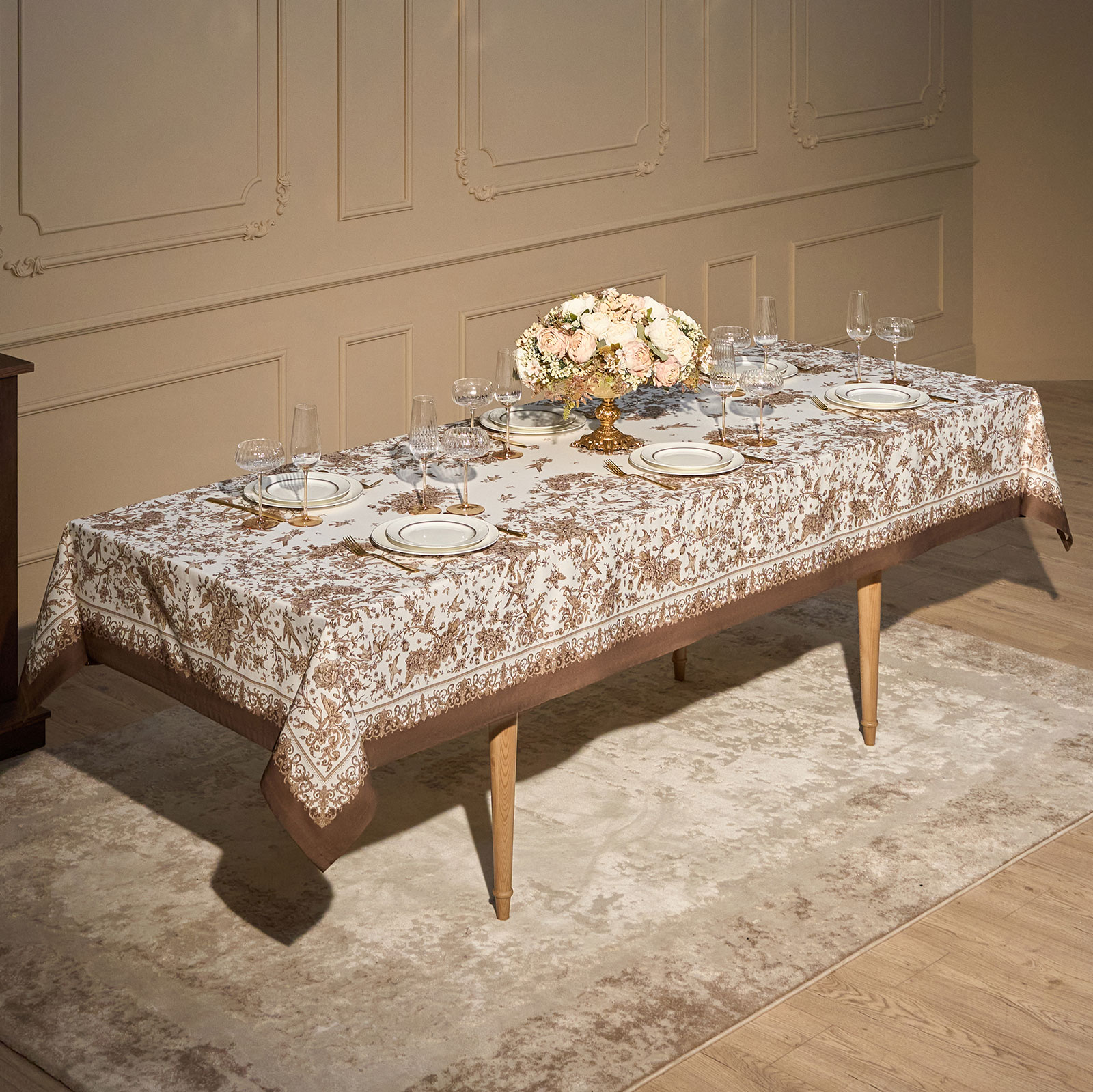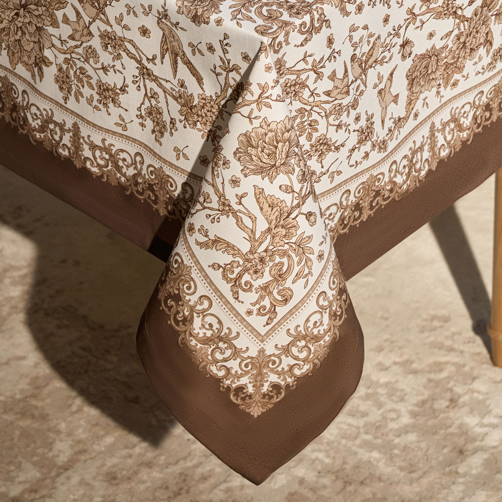 Прямоугольная скатерть Lefard из коллекции "Rich Garden" — идеальный акцент для сервировки большого праздничного стола.Скатерть украшена красивым рисунком с цветами, птицами и узорами в тёплых коричнево-золотистых тонах. Такой дизайн смотрится стильно и уютно, подойдёт как для классической, так и современной сервировки. Он делает интерьер нарядным и создает ощущение уюта и тепла.