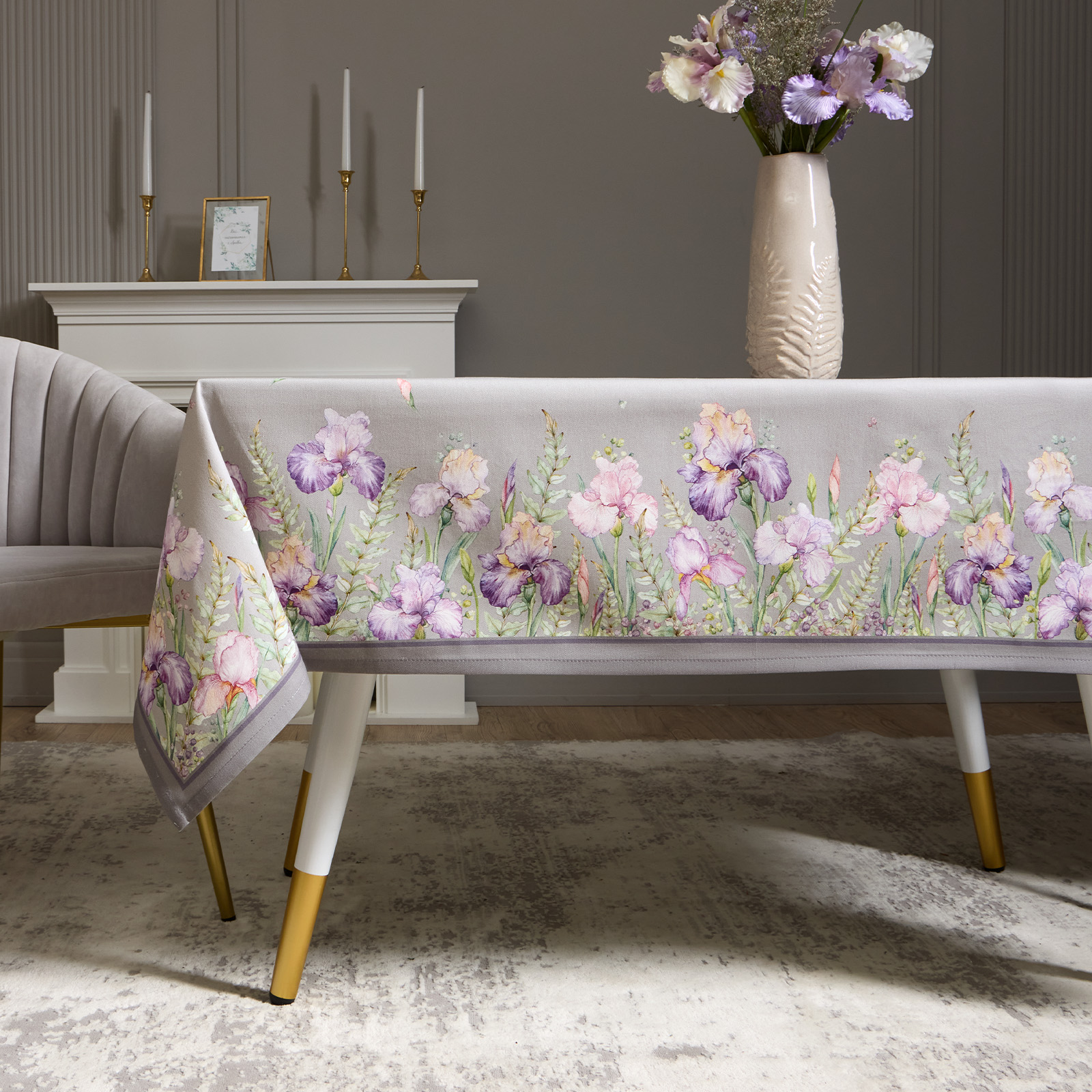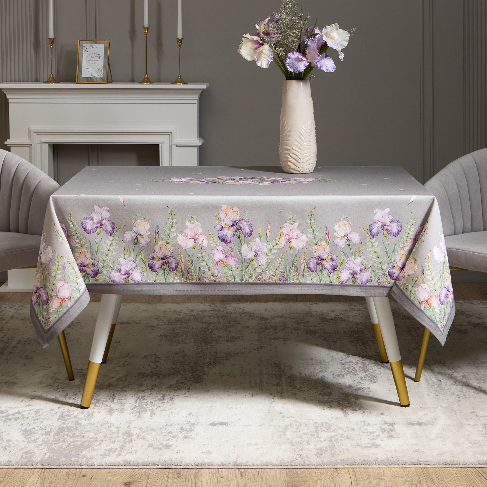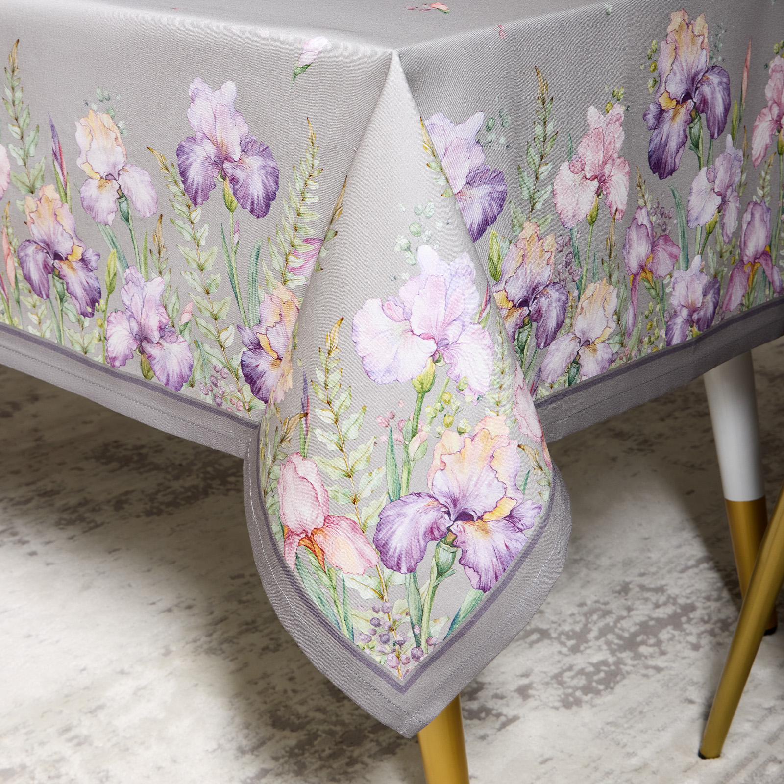Цветочный принт с ирисами нанесён методом цифровой печати — каждый штрих детализирован, оттенки яркие и стойкие. Оформление по периметру делает скатерть эффектной с любого ракурса.