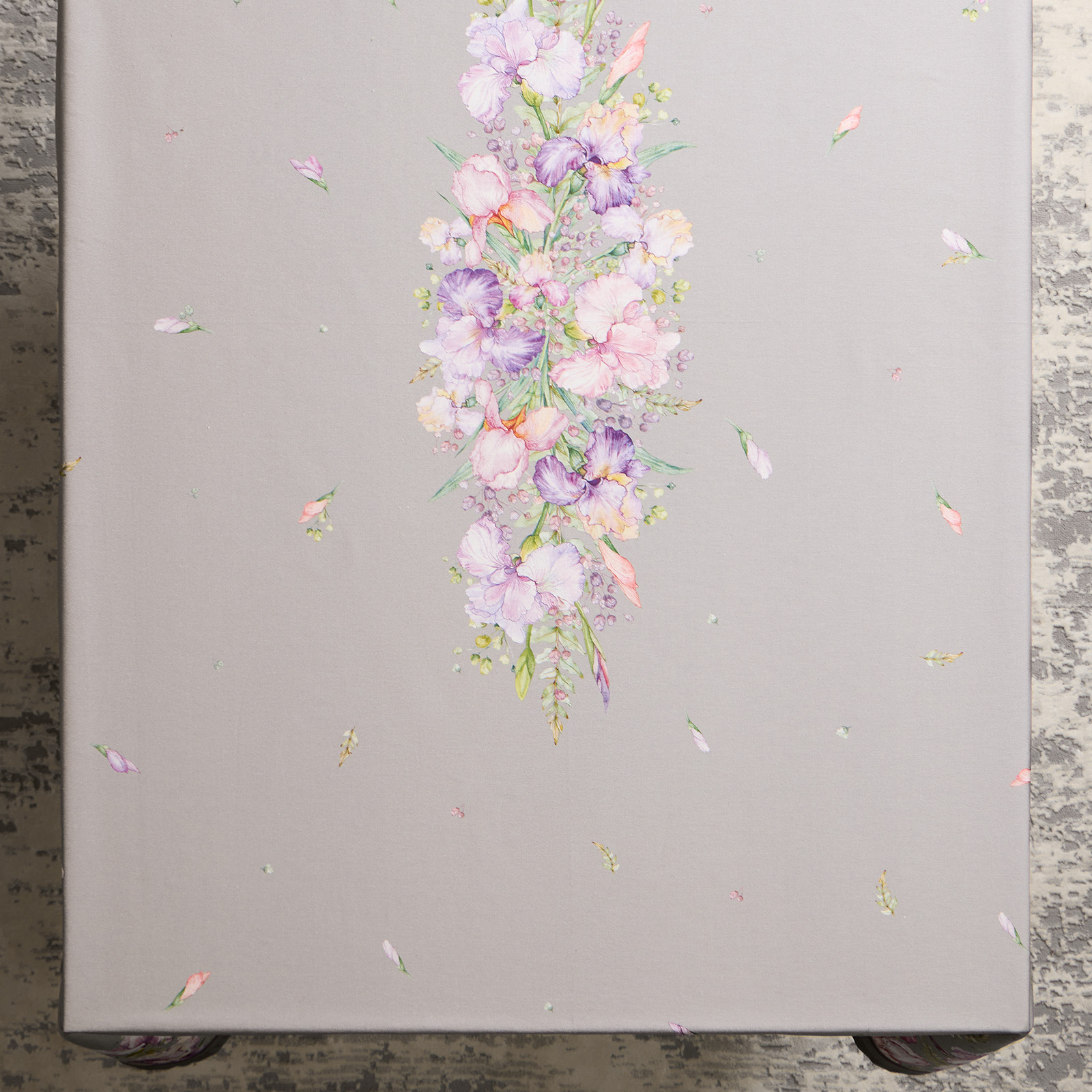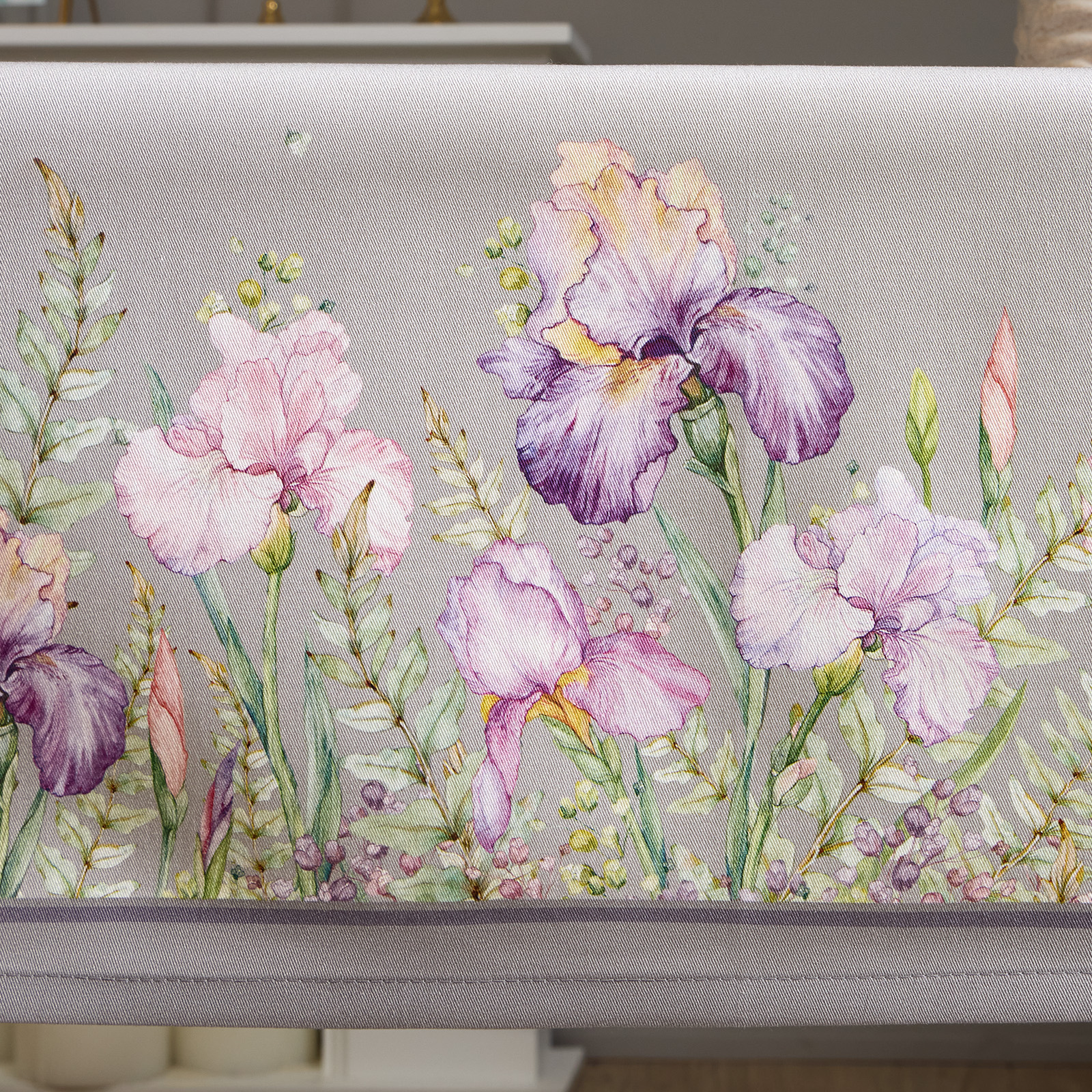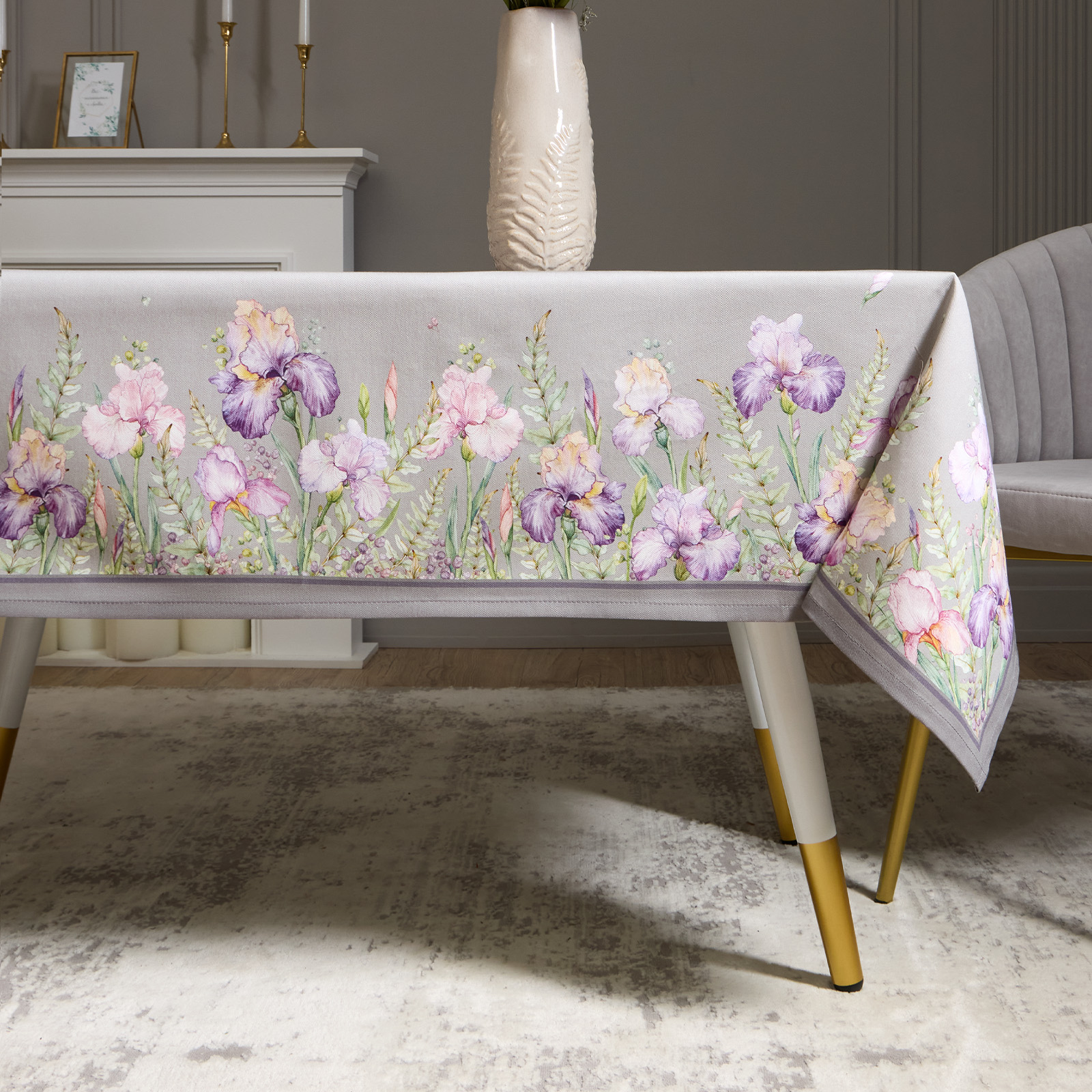 Цветочный принт с ирисами нанесён методом цифровой печати — каждый штрих детализирован, оттенки яркие и стойкие. Оформление по периметру делает скатерть эффектной с любого ракурса.