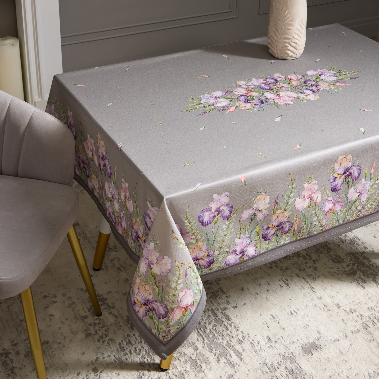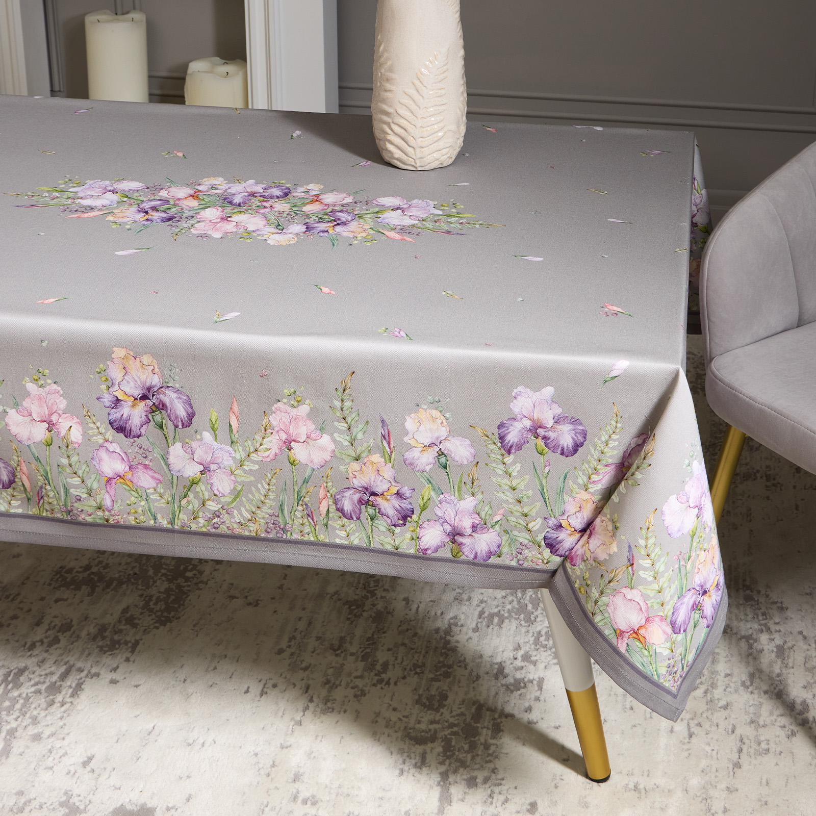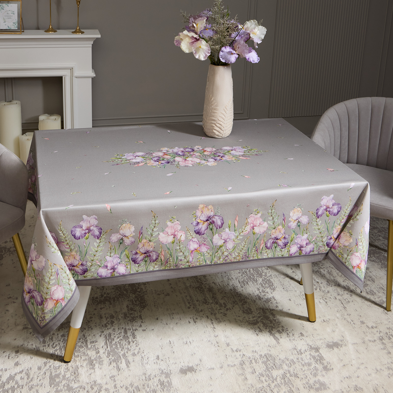 СКАТЕРТЬ "ИРИСЫ" 140Х180СМ ,СЕРЫЙ, 100% ХЛОПОК,ТВИЛ ПРОПИТКА