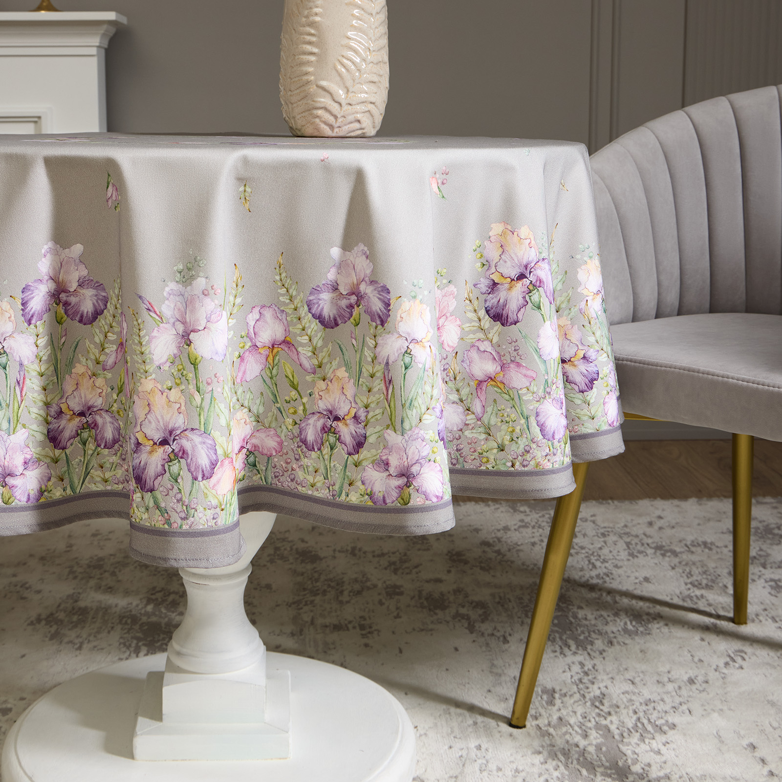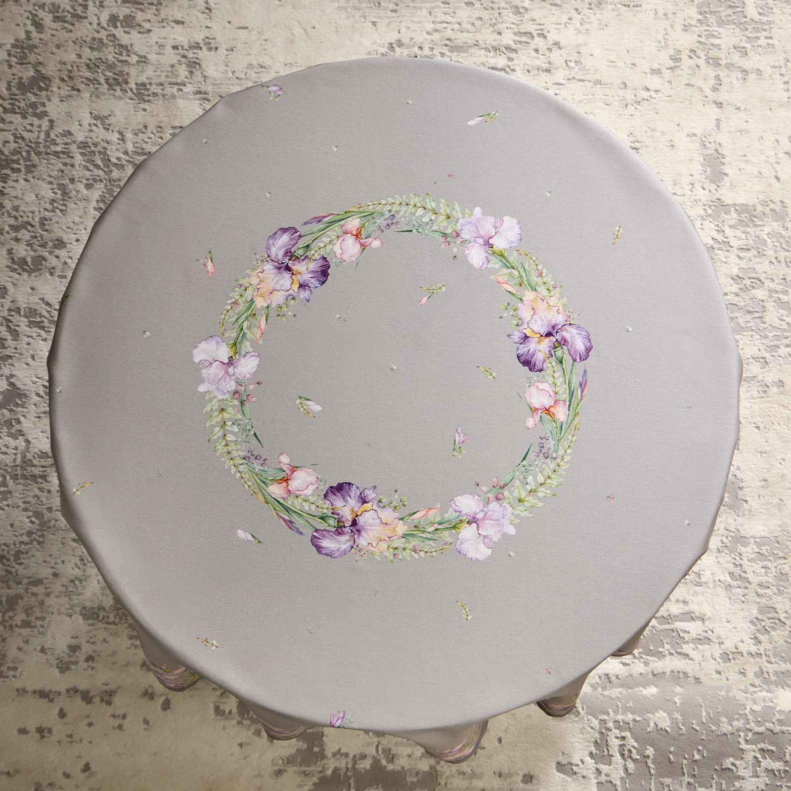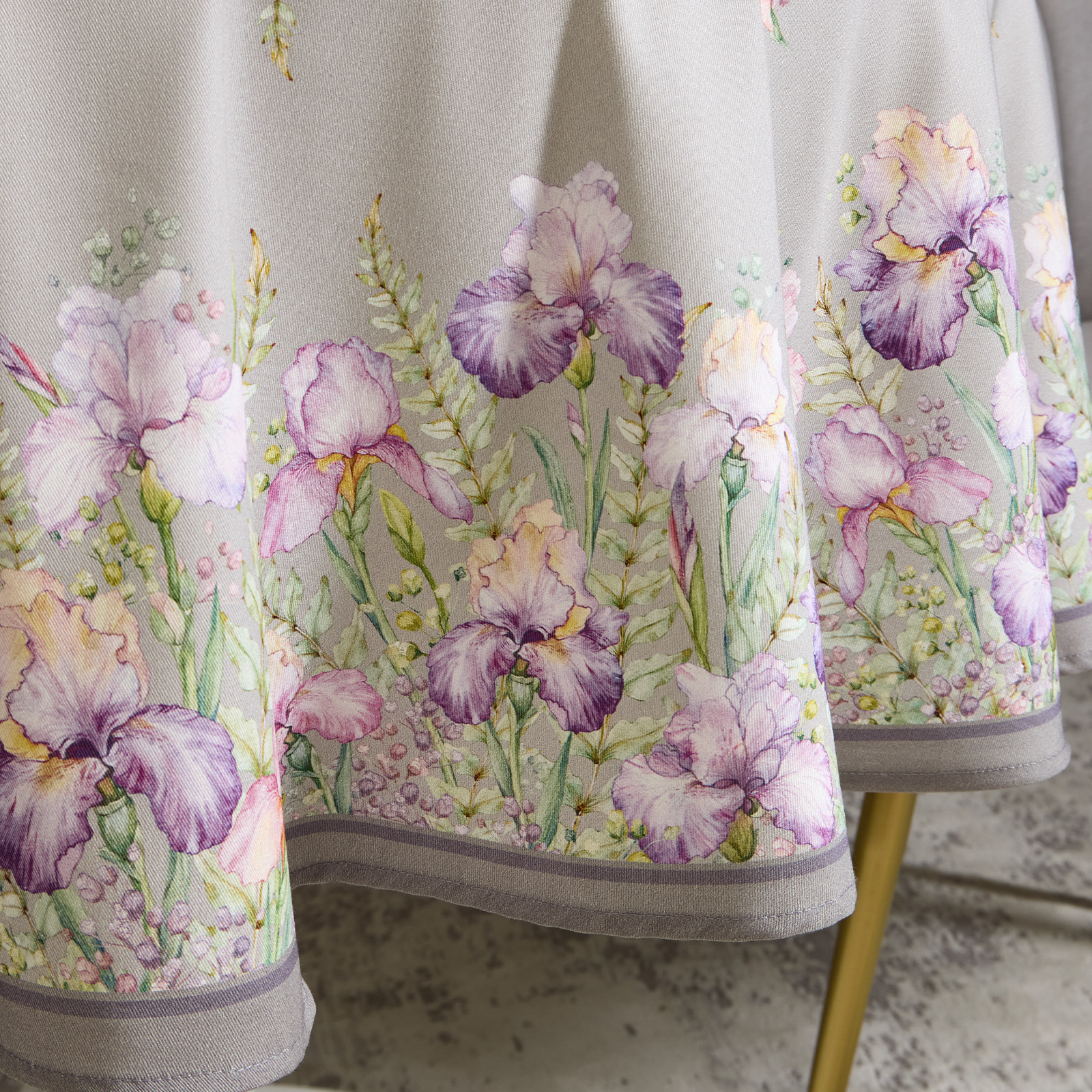 СКАТЕРТЬ КРУГЛАЯ " ИРИСЫ" 150СМ , СЕРЫЙ ,100% ХЛОПОК ,ТВИЛ, С ПРОПИТКОЙ