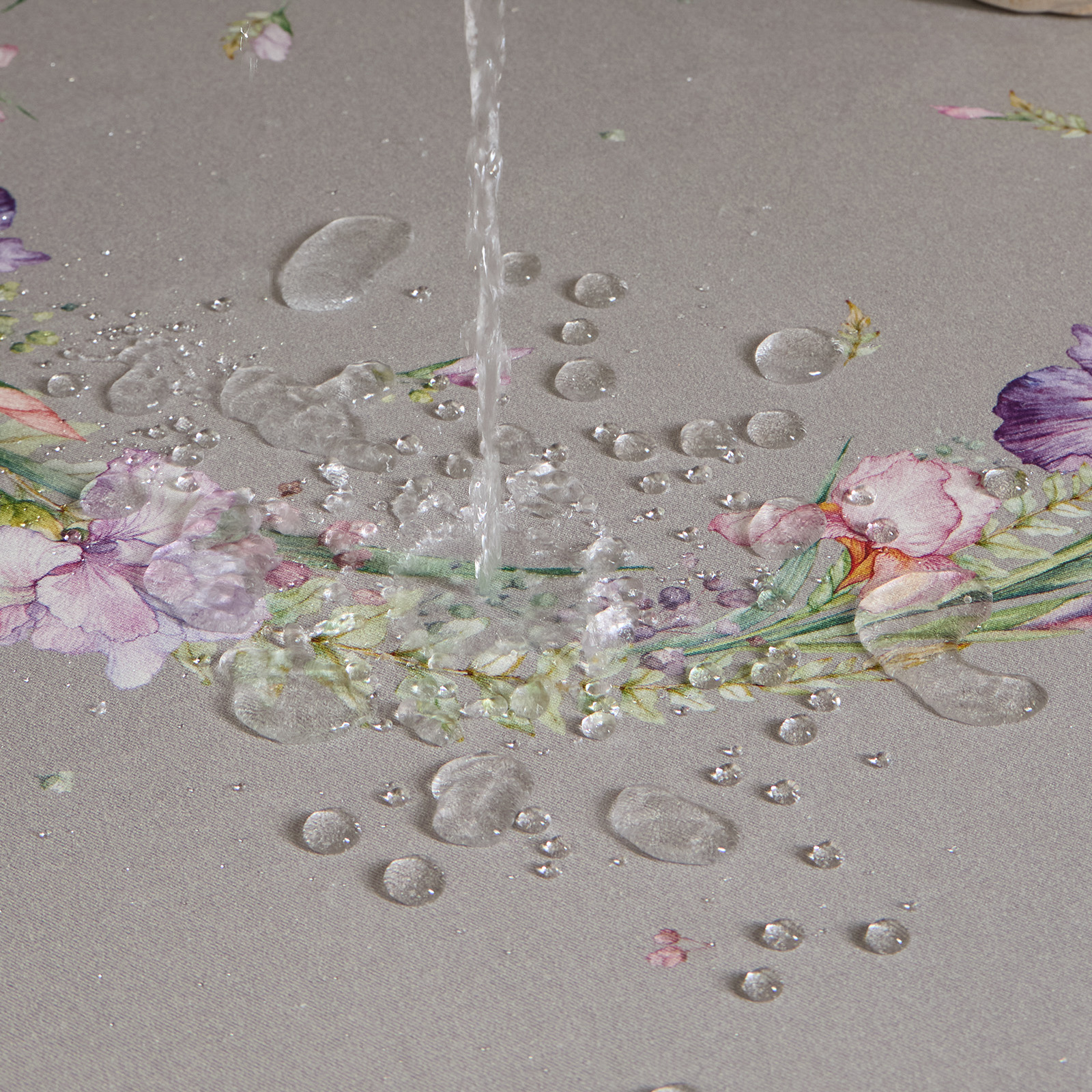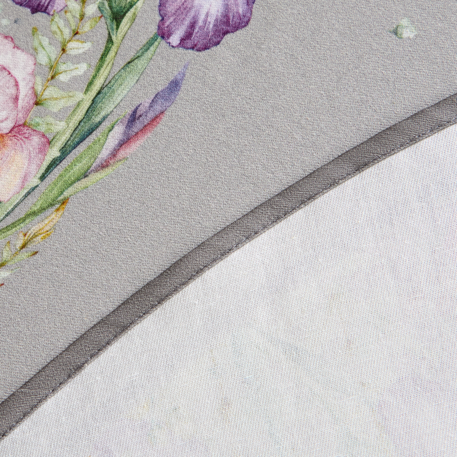Скатерть оформлена ярким цветочным принтом с сиреневыми ирисами и зеленью, нанесённым методом цифровой печати — рисунок не выцветает и сохраняет чёткость даже после многократных стирок. Нежные оттенки и декоративная кайма по краю придают изделию атмосферу свежести и уюта.