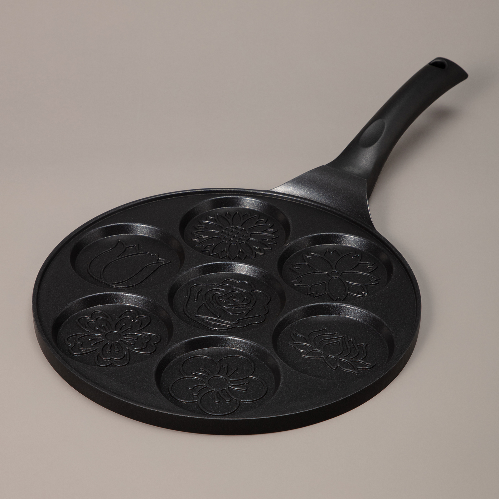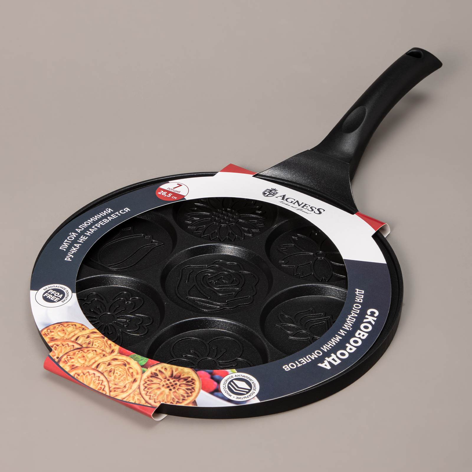 Сковороды AGNESS серии "FLOWER STORY" выполнены из литого алюминия. Такая посуда отличается высокой теплопроводностью и устойчивостью к деформациям. Необычный дизайн сковороды позволит приготовить интересные и веселые оладушки и омлеты.