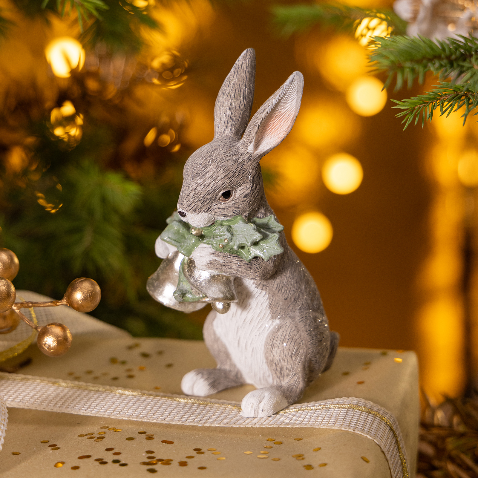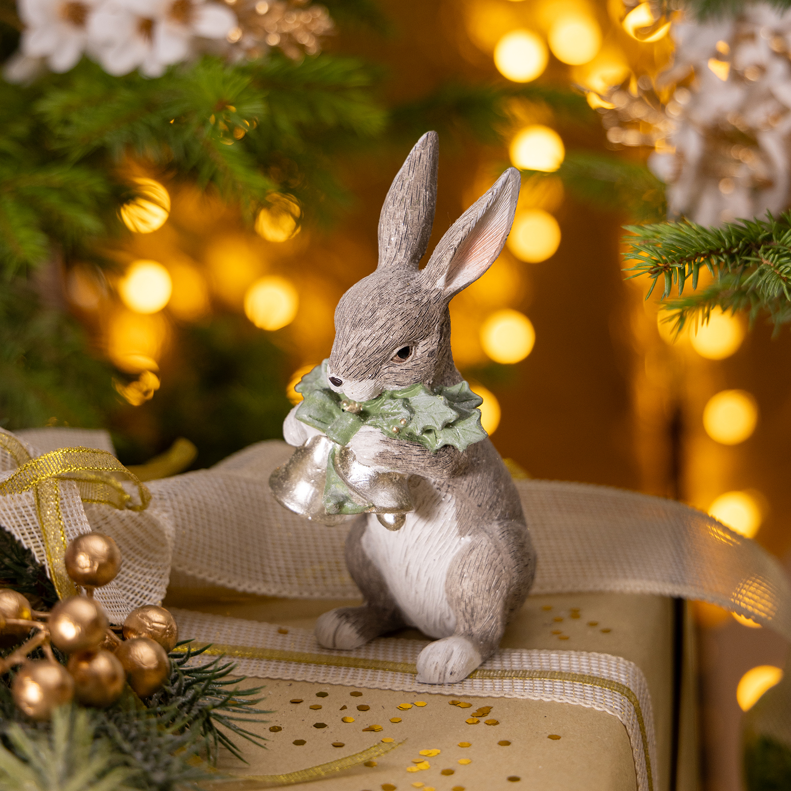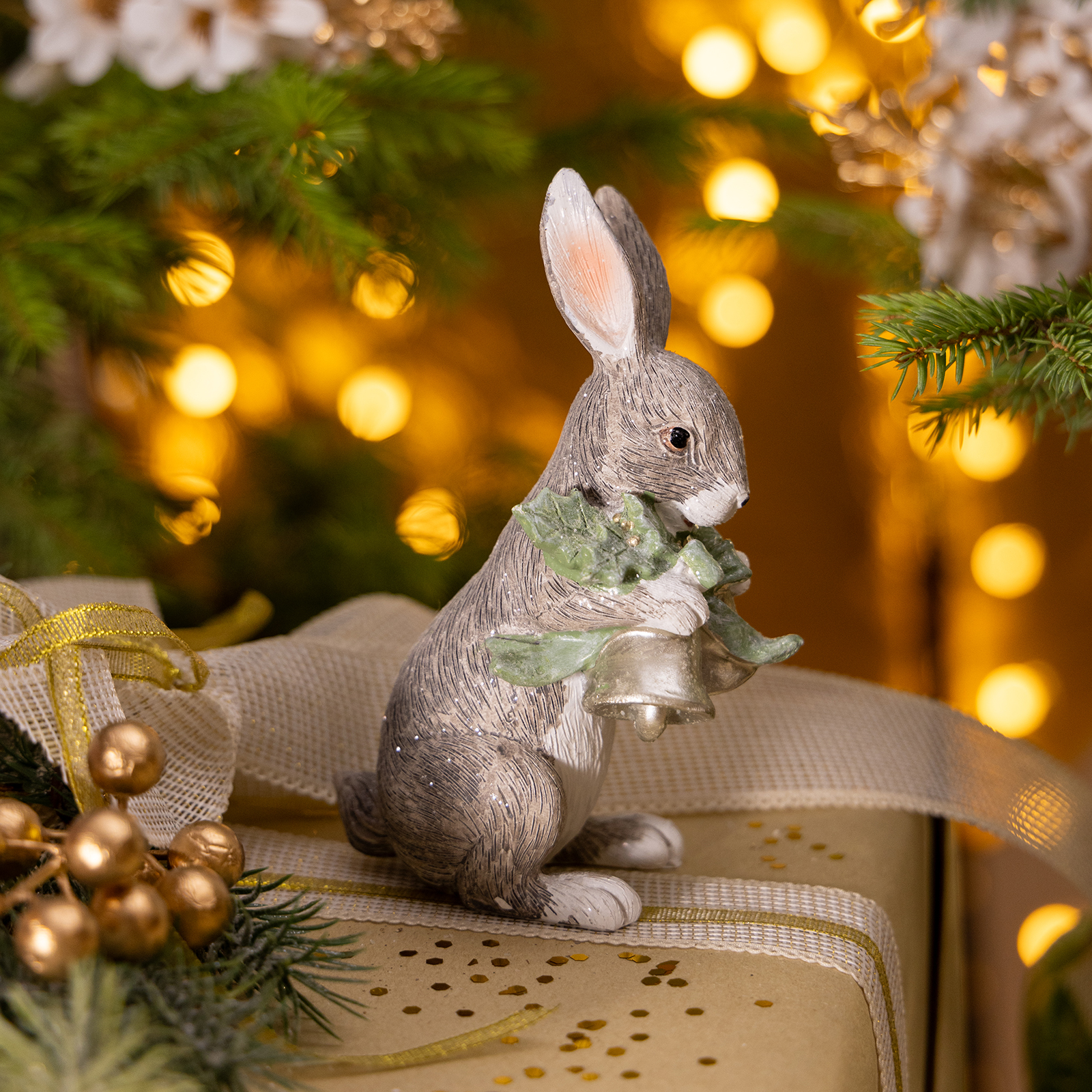Мягкий, пушистый кролик, словно сошедший из рождественской сказки, держит в лапках зелёную ветку падуба с серебристым колокольчиком — символ надежды, защиты и праздничного тепла. Его взгляд спокоен, ушки чуть приподняты, будто он слушает шепот снега.