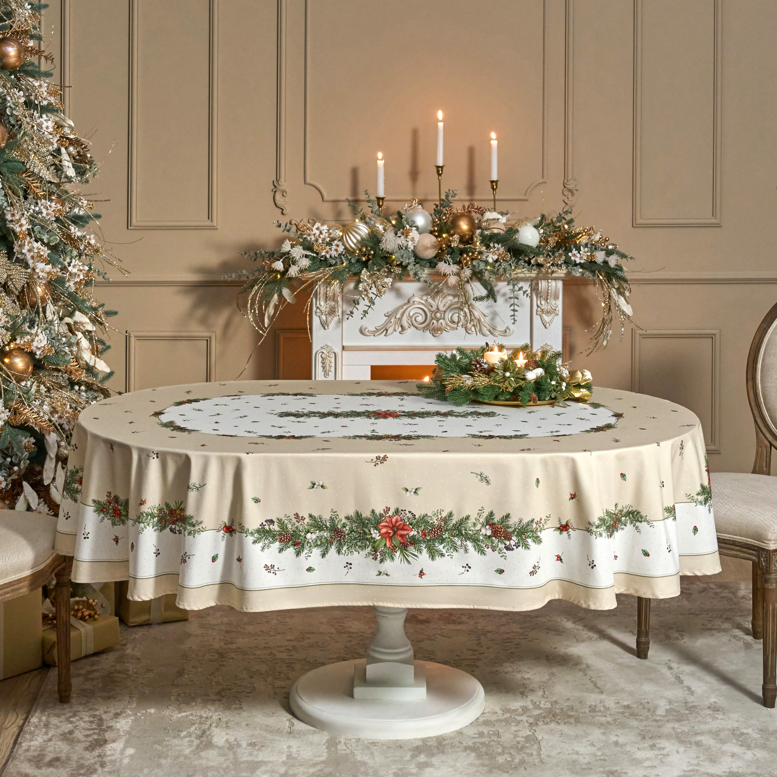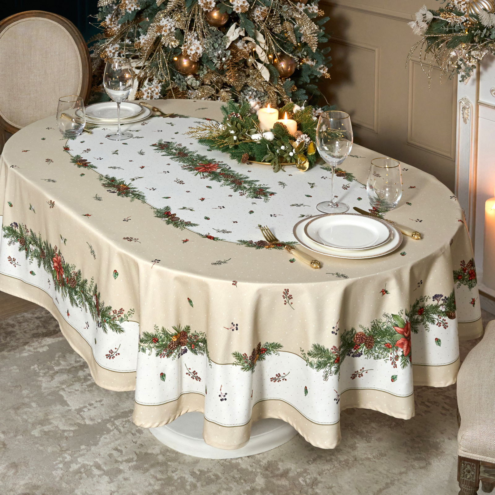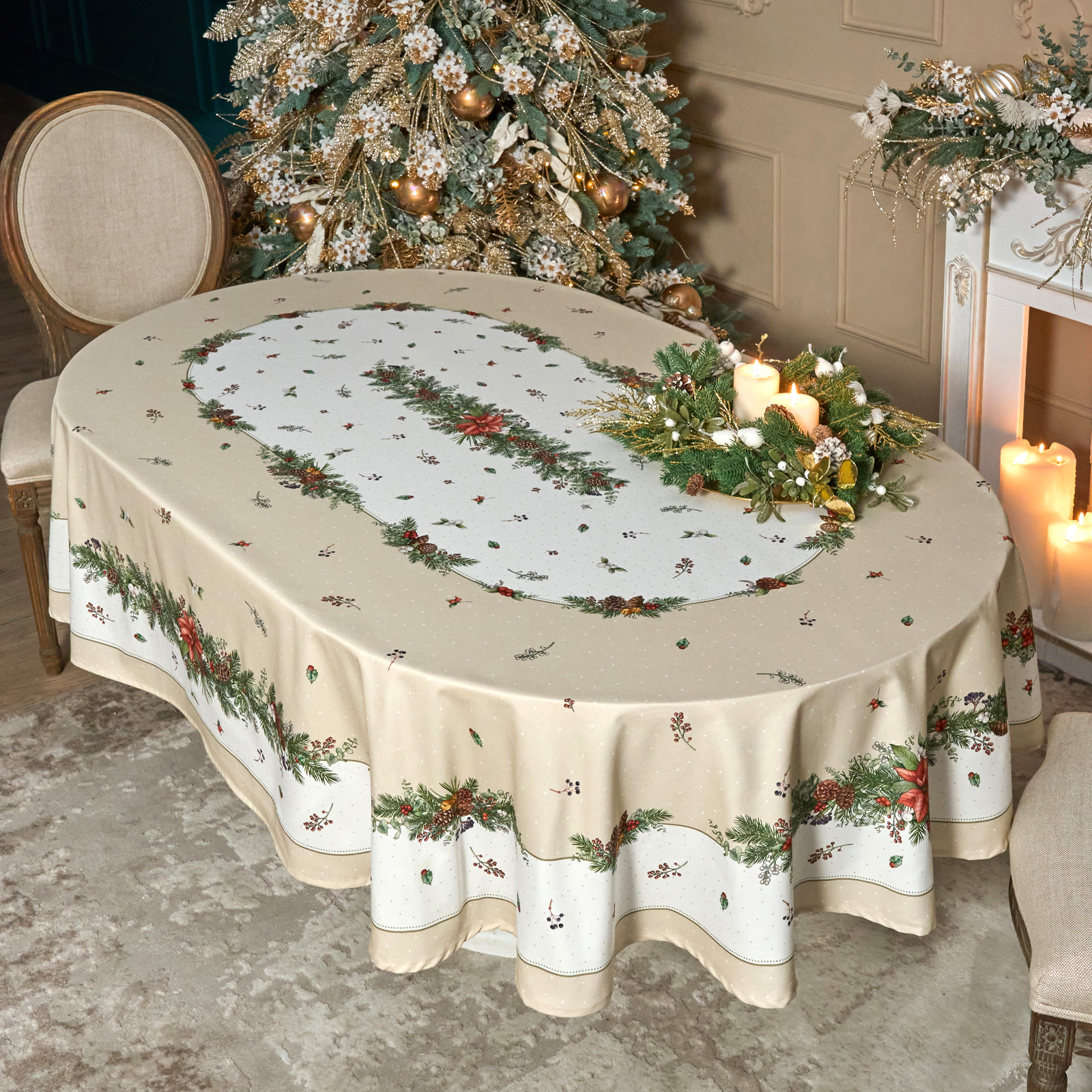 СКАТЕРТЬ ОВАЛЬНАЯ "CELEBRATION"160Х220СМ ,БЕЖЕВЫЙ, 100% ХЛОПОК,ТВИЛ, ПРОПИТКА
