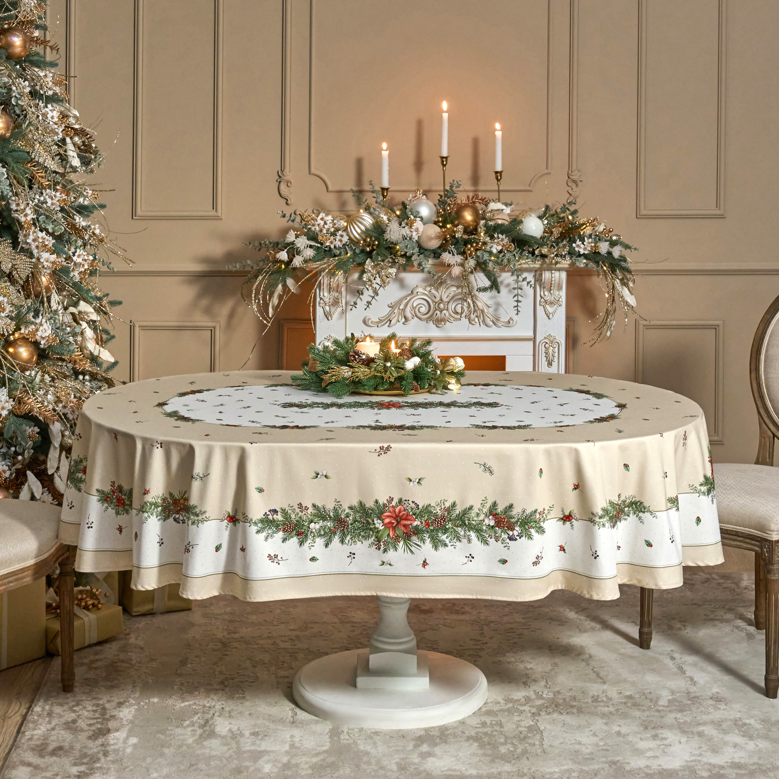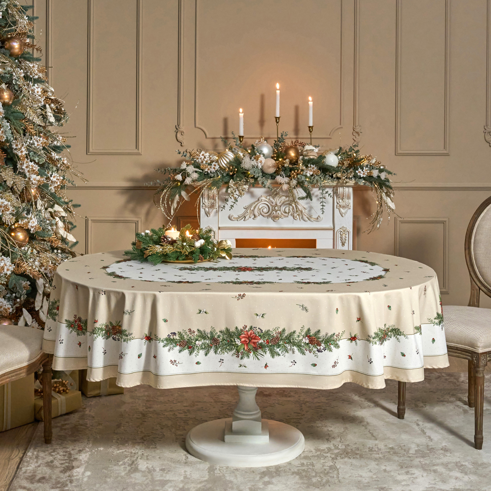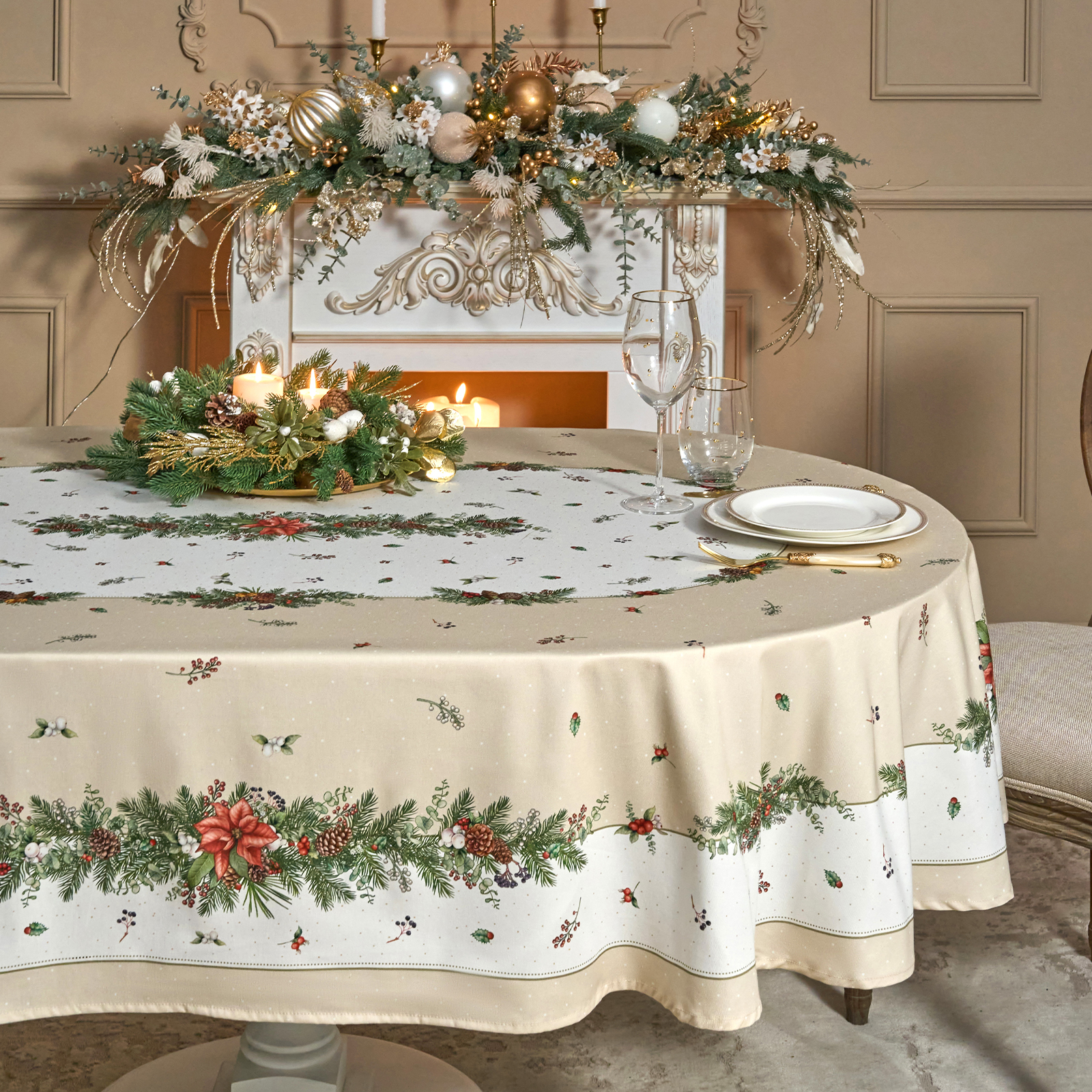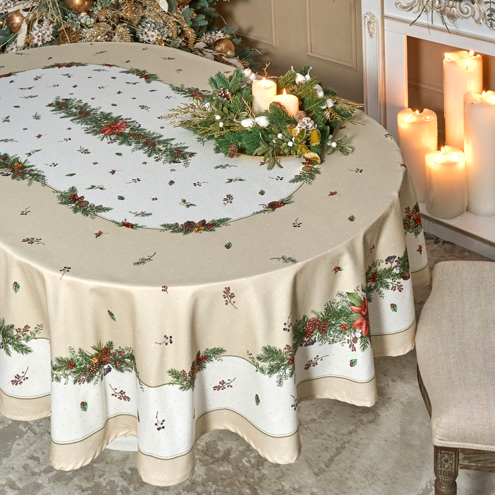 СКАТЕРТЬ ОВАЛЬНАЯ "CELEBRATION"160Х220СМ ,БЕЖЕВЫЙ, 100% ХЛОПОК,ТВИЛ, ПРОПИТКА