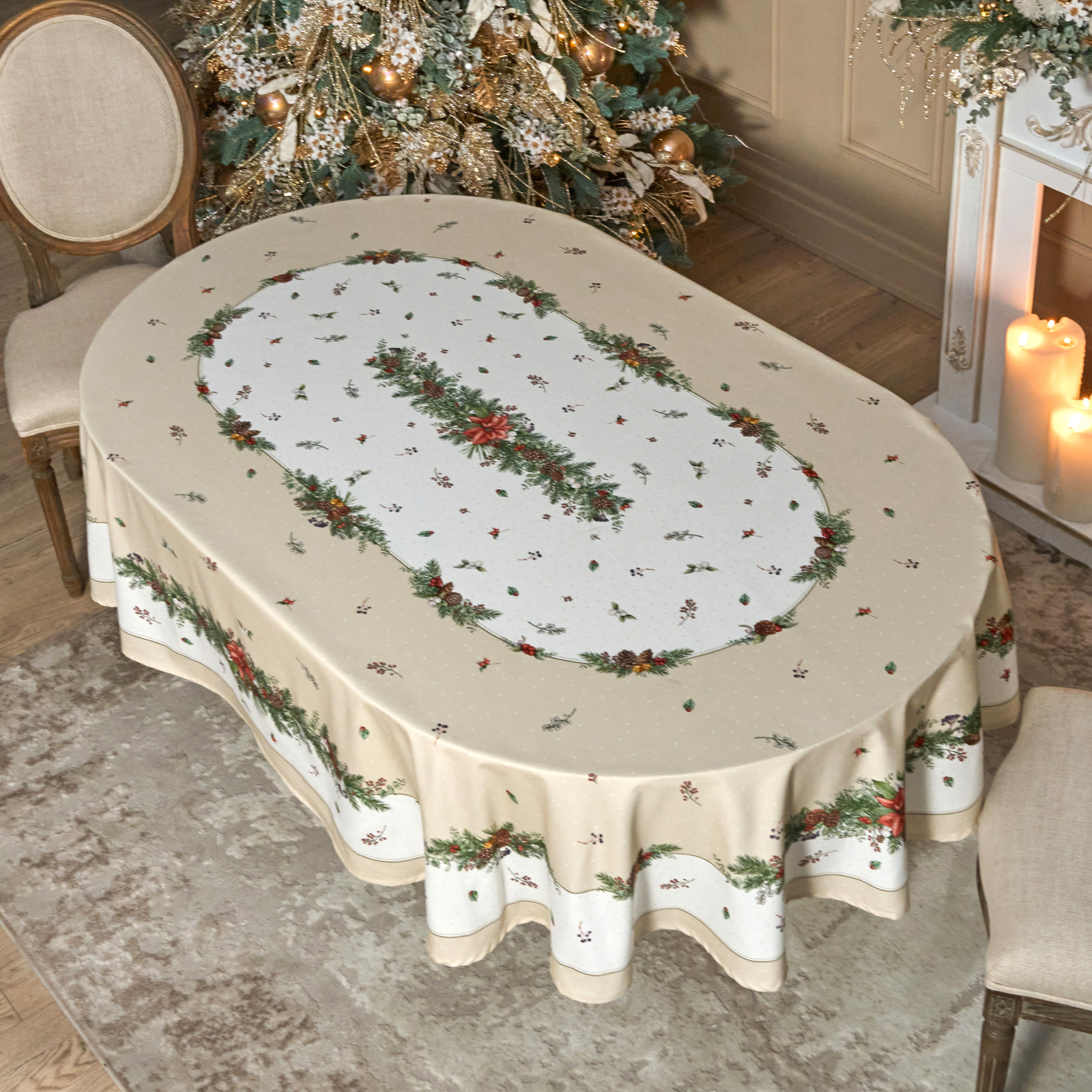 Овальная скатерть 160×220 см отлично подойдёт для средних и больших столов, создавая равномерный свес и завершённый вид сервировки.