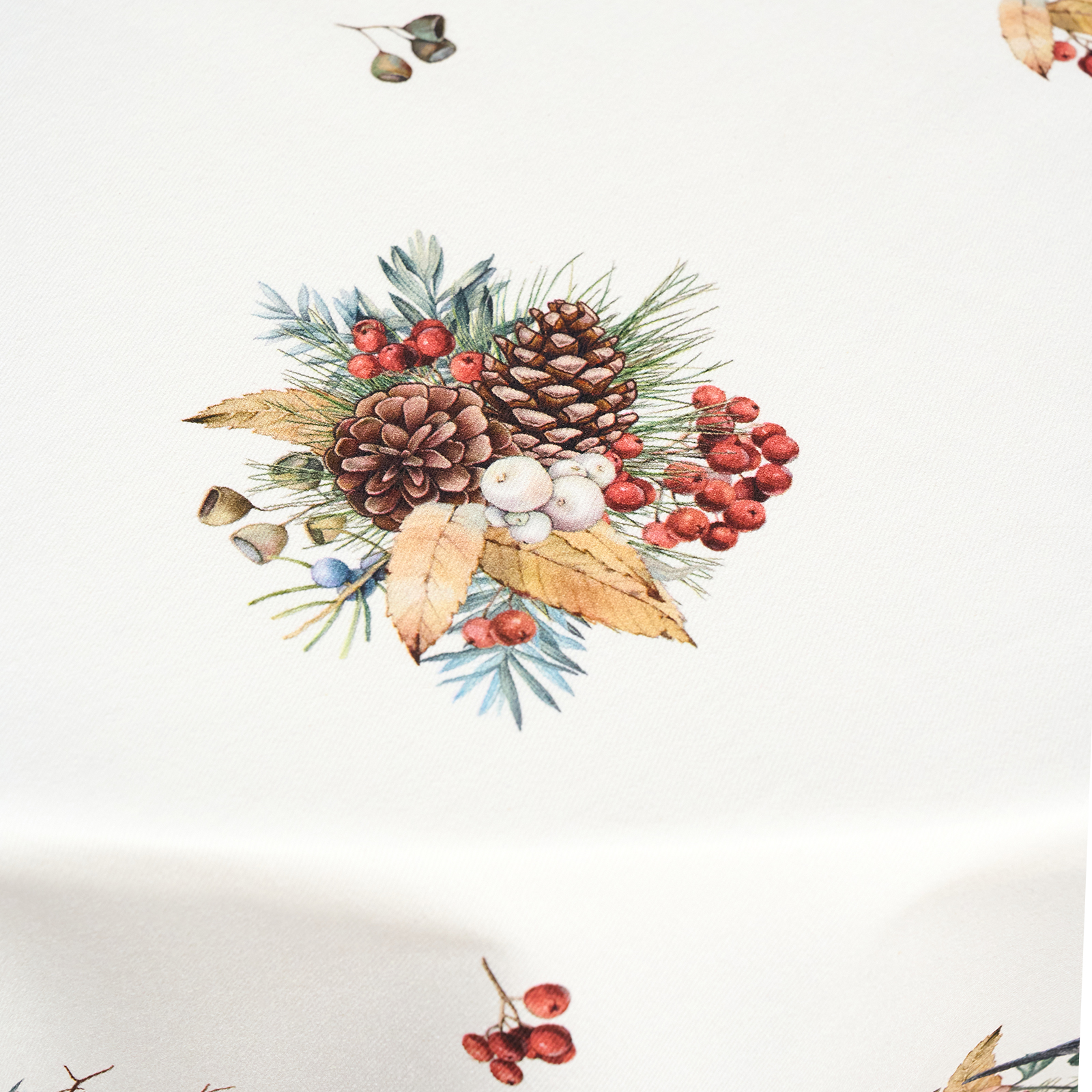 Скатерть выполнена из 100% хлопка (твил) с плотностью 190 г/м². Прочная саржевая структура делает ткань износостойкой, не подверженной заломам и сминанию. Благодаря водоотталкивающей пропитке поверхность защищена от влаги и легко очищается — идеальный вариант для праздничного застолья.