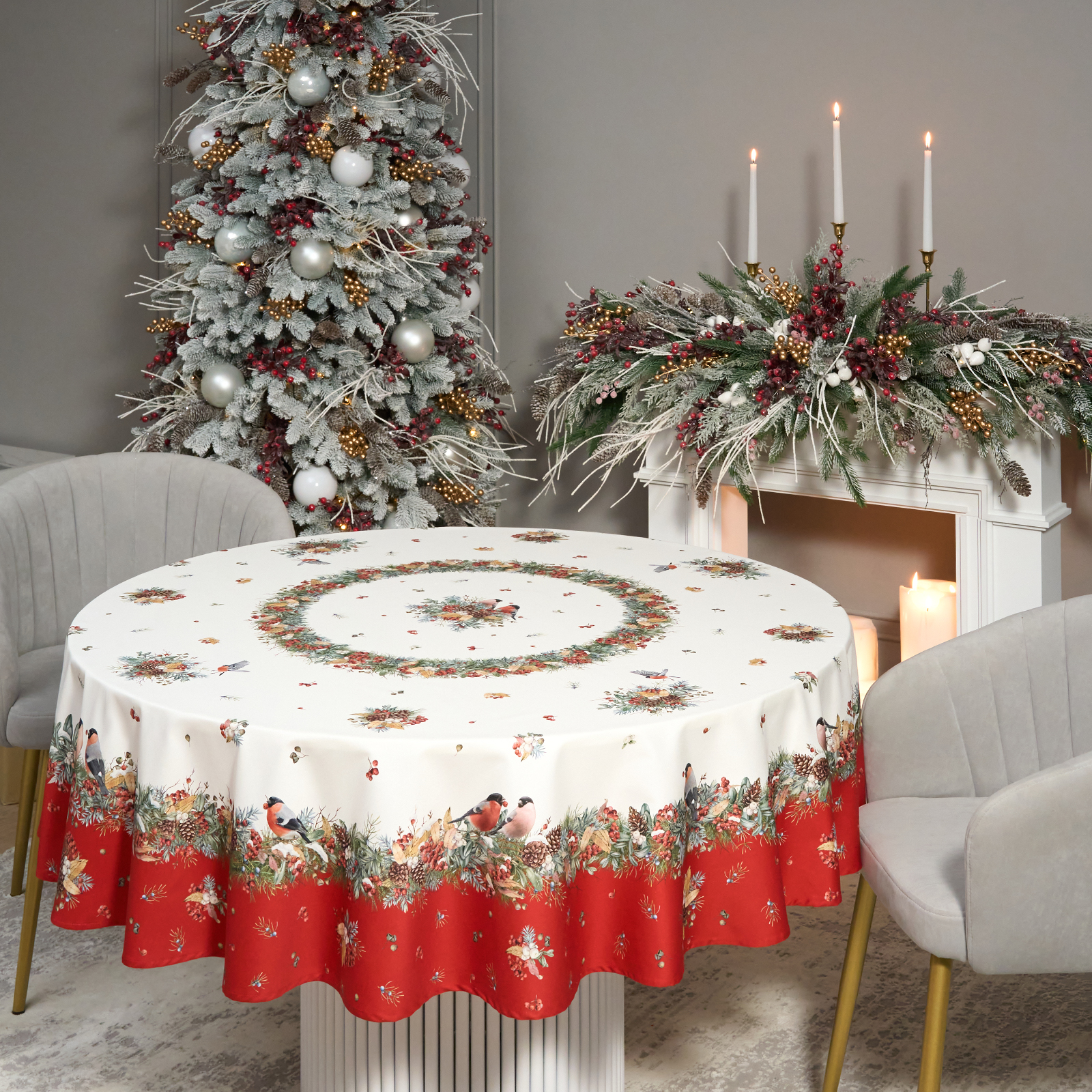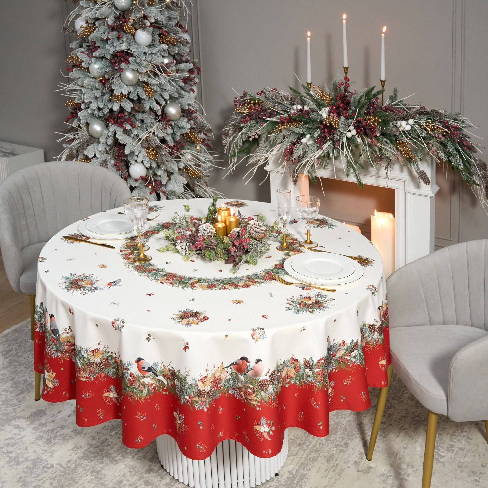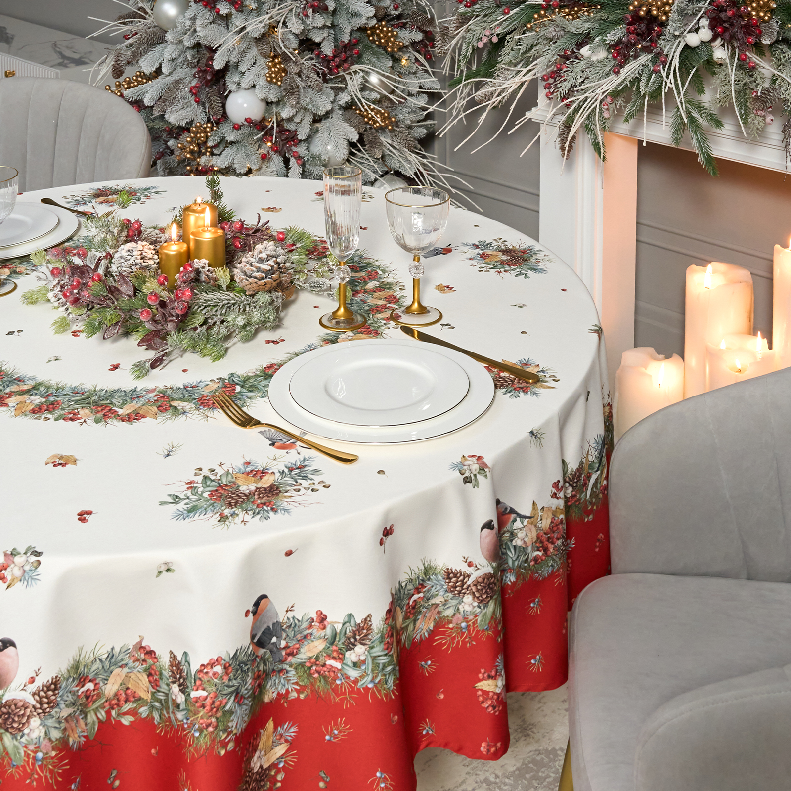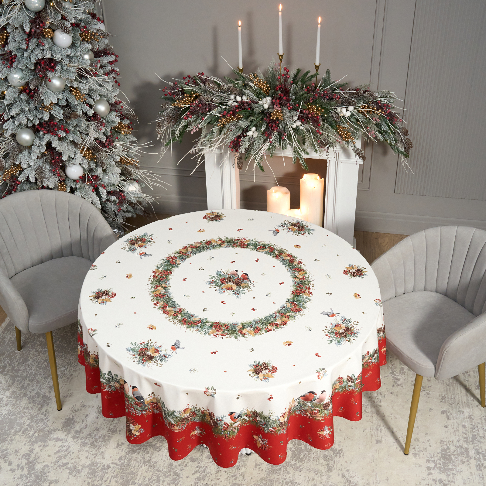 Новогодняя скатерть от Lefard из коллекции Морозко. Снегири— элегантное решение для сервировки праздничного стола. Диаметр 190 см подходит для круглых столов диаметром от 100 до 140 см, создавая равномерный и эстетичный свес.