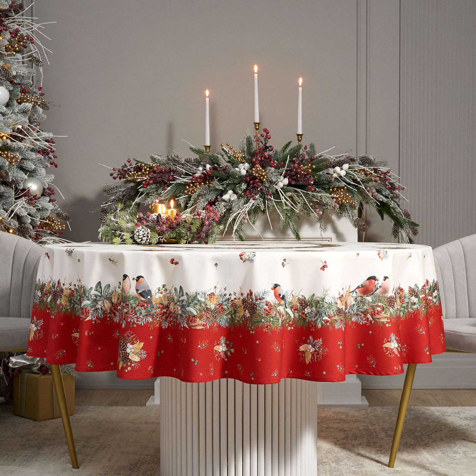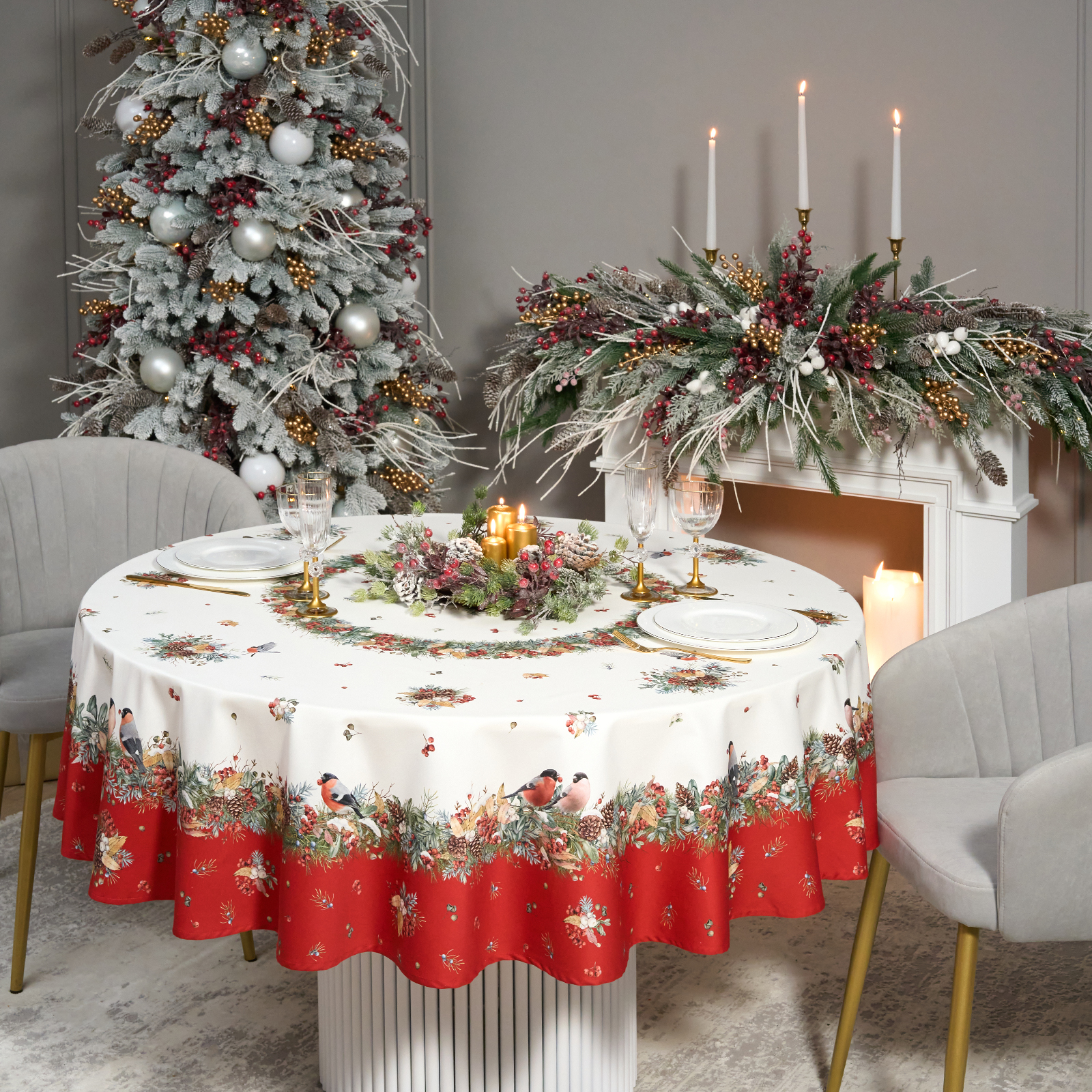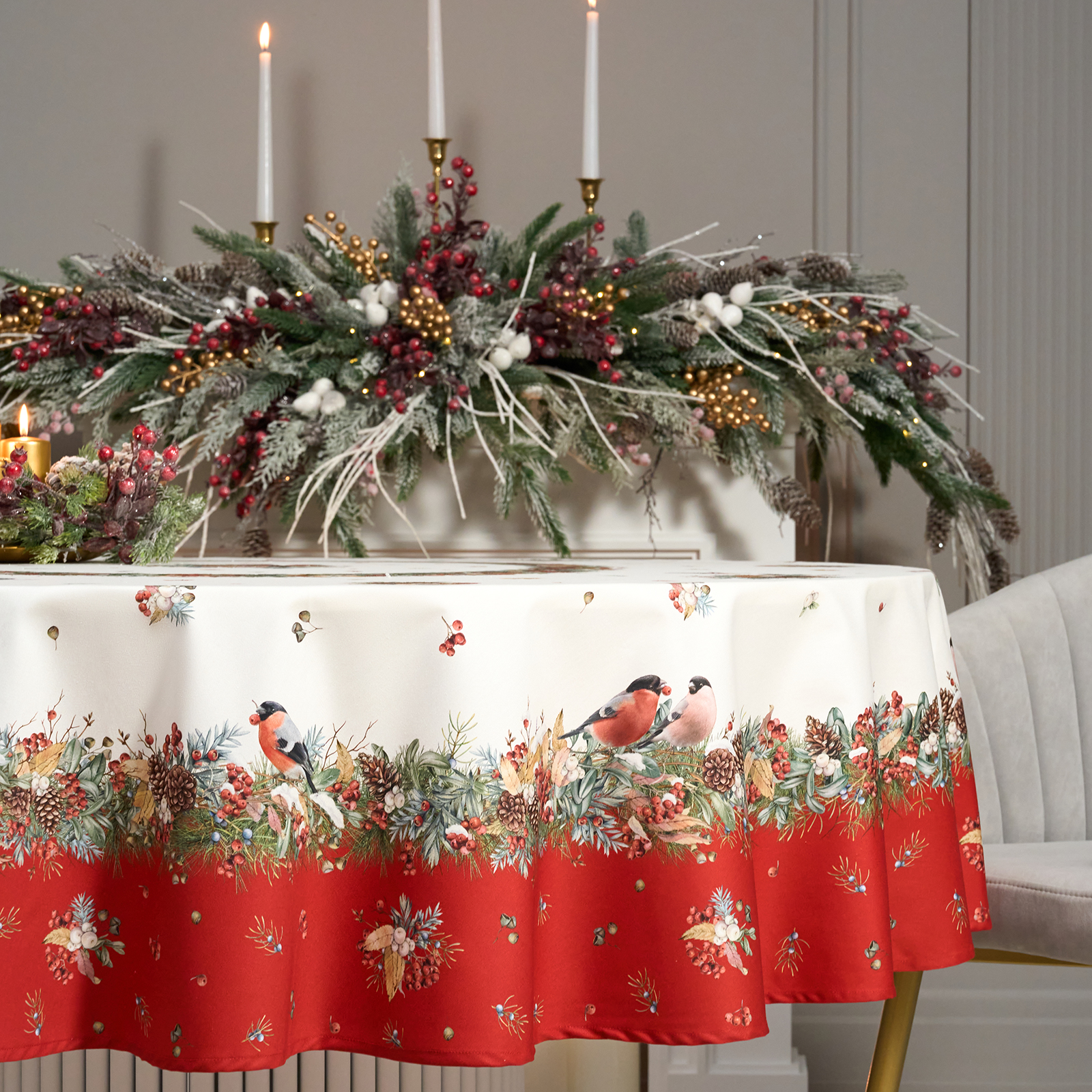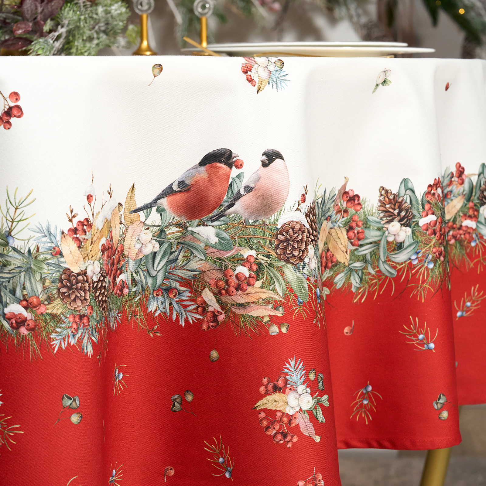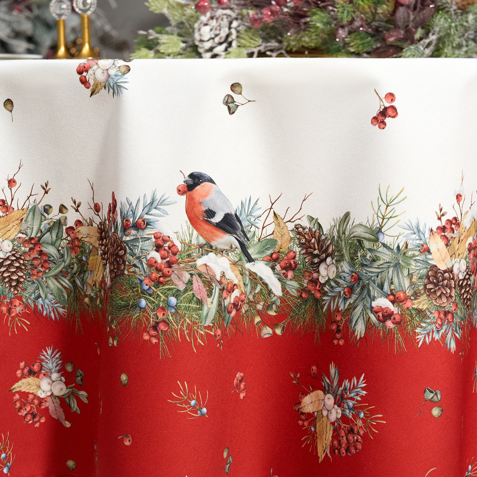 Новогодняя скатерть от Lefard из коллекции Морозко. Снегири— элегантное решение для сервировки праздничного стола. Диаметр 190 см подходит для круглых столов диаметром от 100 до 140 см, создавая равномерный и эстетичный свес.