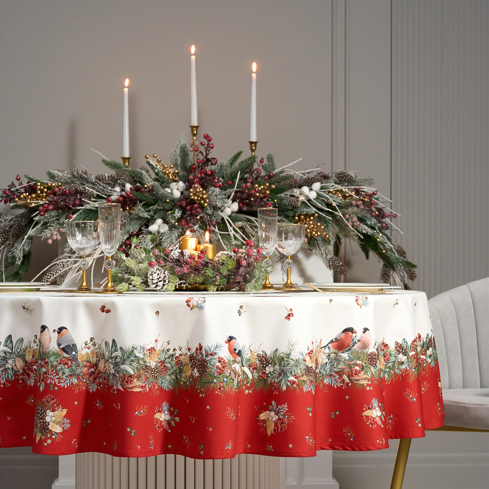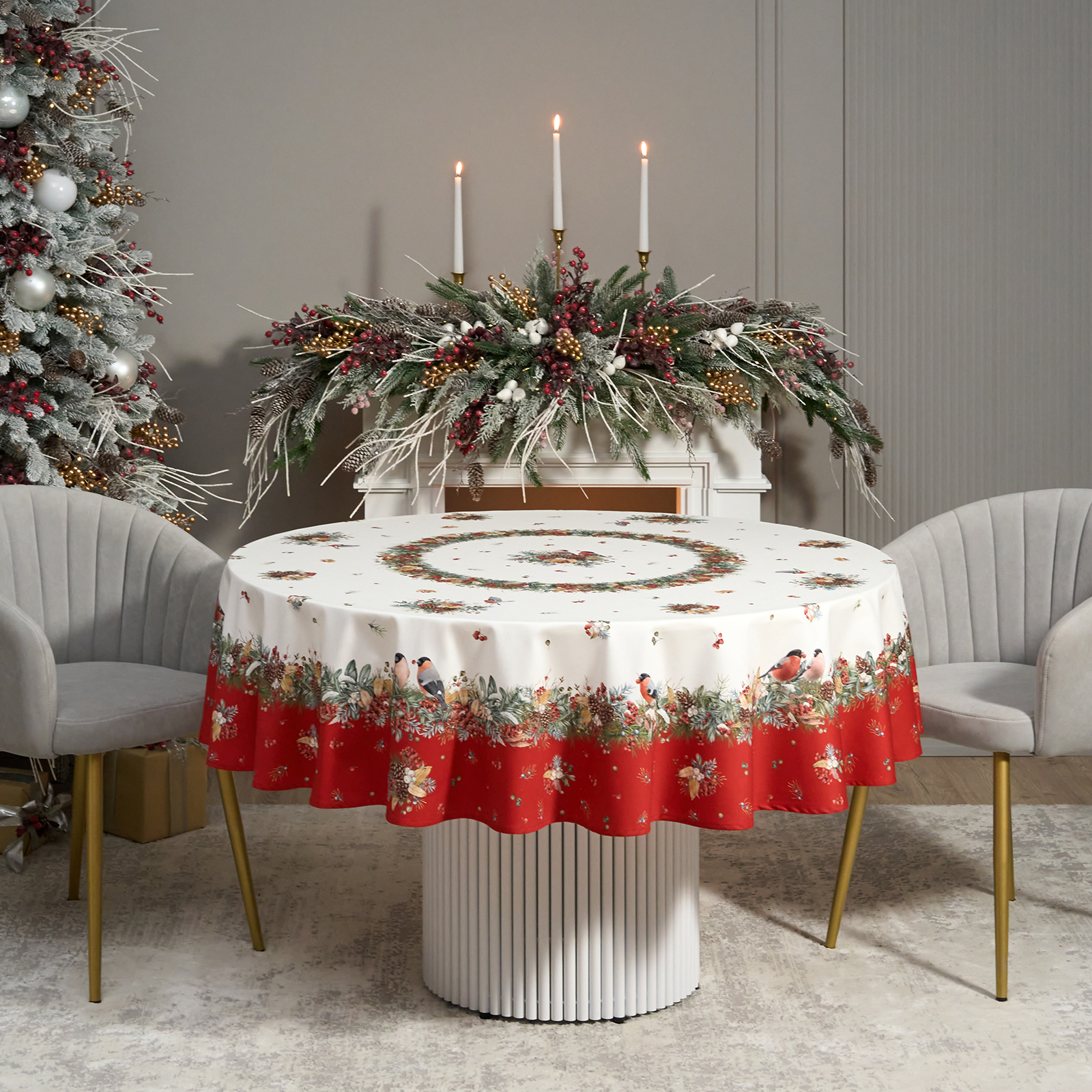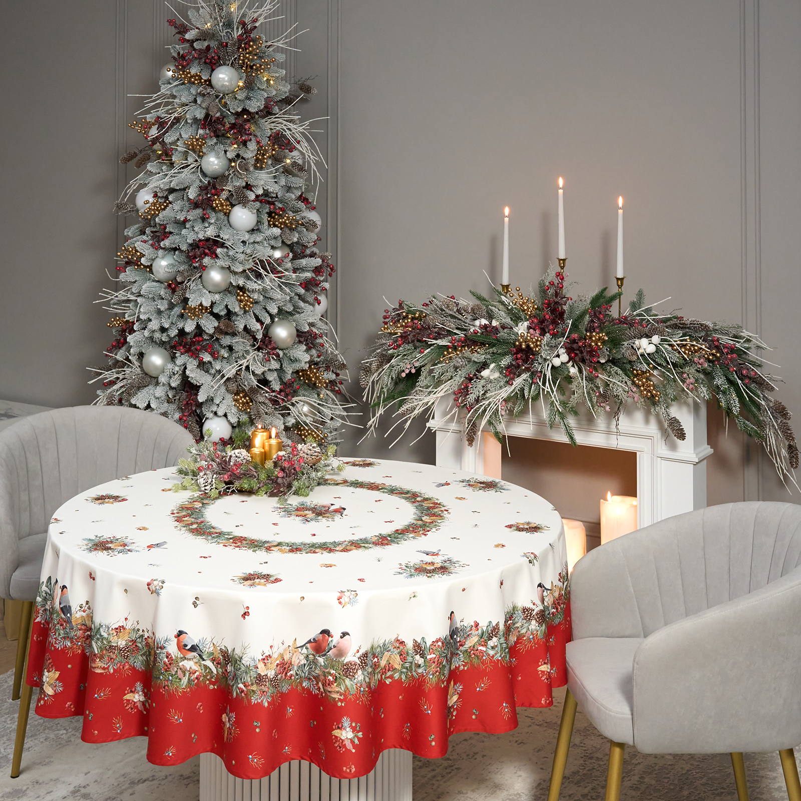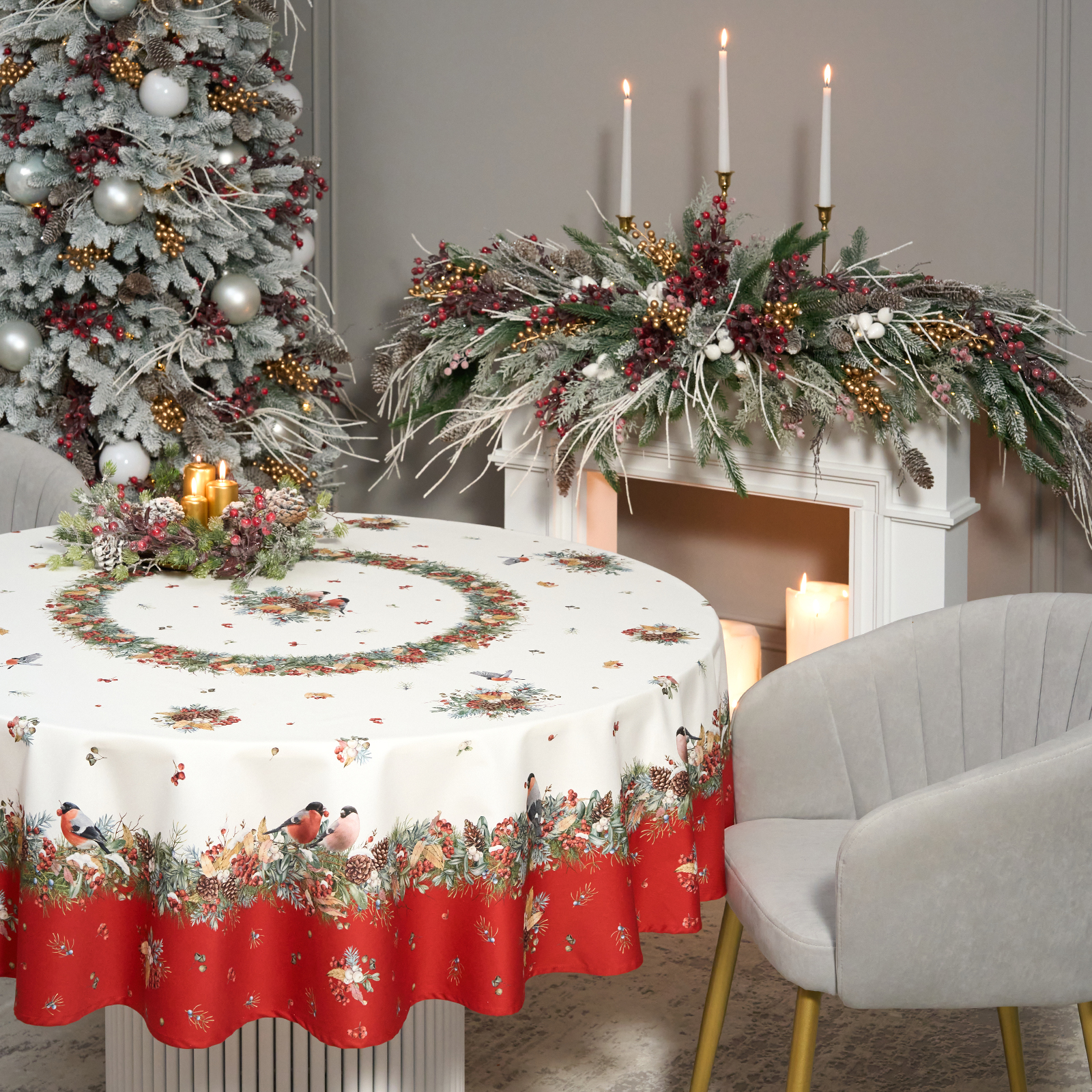 Новогодняя скатерть от Lefard из коллекции Морозко. Снегири— элегантное решение для сервировки праздничного стола. Диаметр 190 см подходит для круглых столов диаметром от 100 до 140 см, создавая равномерный и эстетичный свес.