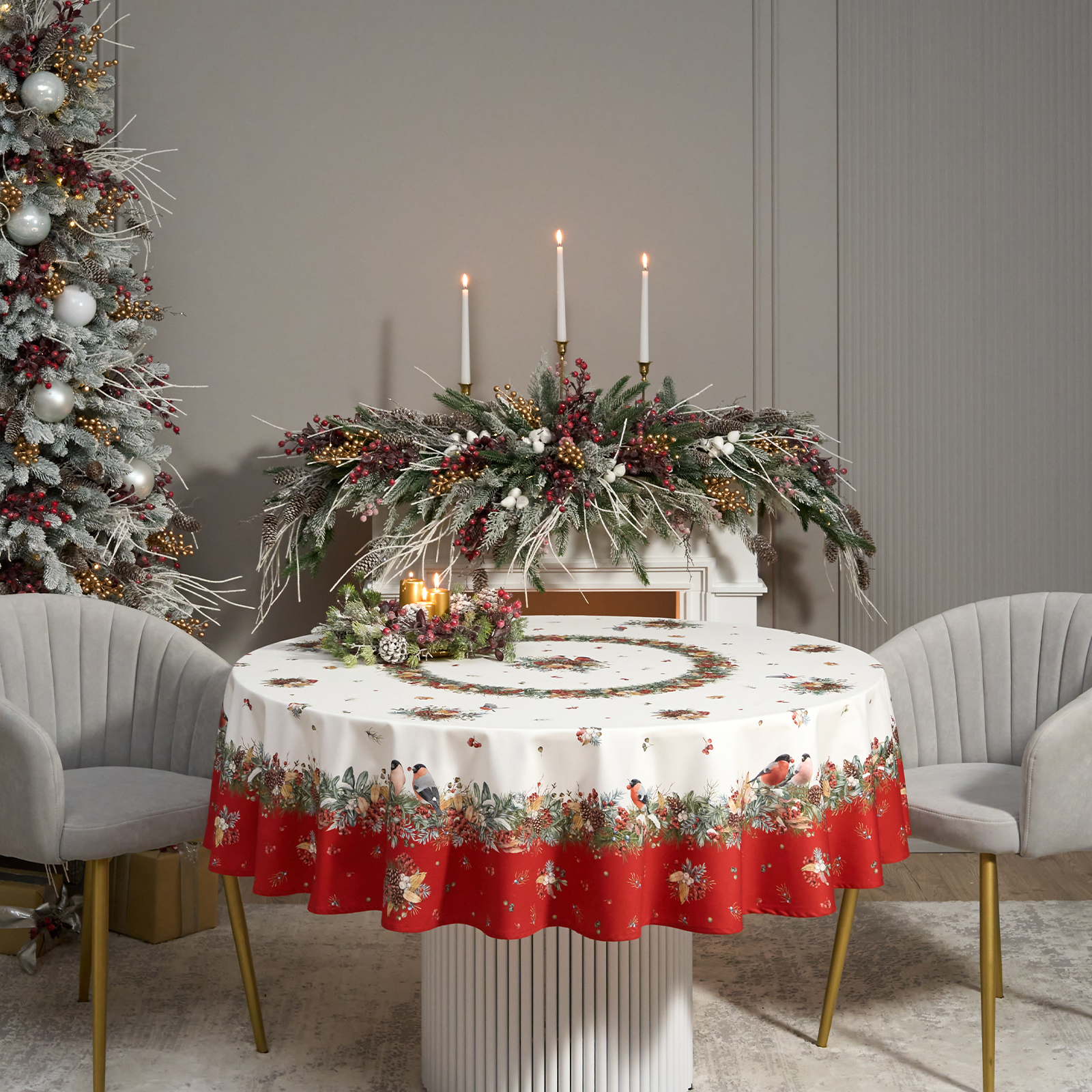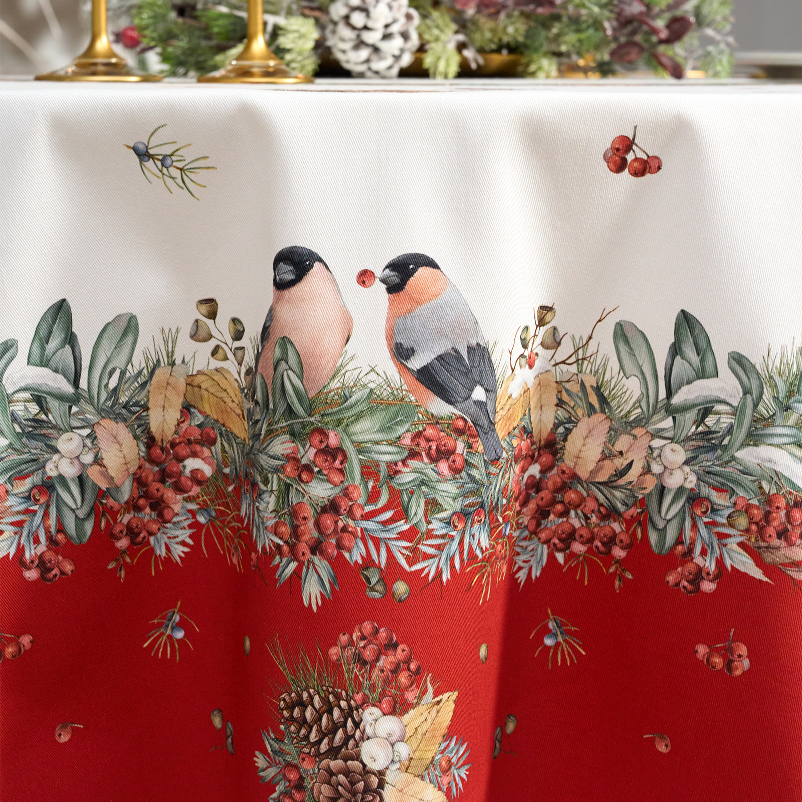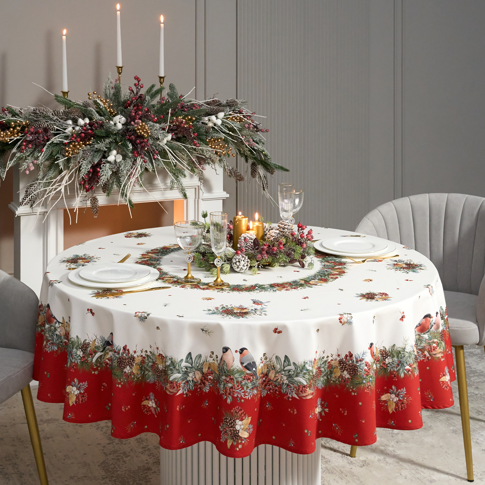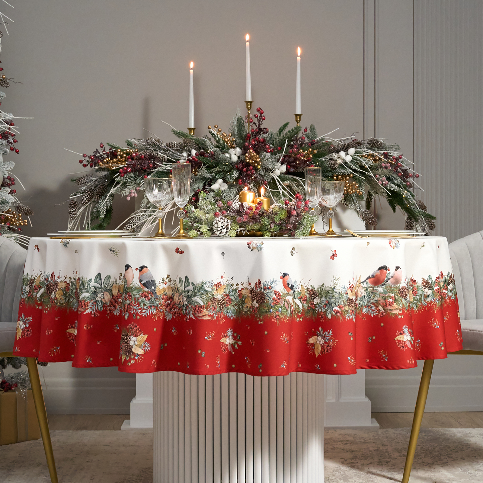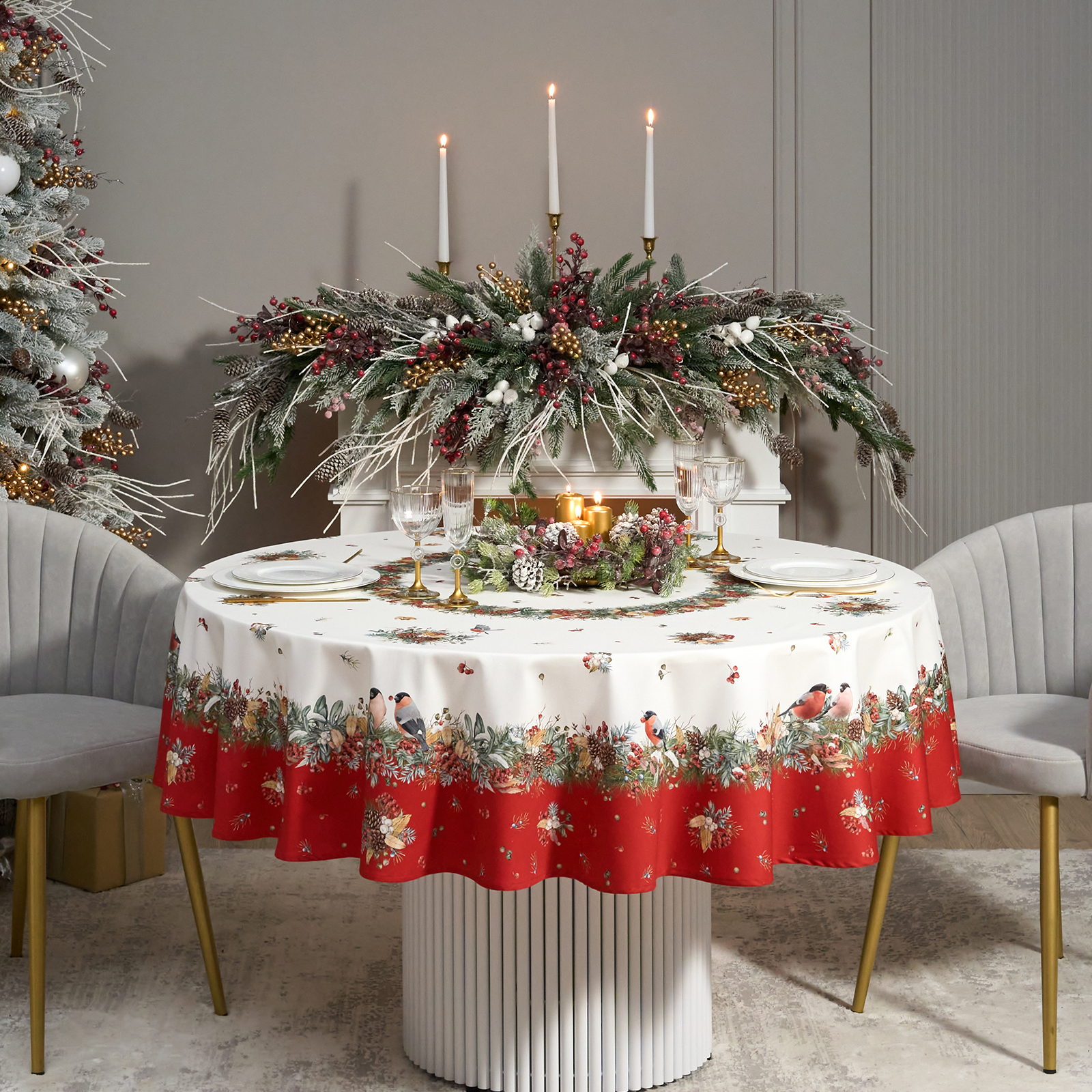 Новогодняя скатерть от Lefard из коллекции Морозко. Снегири— элегантное решение для сервировки праздничного стола. Диаметр 190 см подходит для круглых столов диаметром от 100 до 140 см, создавая равномерный и эстетичный свес.
