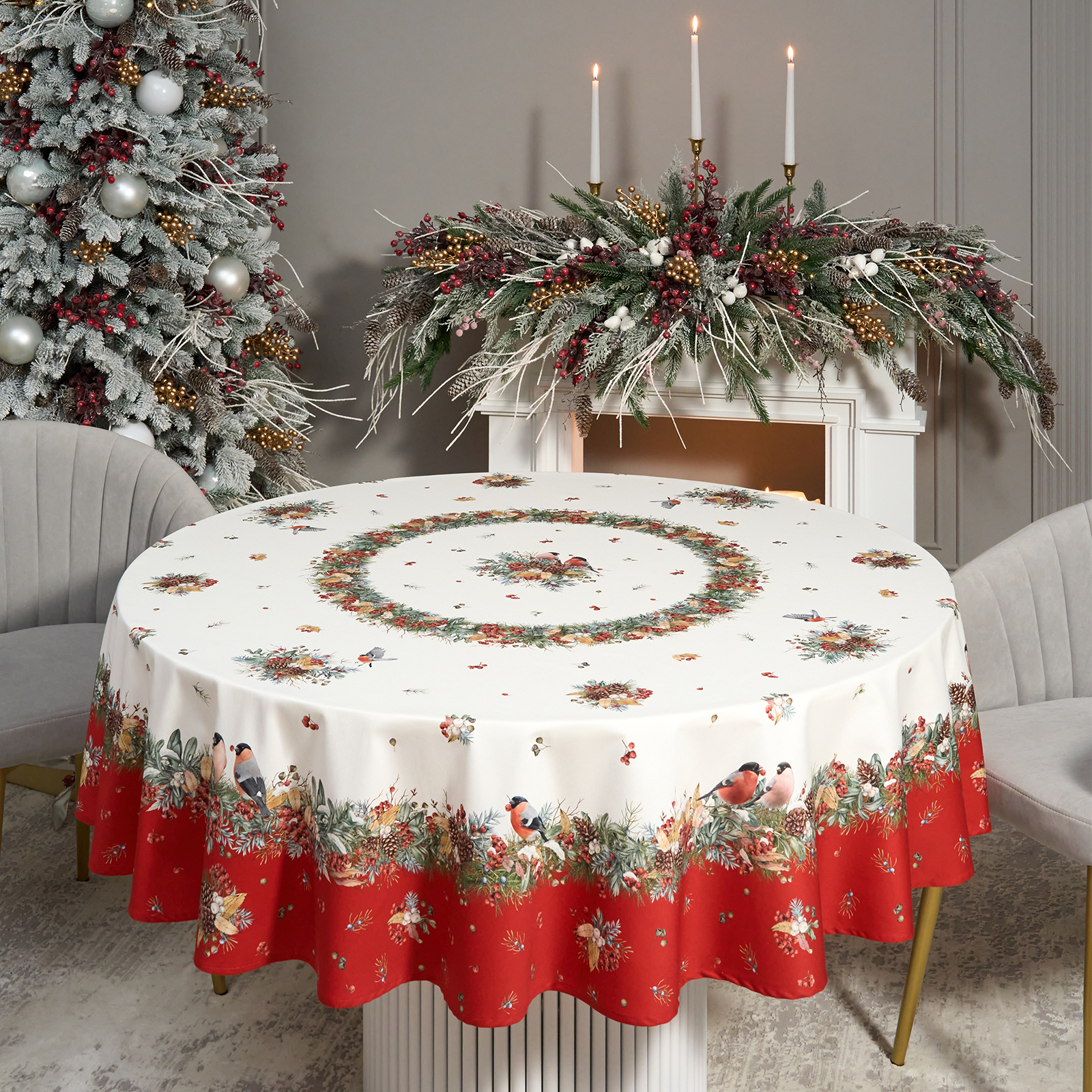 СКАТЕРТЬ КРУГЛАЯ "МОРОЗКО.СНЕГИРИ" 190СМ ,КРАСНЫЙ, 100% ХЛОПОК, ТВИЛ, С ПРОПИТКОЙ