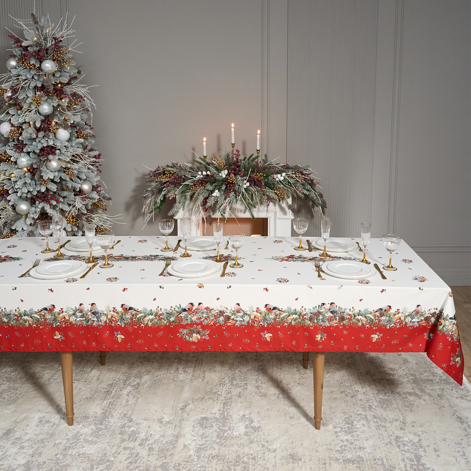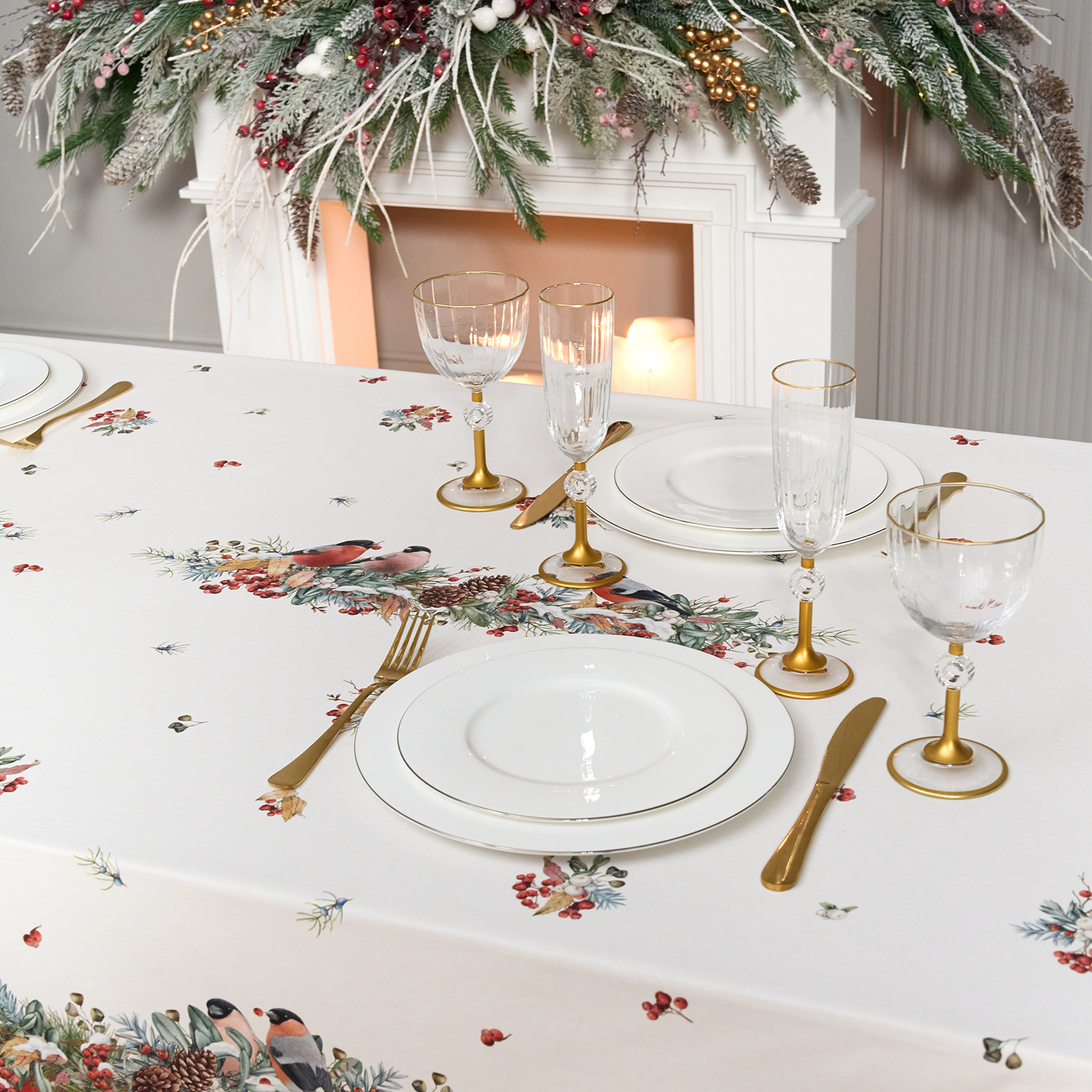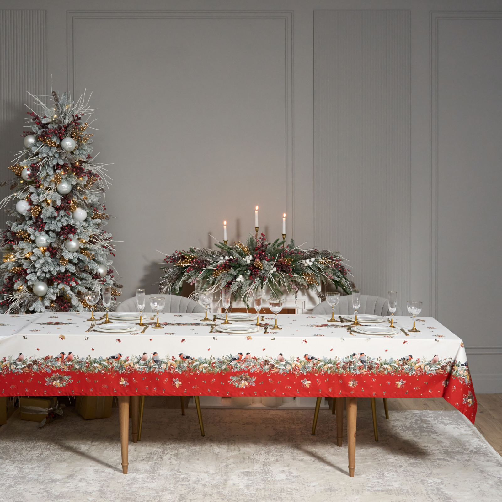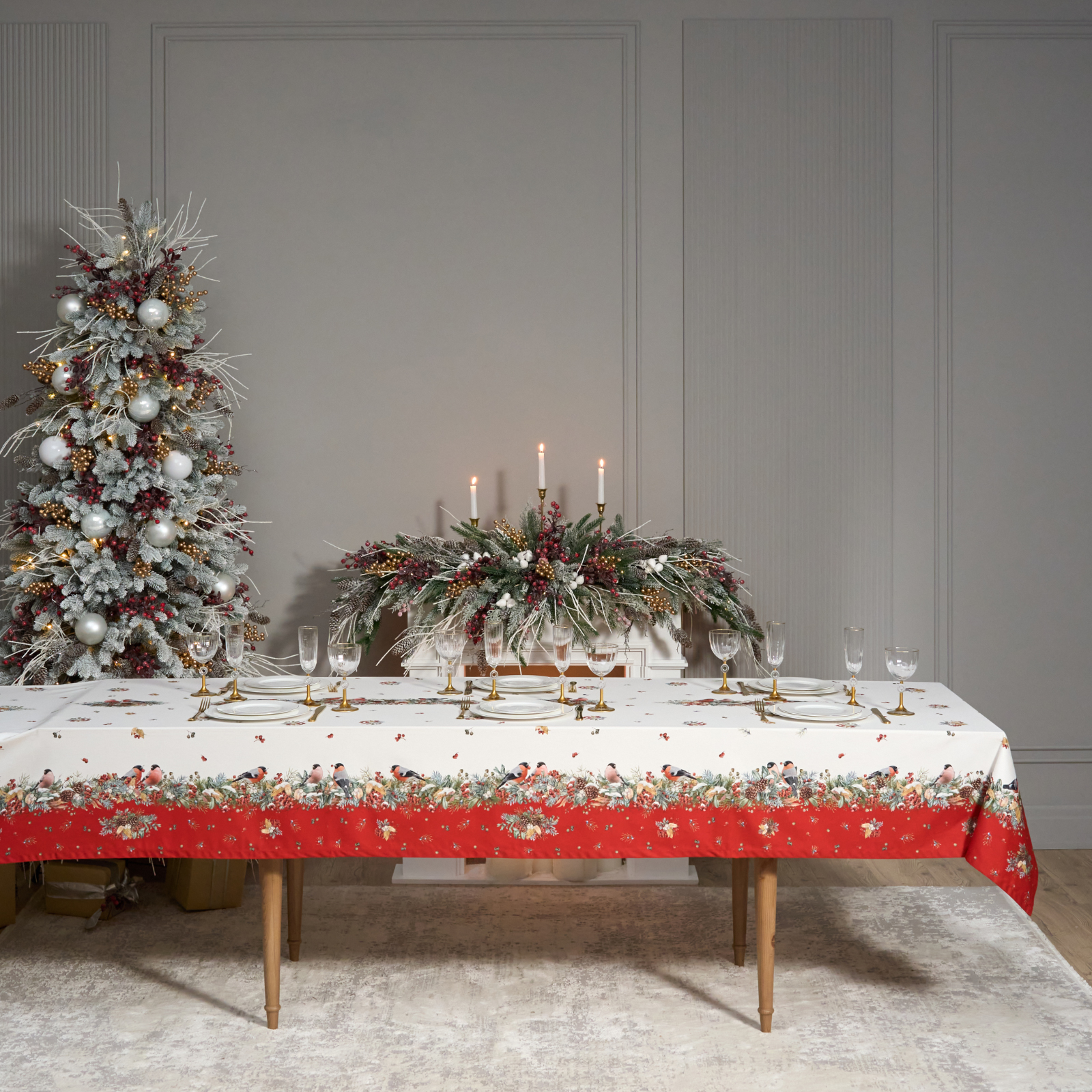 Новогодняя скатерть Lefard из коллекции "Морозко. Снегири" — идеальный акцент для сервировки большого праздничного стола. Яркий зимний принт с лесным пейзажем, еловыми ветками, рябиной и снегирями создаёт атмосферу уюта и тепла. Снегири — символ жизни, стойкости и радости, а рябина с древних времён ассоциируется с благополучием и семейным счастьем. Мы делимся с вами этой символикой — чтобы каждый ужин наполнялся особым смыслом.