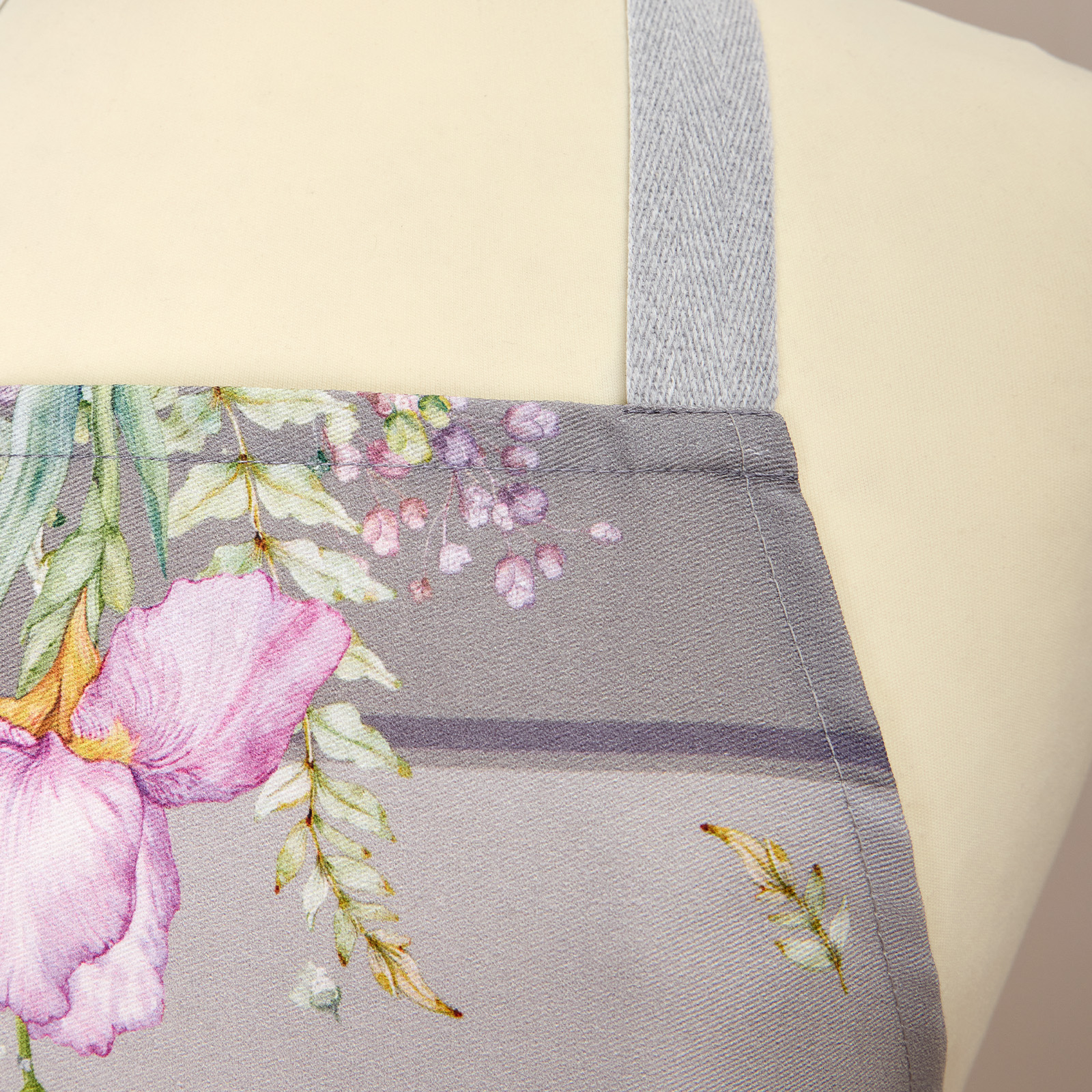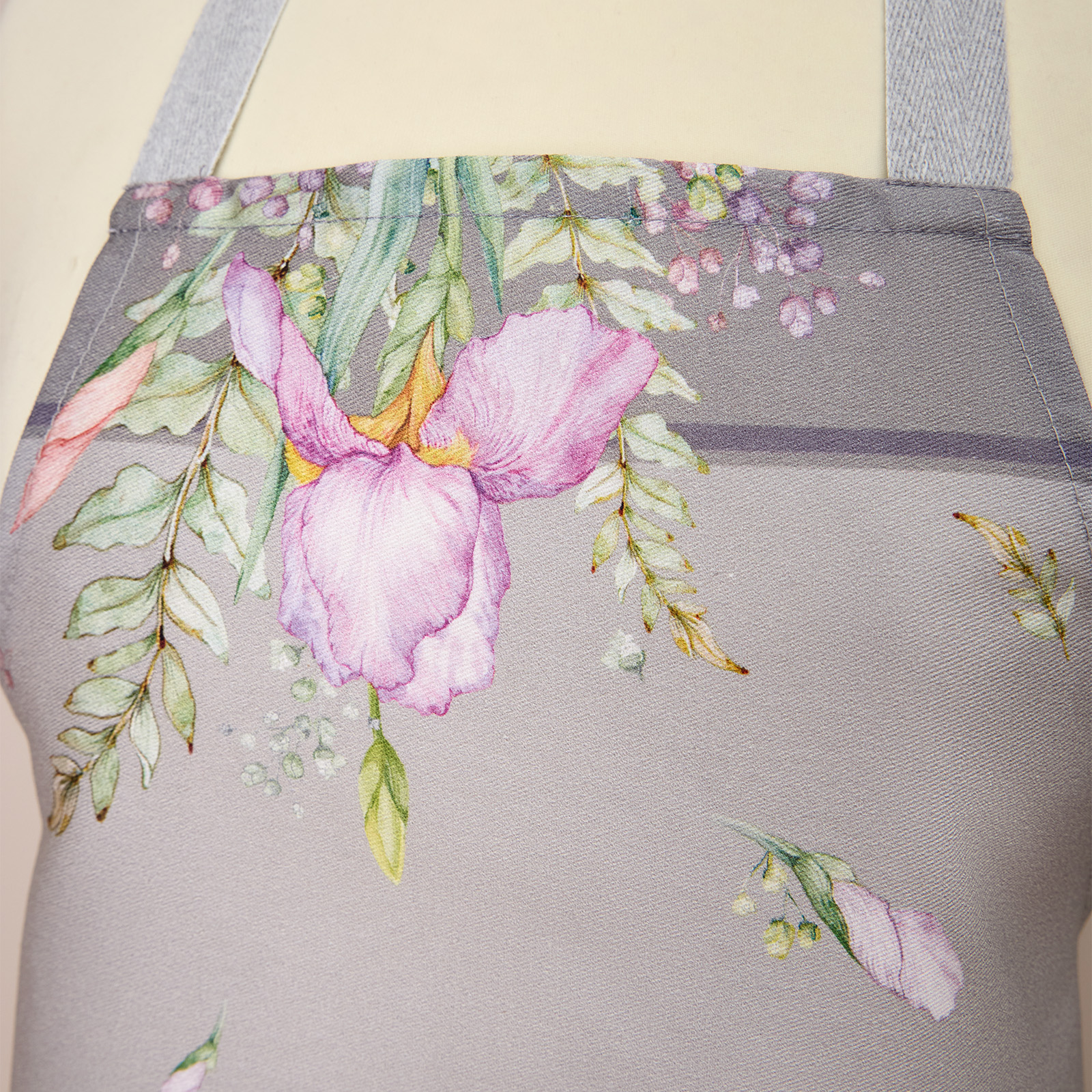 Размер изделия — 70×60 см, что обеспечивает оптимальное покрытие и свободу движений. Женский фартук для кухни водоотталкивающий дополнен стильным принтом с ирисами, который подчёркивает вкус хозяйки. Рисунок нанесён методом цифровой печати и не выцветает даже после многократных стирок.