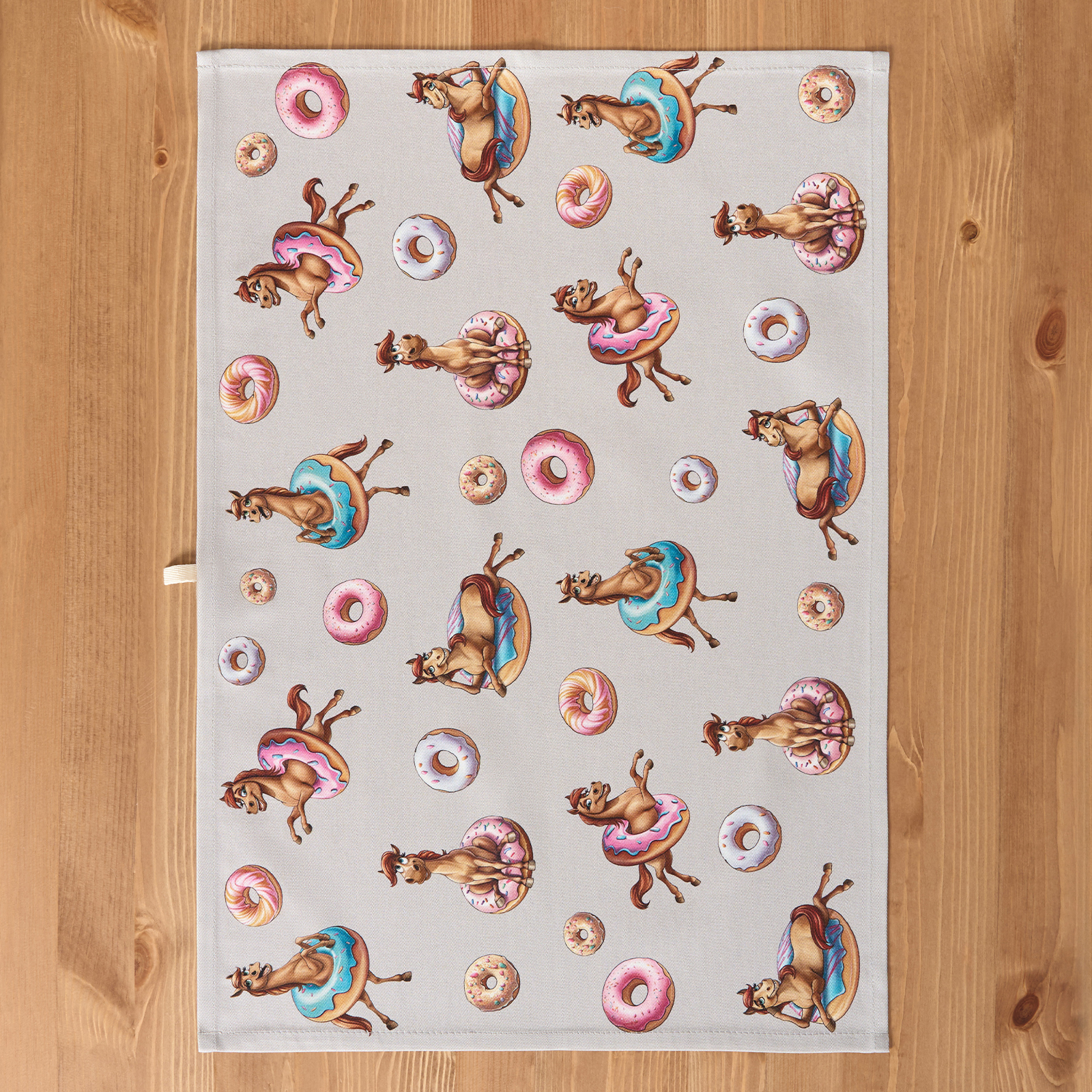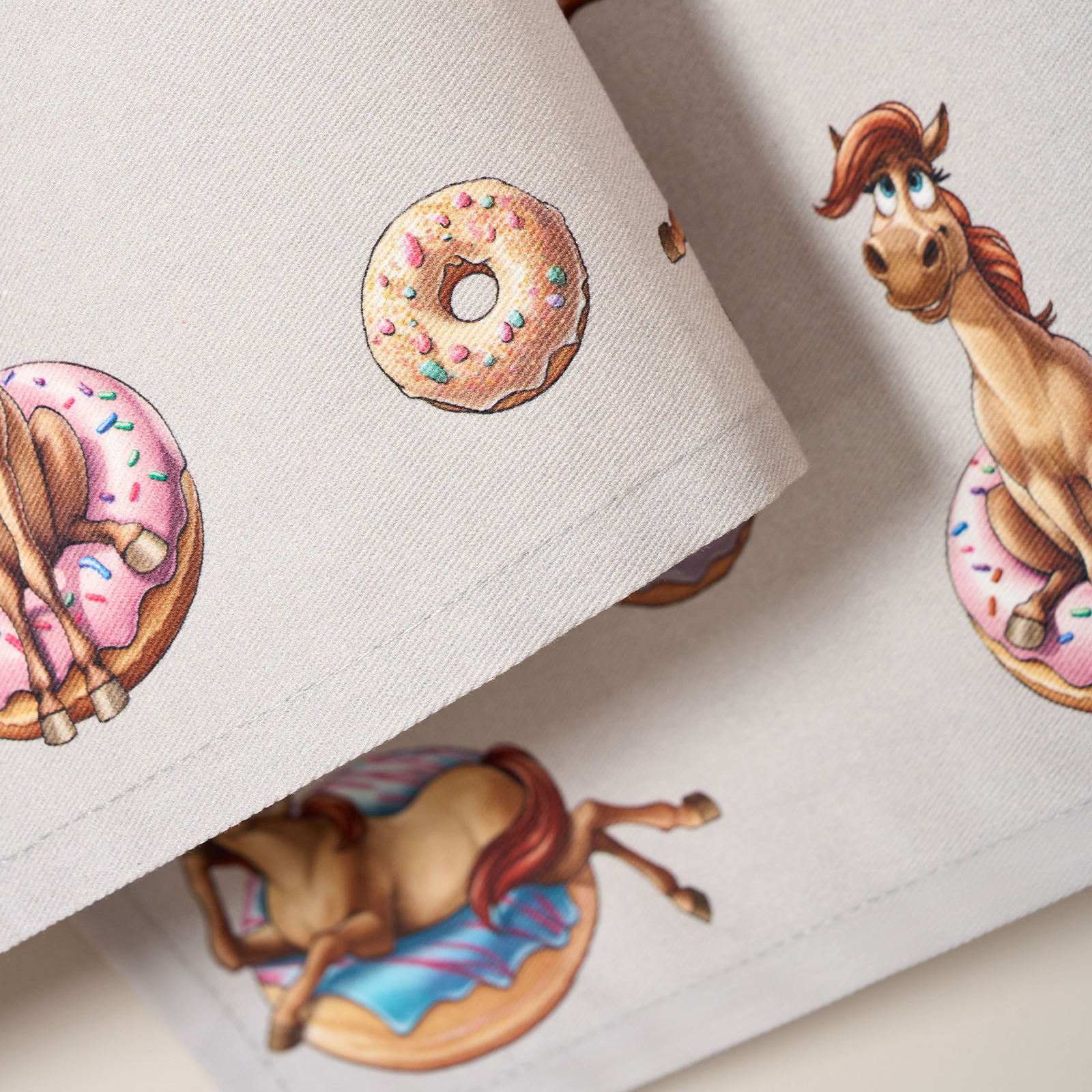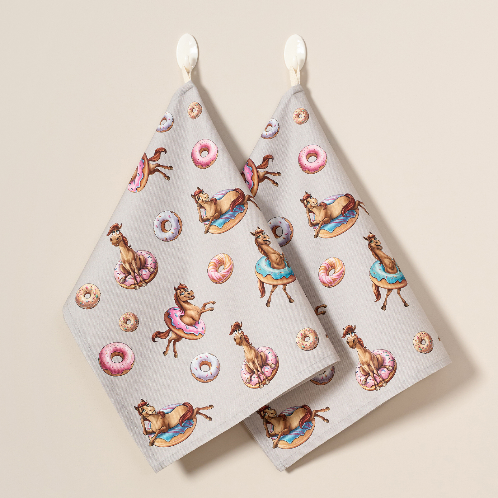 Прикольный принт с лошадками и пончиками поднимет настроение взрослым и детям, добавит уюта и праздничной атмосферы. Такие полотенца можно подарить подруге, маме, бабушке или ребёнку — как прикольный символ года, а также использовать для сервировки или как необычный новогодний сувенир.