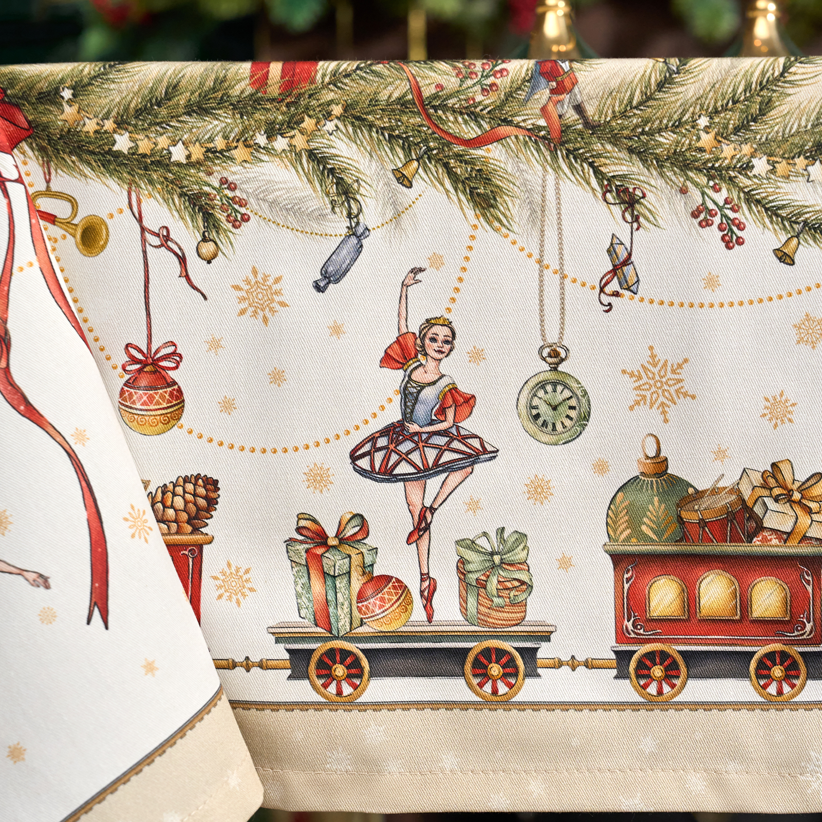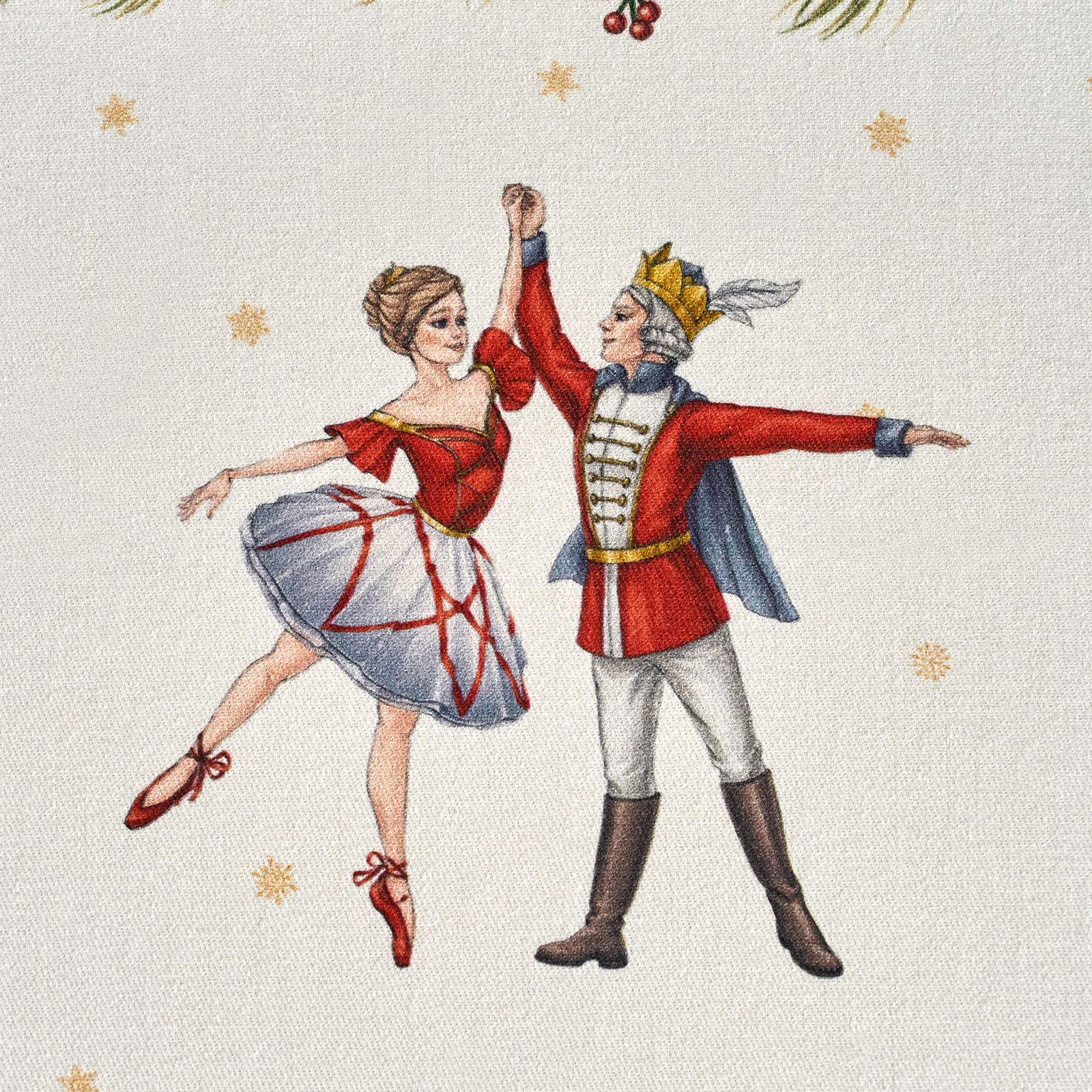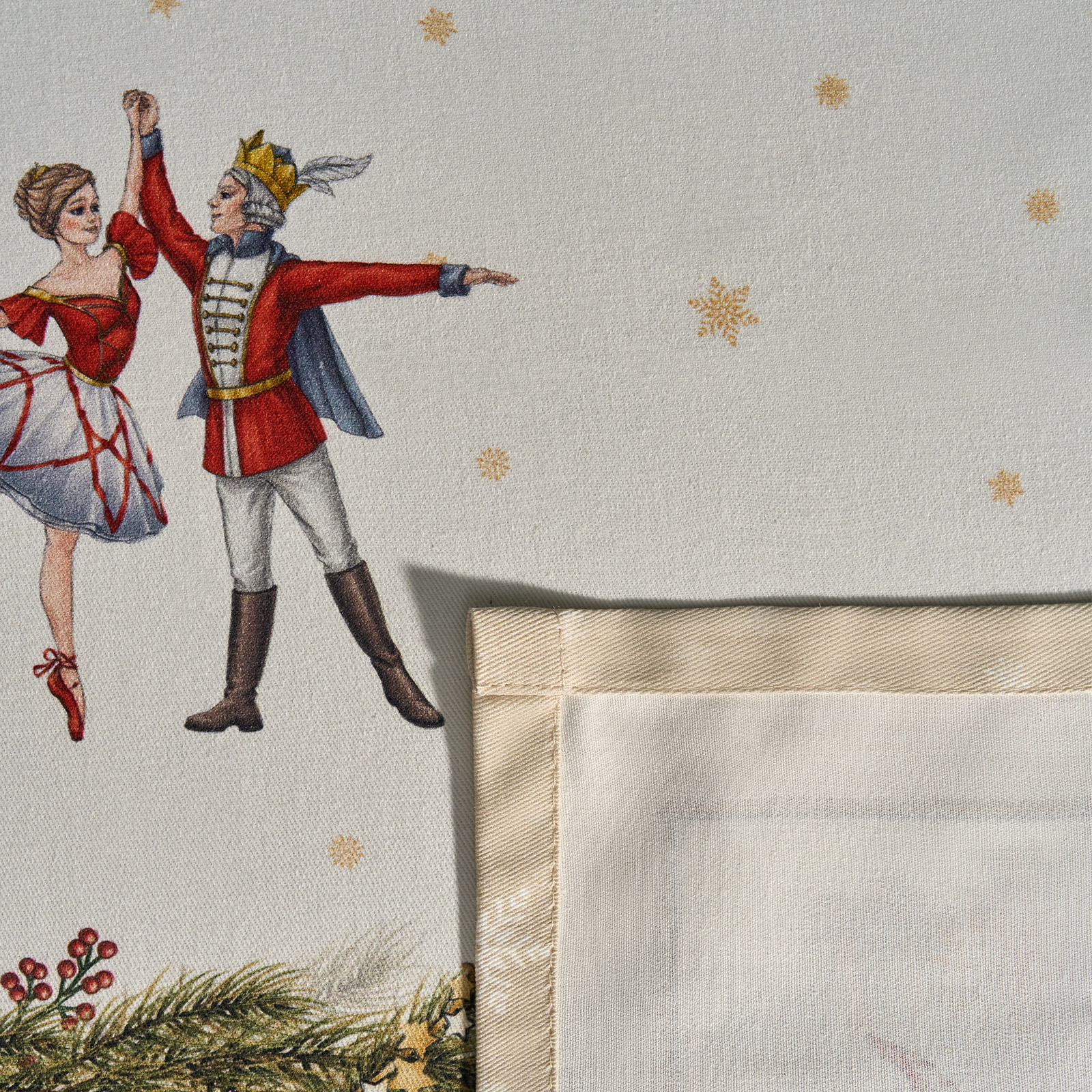 Созданная по эксклюзивному дизайну, она передаёт волшебство рождественской сказки: на ткани словно оживают сцены из любимого балета — яркие игрушки, подарки, веточки ели и персонажи, воплощающие дух праздника.