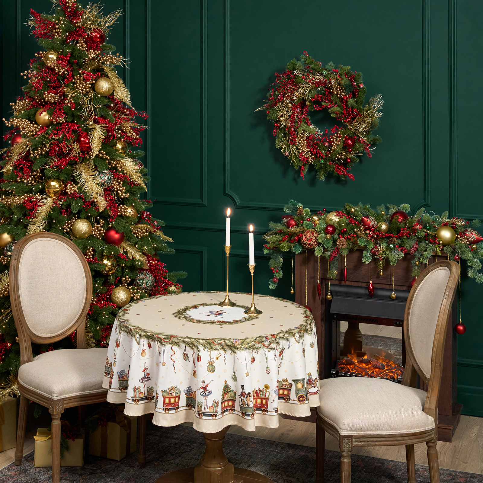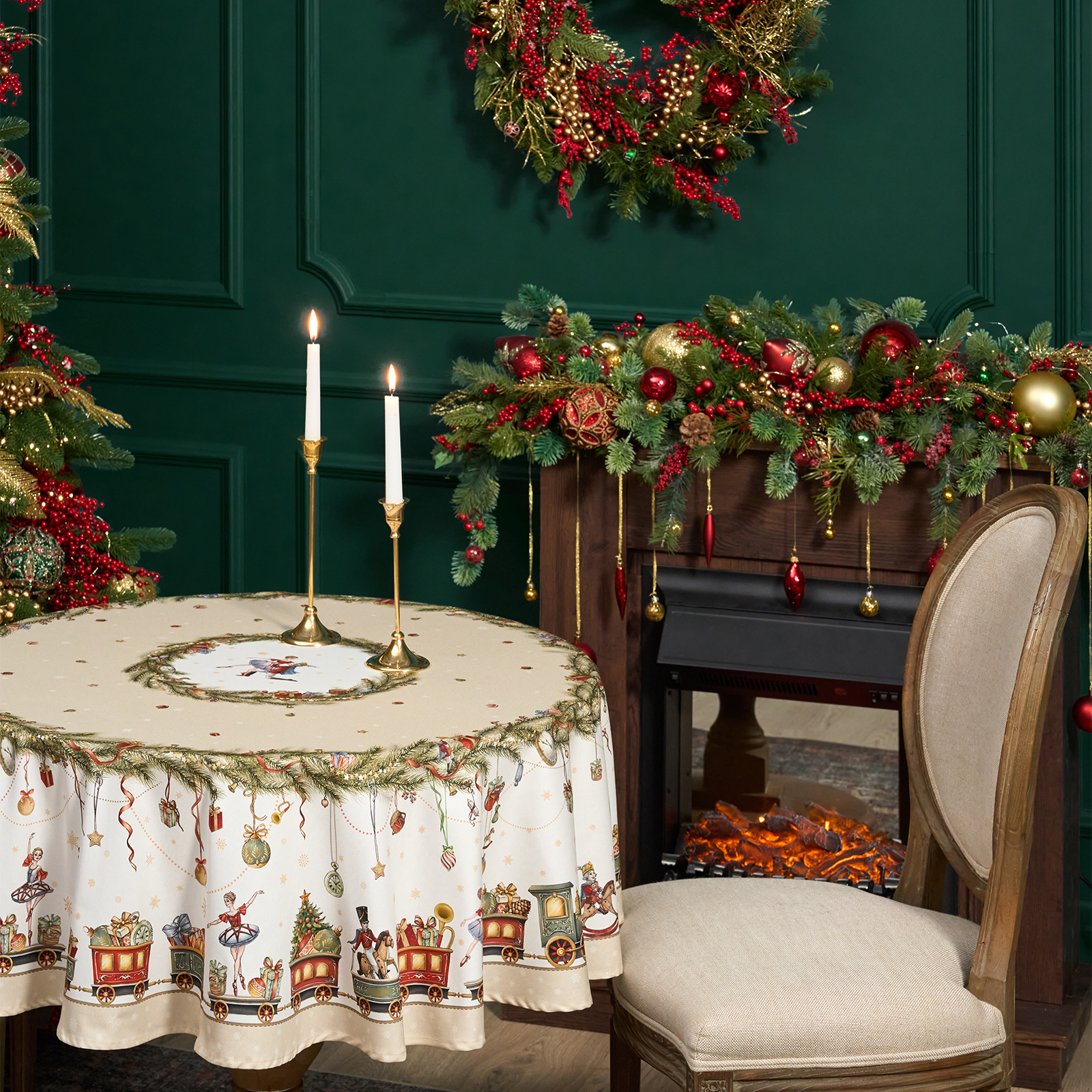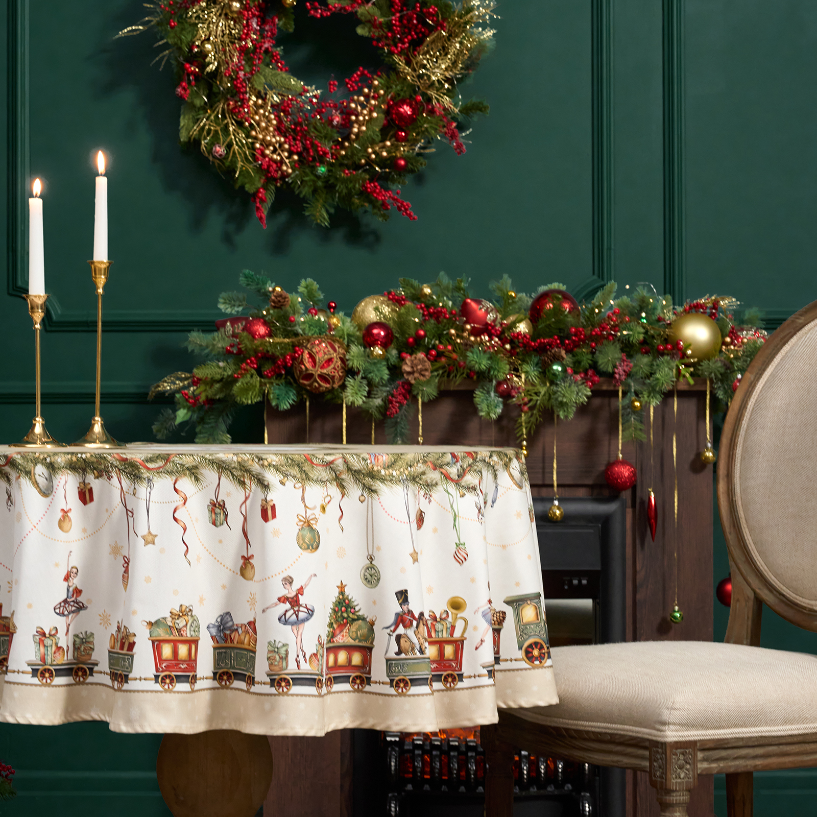 Круглая новогодняя скатерть Lefard «Щелкунчик» диаметр 150 см — элегантное украшение стола и элемент рождественского декора дома. Подходит для круглых столов диаметром 70–100 см, создавая аккуратный равномерный свес.