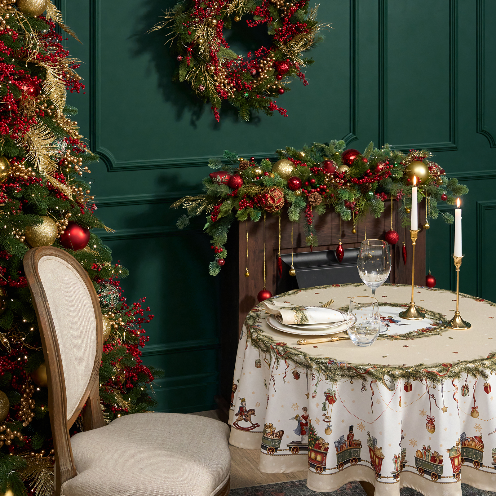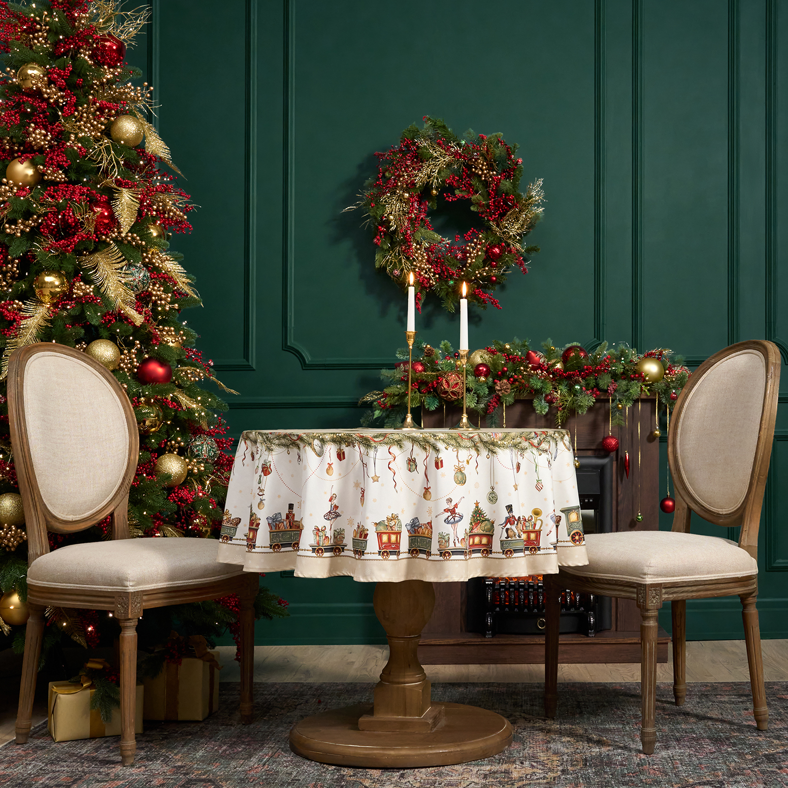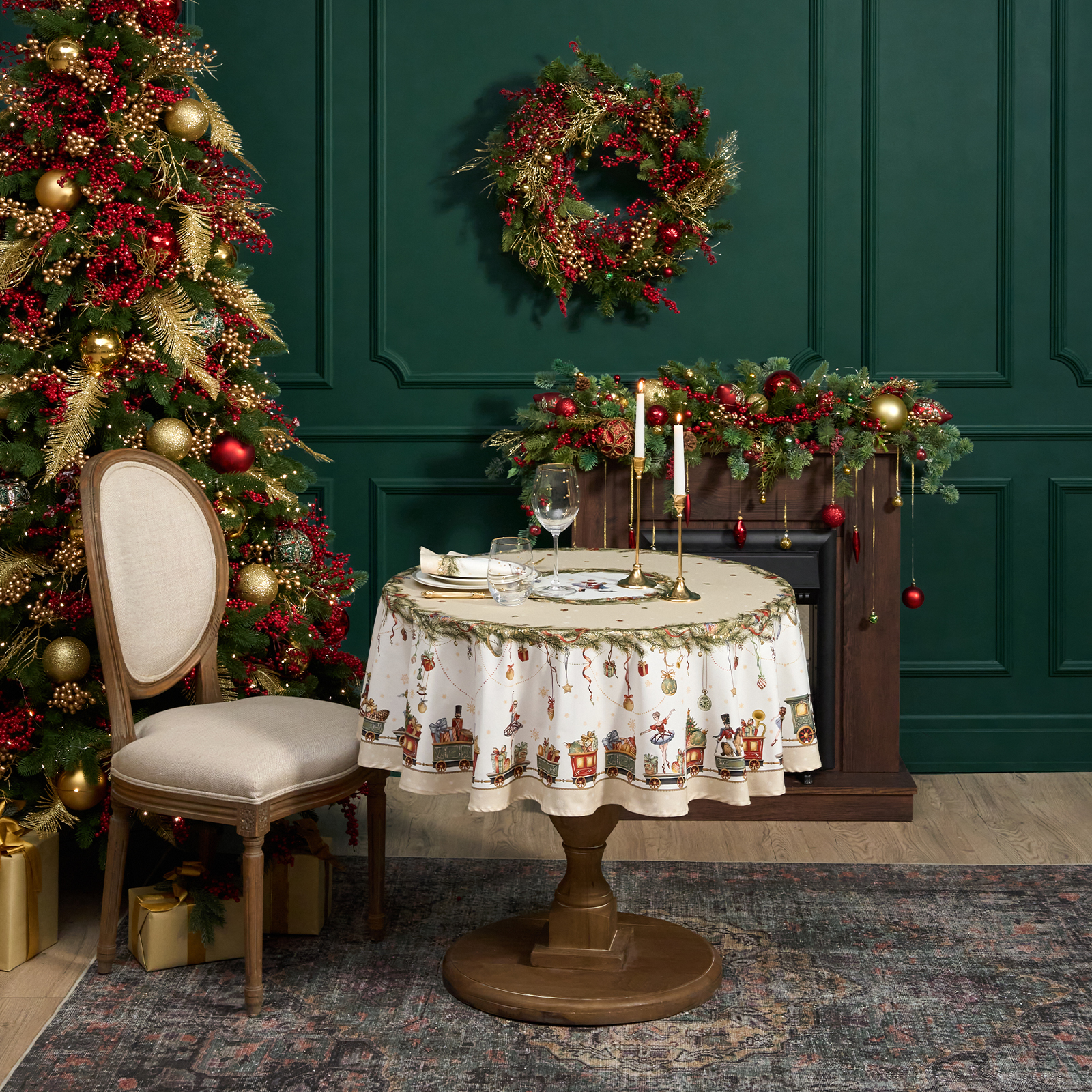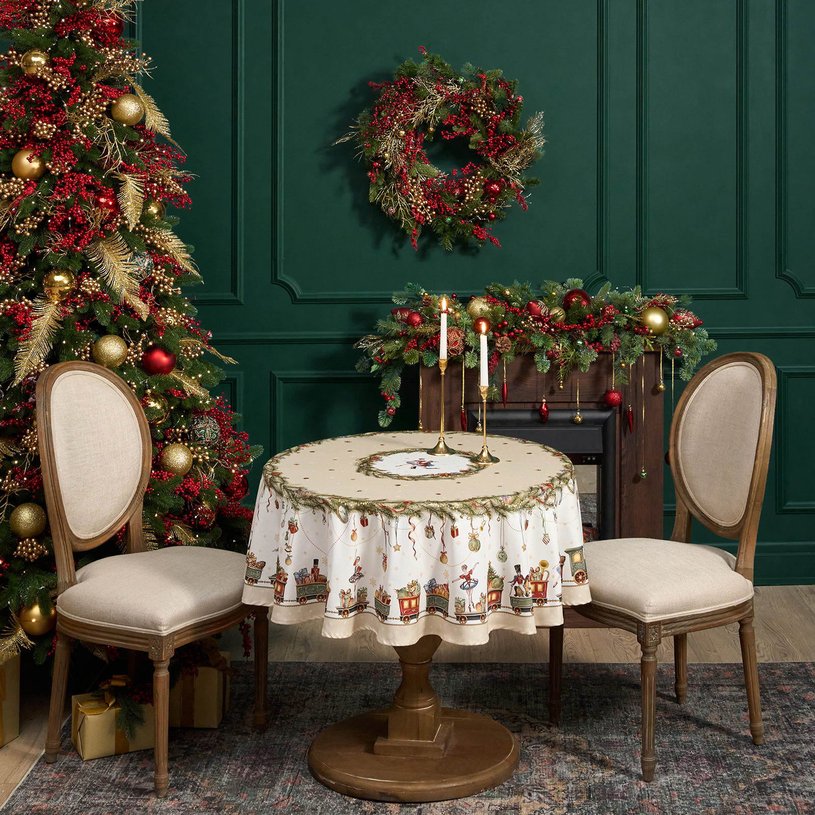 Круглая новогодняя скатерть Lefard «Щелкунчик» диаметр 150 см — элегантное украшение стола и элемент рождественского декора дома. Подходит для круглых столов диаметром 70–100 см, создавая аккуратный равномерный свес.