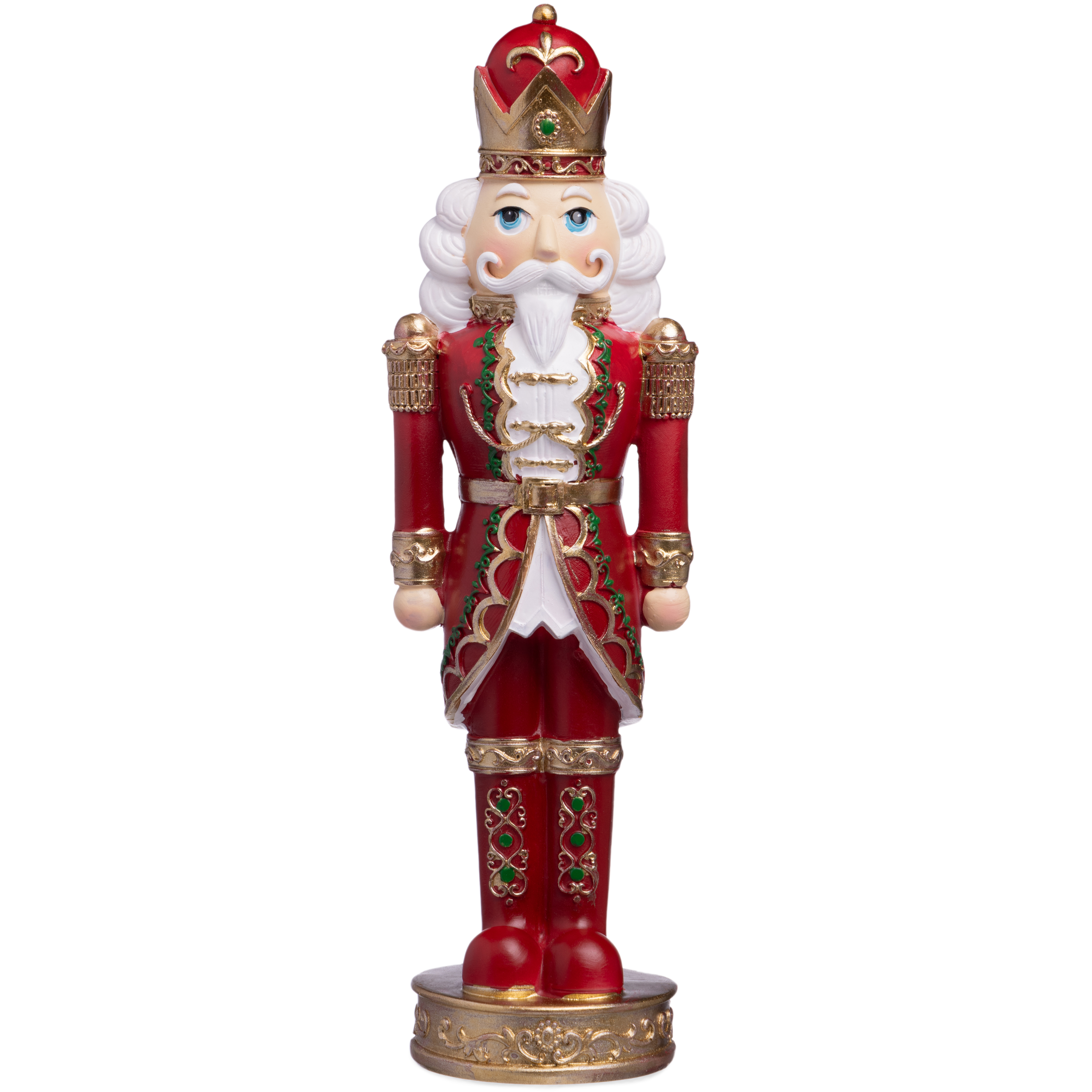 Яркий, торжественный, с короной и пышными золотыми узорами — этот Щелкунчик не просто статуэтка, а настоящий герой новогодней сказки. Изготовлен из прочного полистоуна: лёгкий, но выразительный, с глубоким красным цветом, белым мехом и золотыми деталями, словно сошедшими с рождественской открытки.